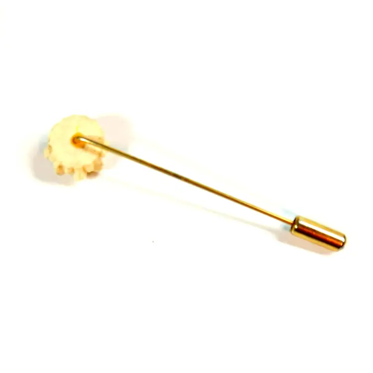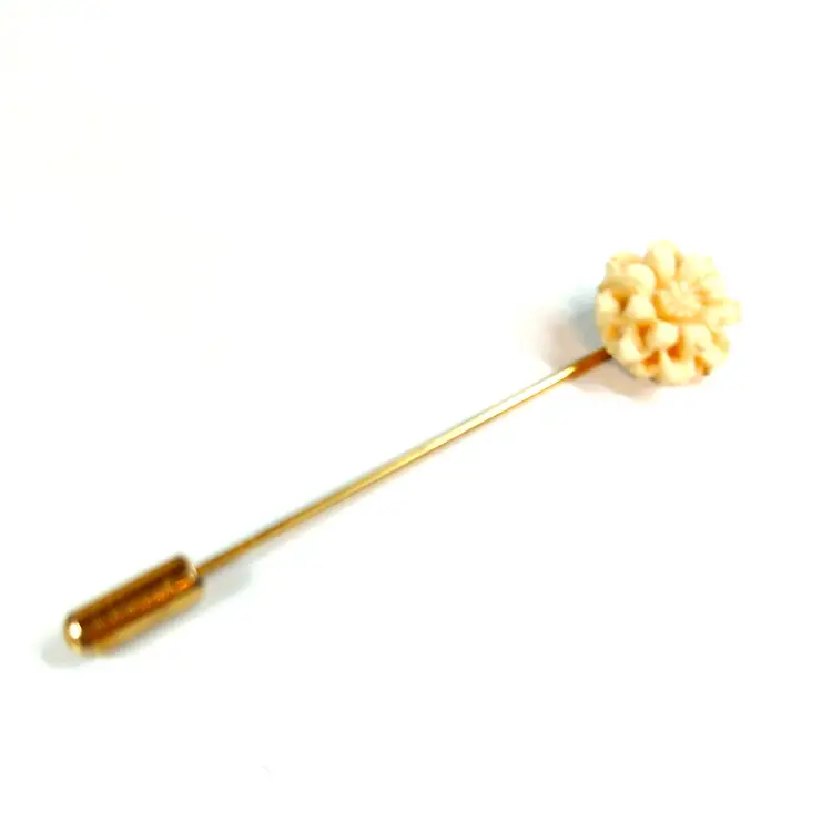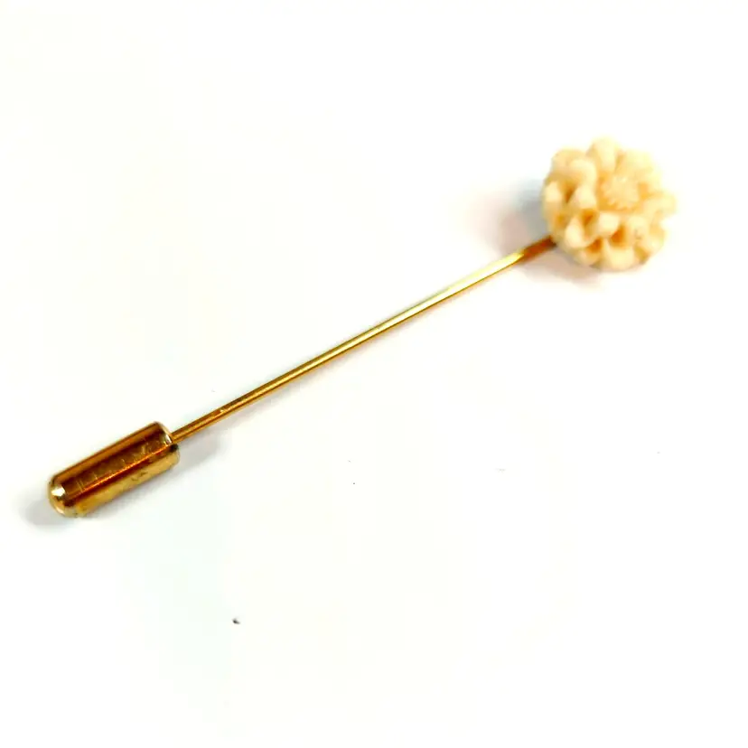 Vintage Cream Marigold Carved Flower Gold Tone Stick Pin. Condition is preowned. Elegant vintage gold tone stick pin featuring a delicately carved cream flower. Ideal for adding a touch of sophistication to formal attire. (FC03)