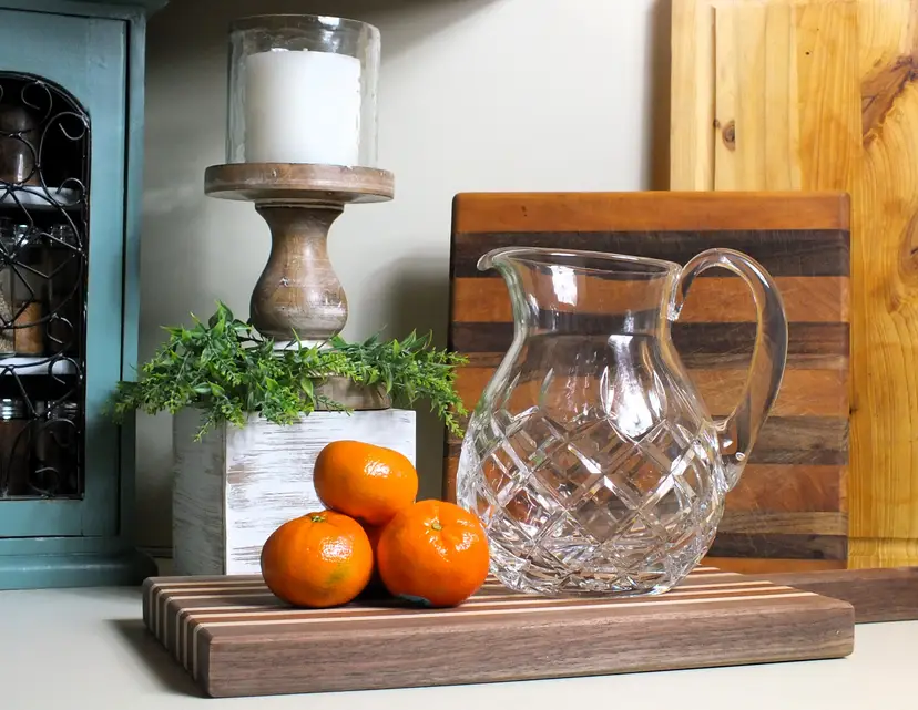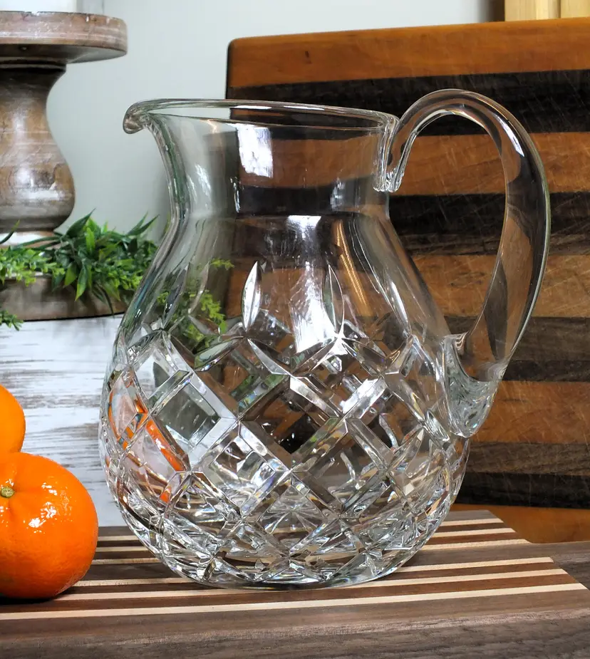 This beautiful vintage crystal glass pitcher will make an exquisite addition to your breakfast table. Just imagine it filled with fresh-squeezed orange juice next to a stack of homemade pancakes or ice-cold lemonade on a summer day! Or that perfect Sangria for your next dinner party...or even holding a colorful bouquet of fresh cut flowers! This gorgeous crystal pitcher measures approximately 7" x 7.25" x 4".