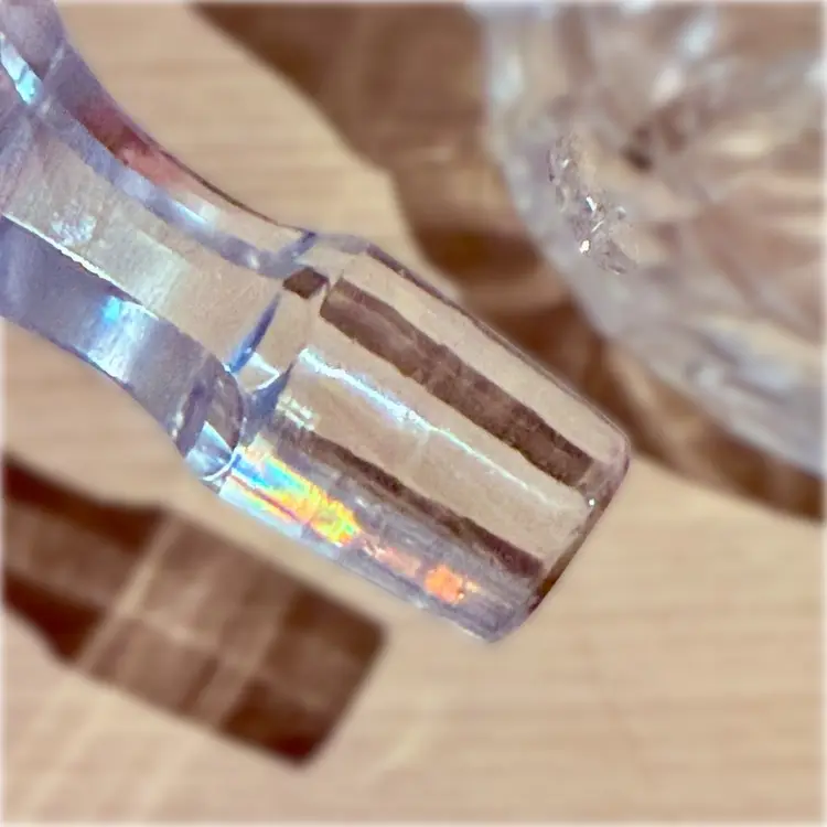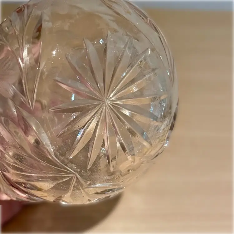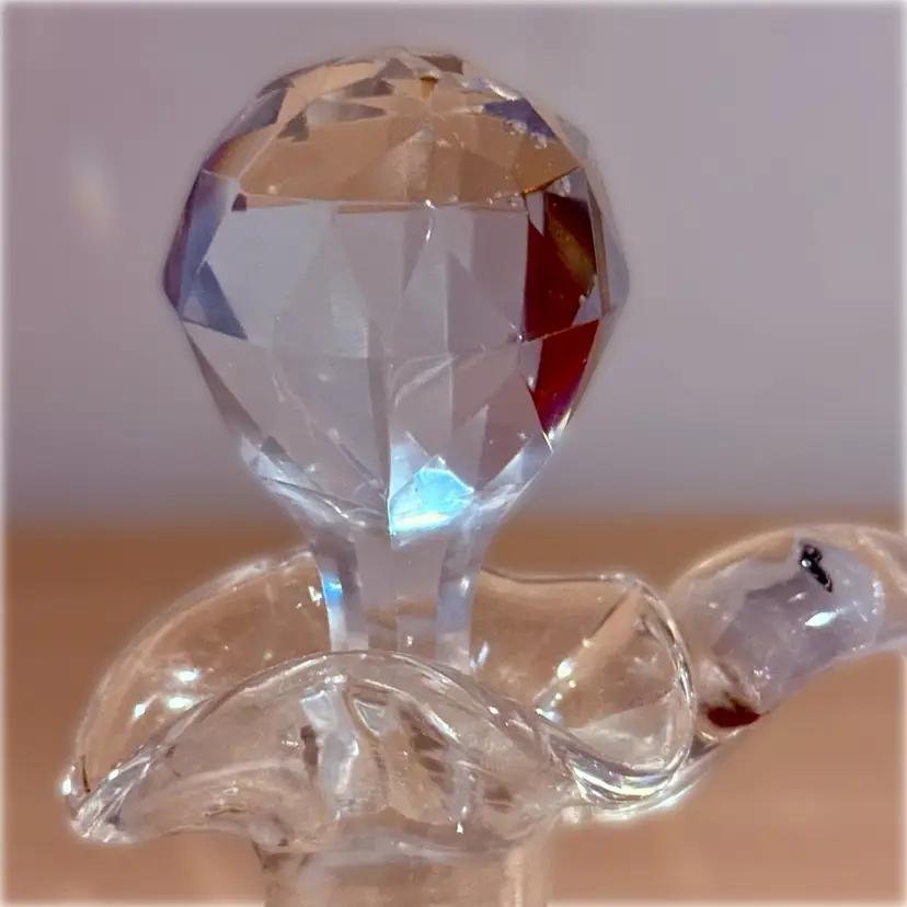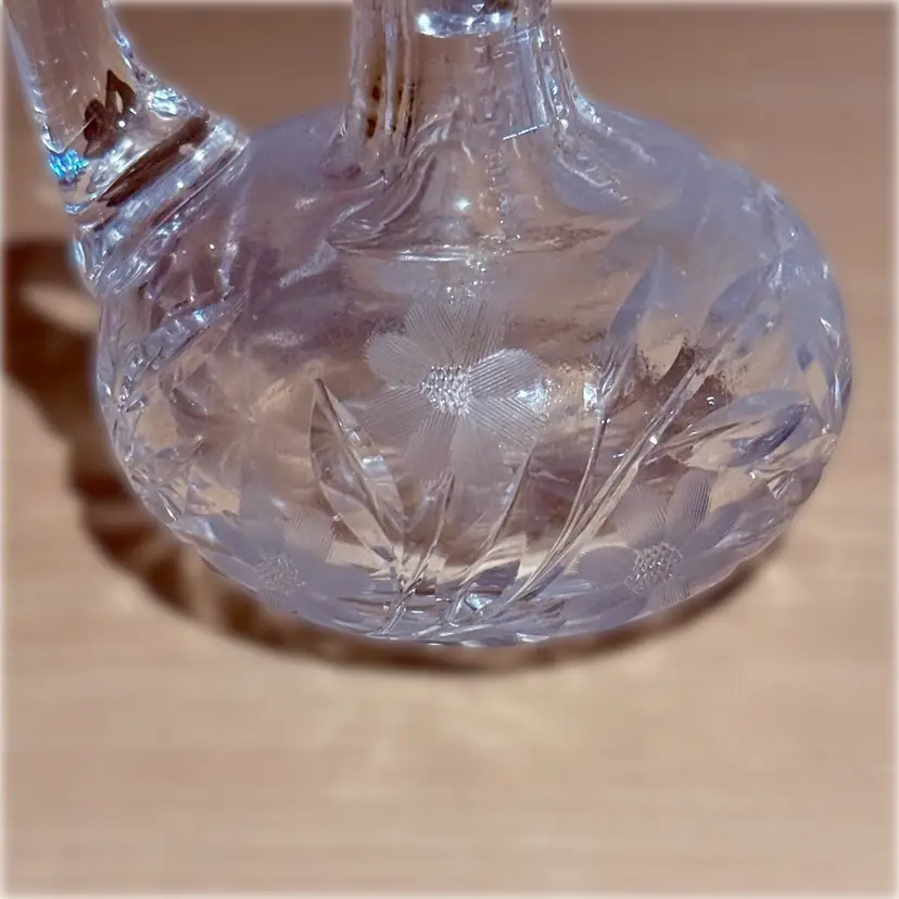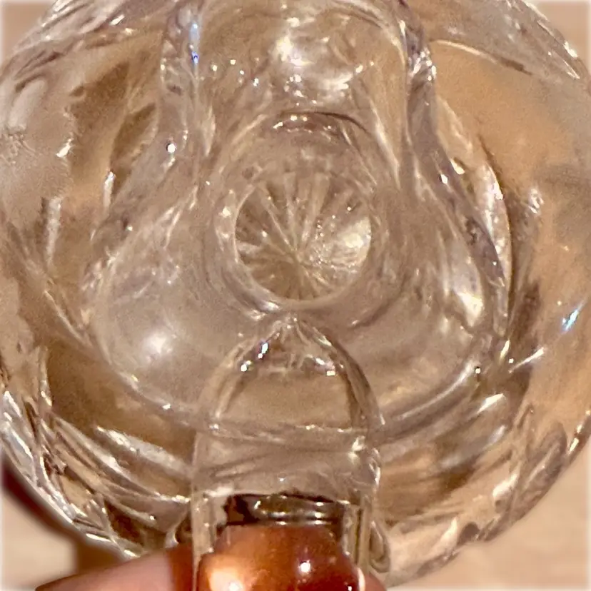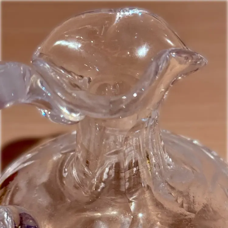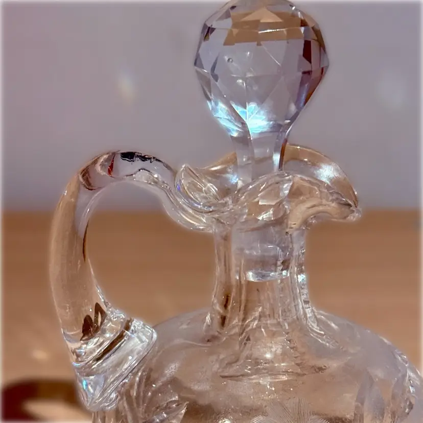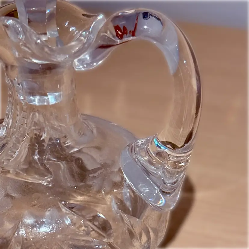 Approx 6” tall to top of stopper x 4” across at handle x 3.5” wide; very good condition; no issues.