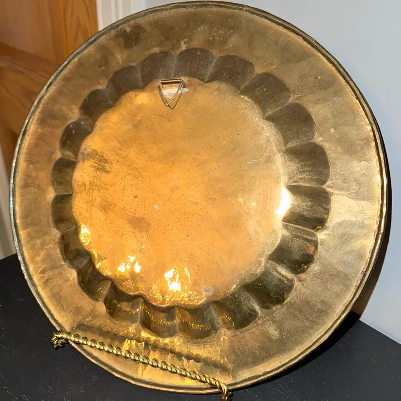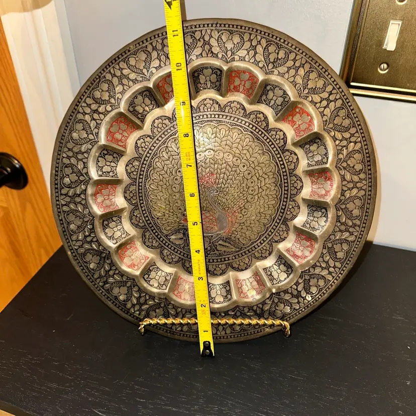 Beautiful vintage decorative brass plate with a peacock design. The patina is just right and you can still see the pretty colors with the brass.