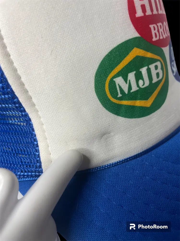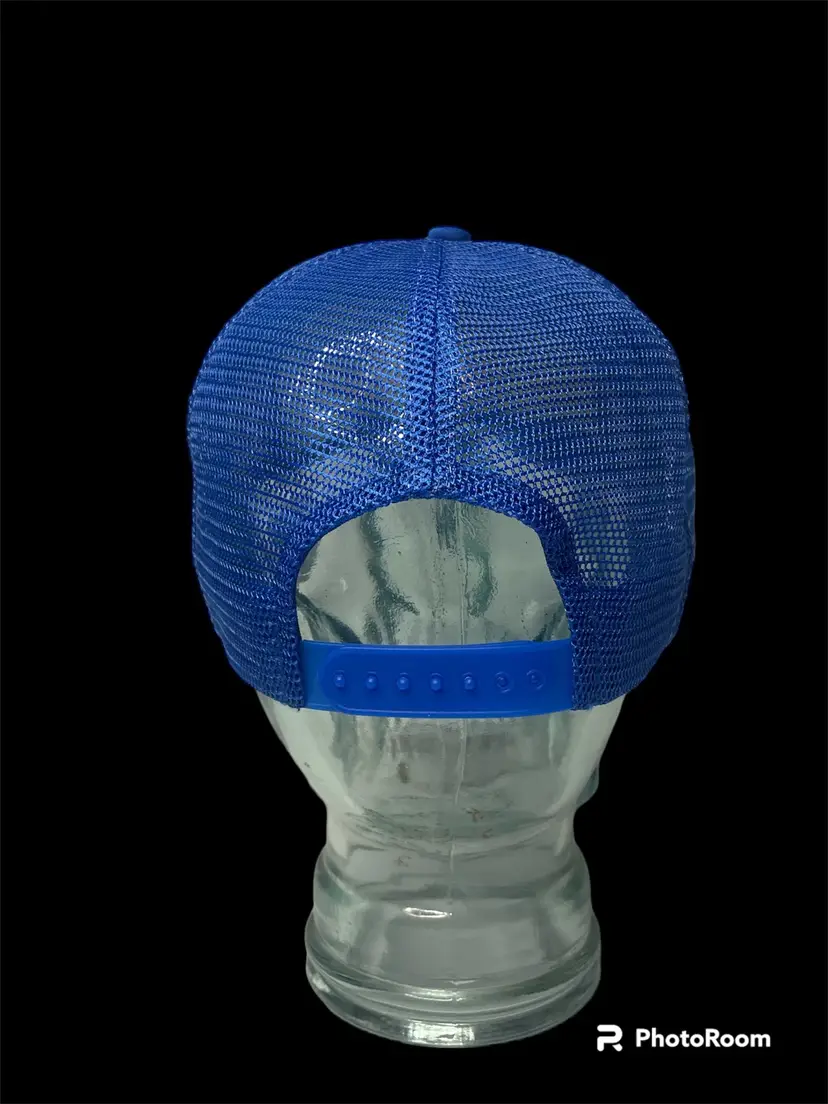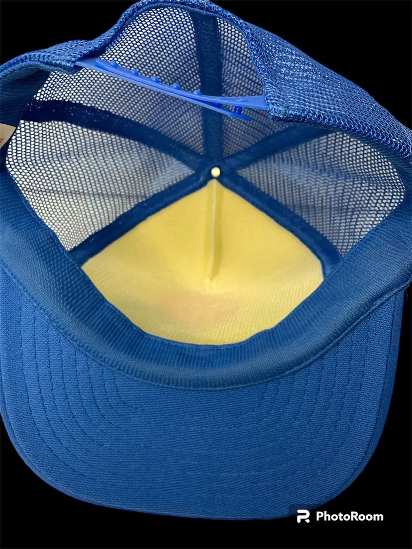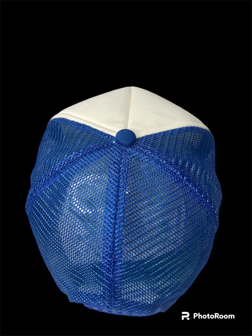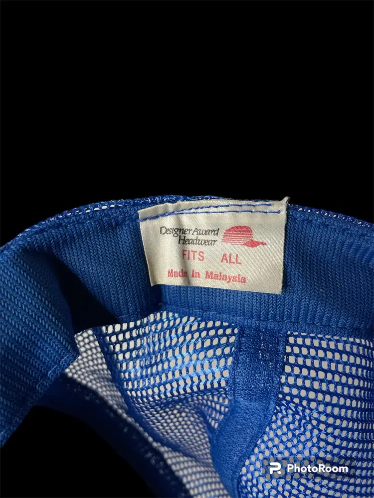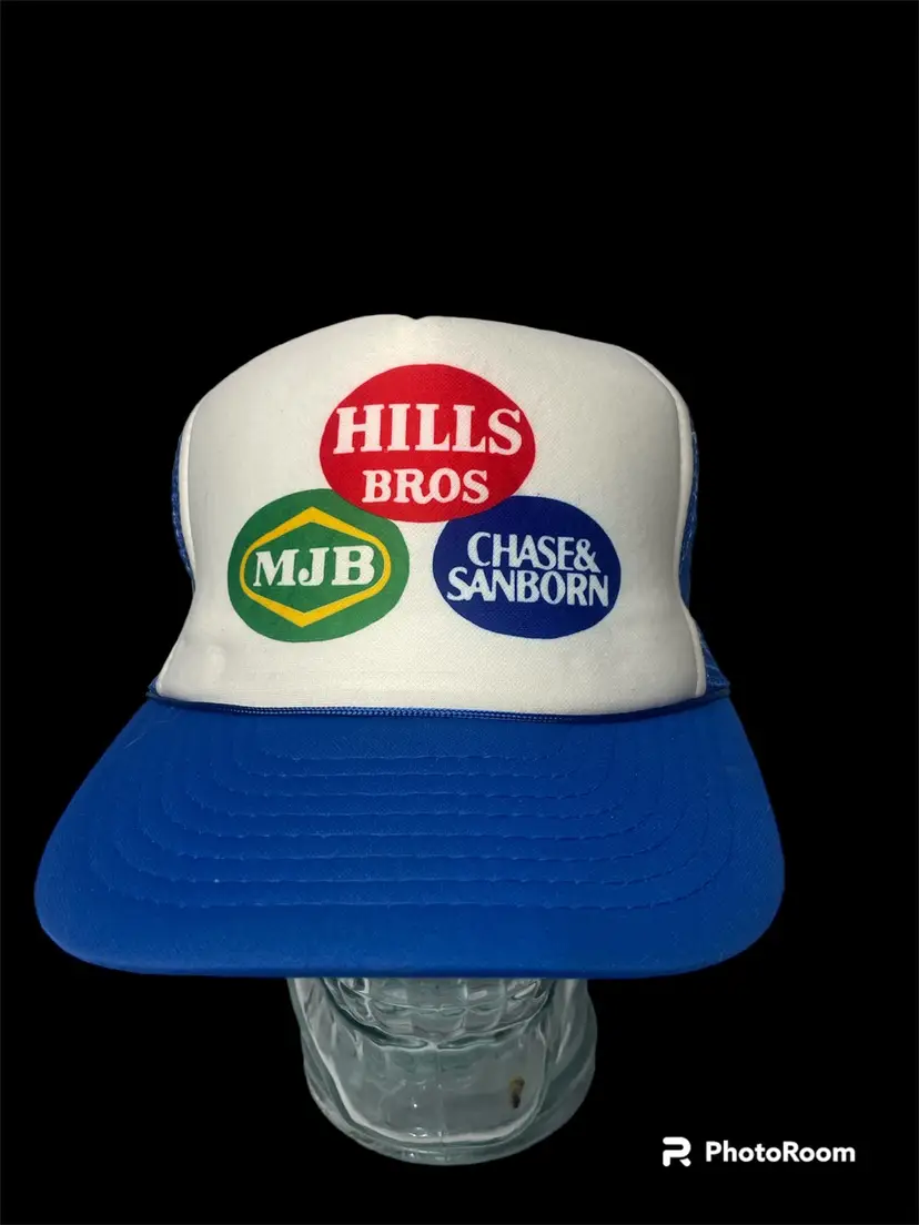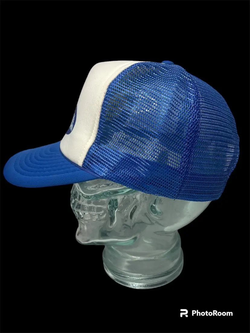 Vintage Designer Award Cap Foam Snapback Trucker Mesh Hat Coffee Brand Logo on Front of Hat also Rope Around Bill Blue & White Pre-Owned Condition