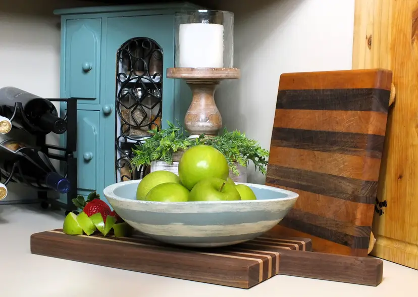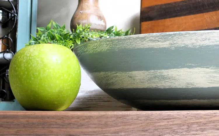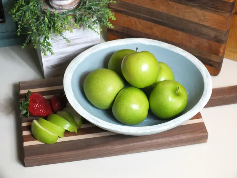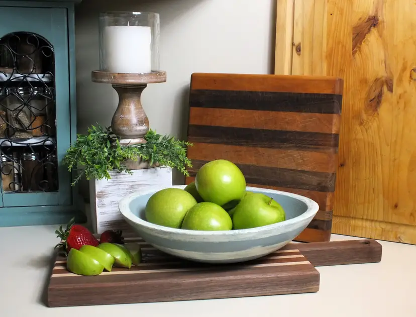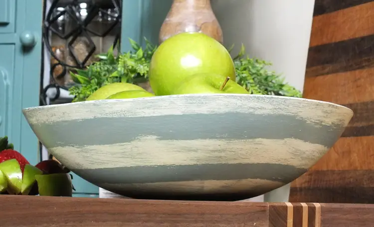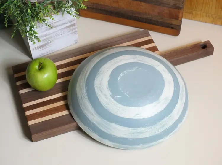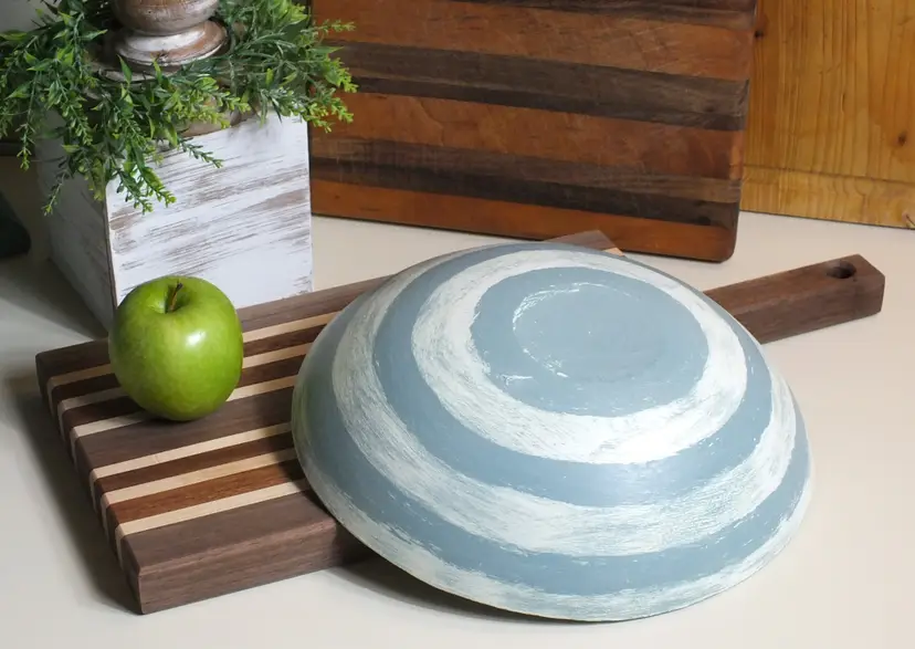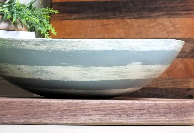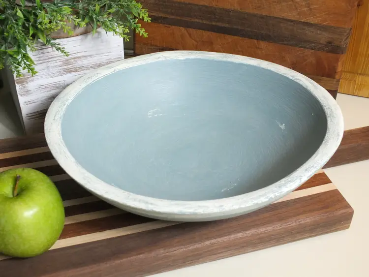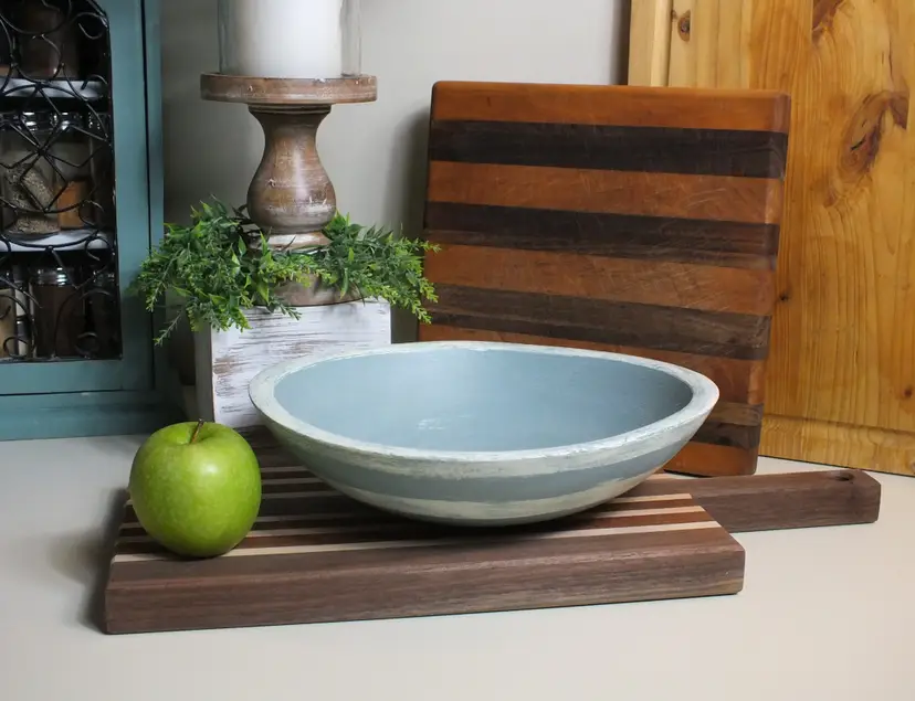 A beautiful vintage wooden dough bowl painted in an adorable distressed duck egg blue and creamy white stripe design on the outside and a solid duck egg blue on the inside. This has been sealed with a white wax, adding to its cute cottage flair. The piece would be excellent as a fruit/vegetable bowl, a centerpiece bowl holding flowers, moss balls, filler, seashells, etc. or as a decor piece to be used anywhere in the house. I could see it used as a catch-all bowl for keys, wallets, loose change; a towel bowl--holding small hand towels or washcloths set beside the sink; or a bowl for various toiletries or hair supplies...the possibilities are endless! This piece measures approximately 10 1/8" x 11 1/4" x 2 7/8".
