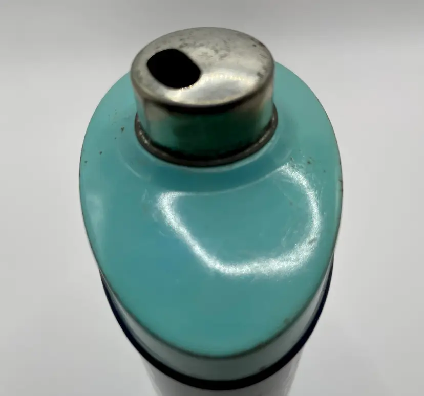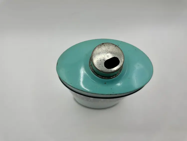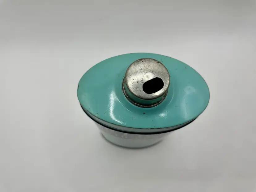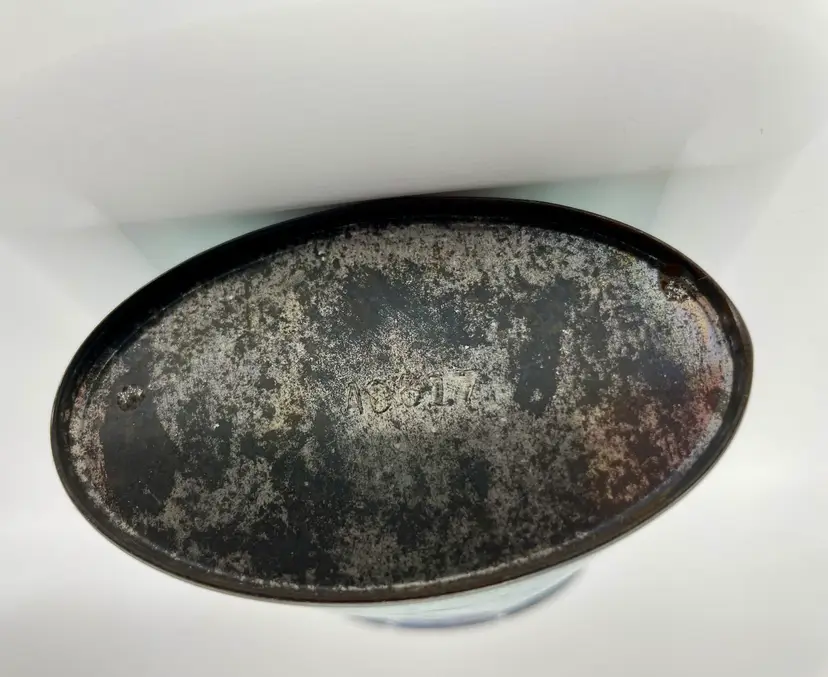 This is the large 10 ounce, not the sample size. Some discoloration, paint loss & one side is a little misshapen. I believe the bottom reads A0617