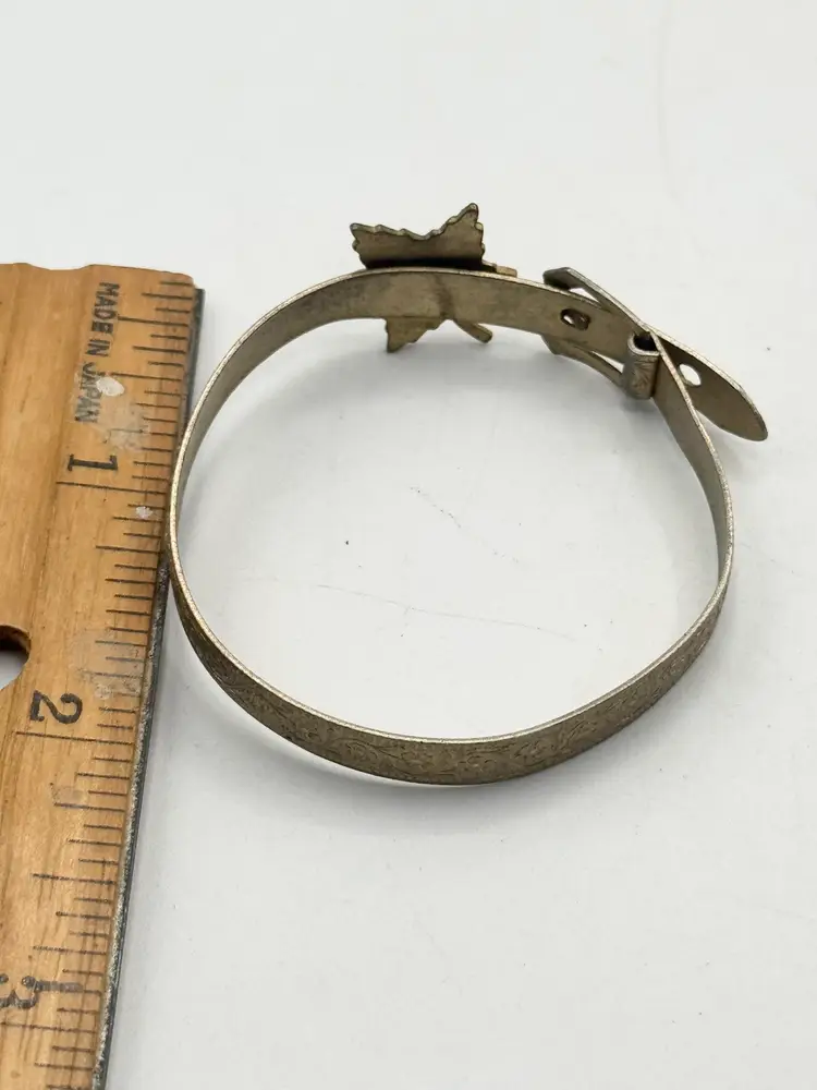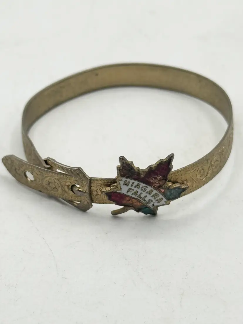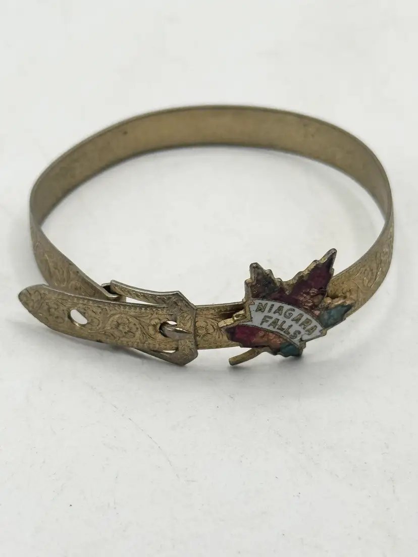 Vintage estate Niagara Falls Enamel Maple Leaf Buckle Bangle Bracelet. Souvenir travel bracelet. Enamel maple leaf with enamel design. Reads Niagara Falls. Buckle bangle design. Opens and closes like a buckle. Vintage bracelet. MN54GH.