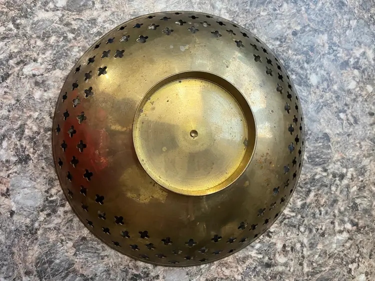 This particular style of pierced and etched brass dish is commonly associated with India, often produced as decorative items for export or for local use. The floral and geometric patterns are characteristic of traditional Indian artistry, and the reticulated (pierced) rim adds an element of lightness and visual interest. Such pieces were popular during the mid-20th century as decorative accents in homes.