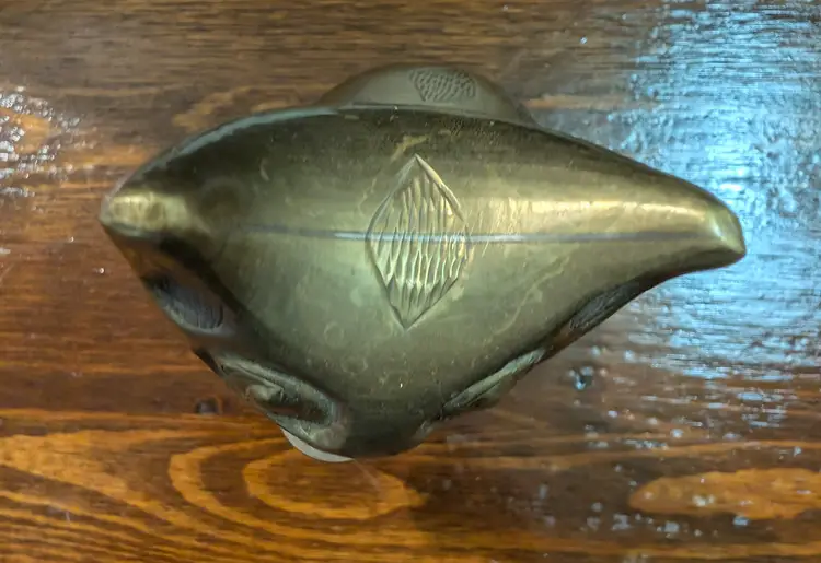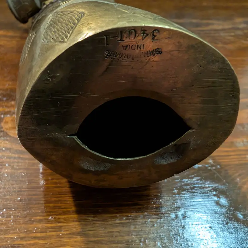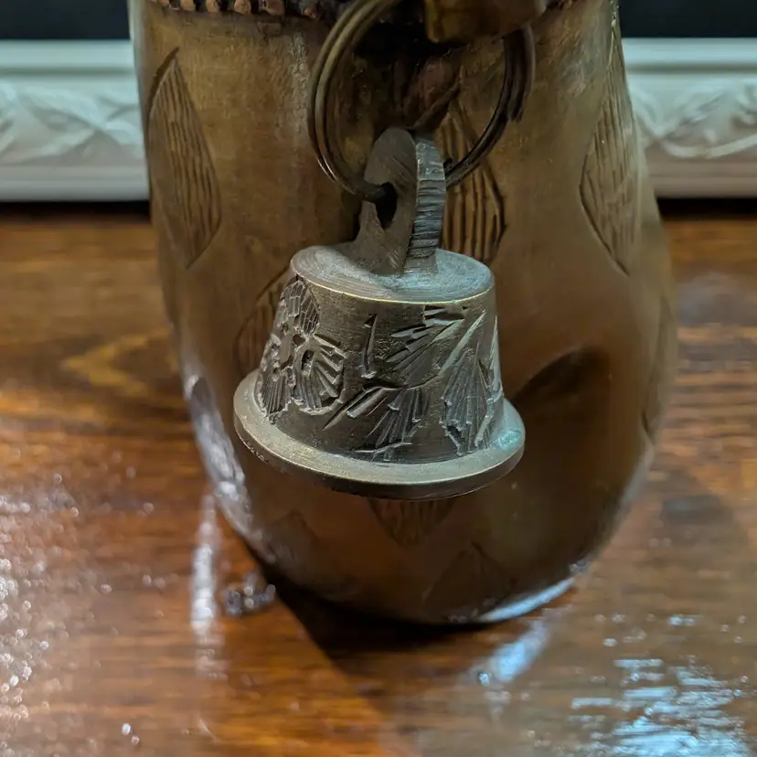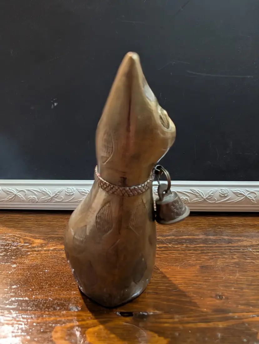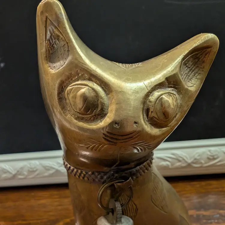 Vintage etched design brass cat with bell collar figurine made in India. Very cute brass cat figurine that is used but an excellent condition with no scratches, scuffs or breaks. Cat has a feathered etch design pattern all over with etched mouth and eyes and ears and is wearing a textured collar with a working bell on it. Figurine is approximately 5.5 inches height with a 3 inch length and 2 inch width. Perfect collectible piece for any cat, lover and brass collectors.