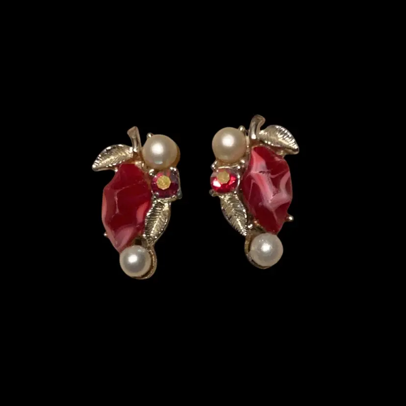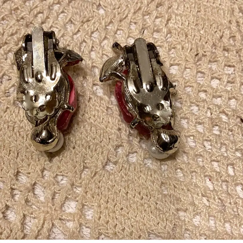 Vintage Redstone and faux, pearl silver toed clip on earrings. They are not signed.