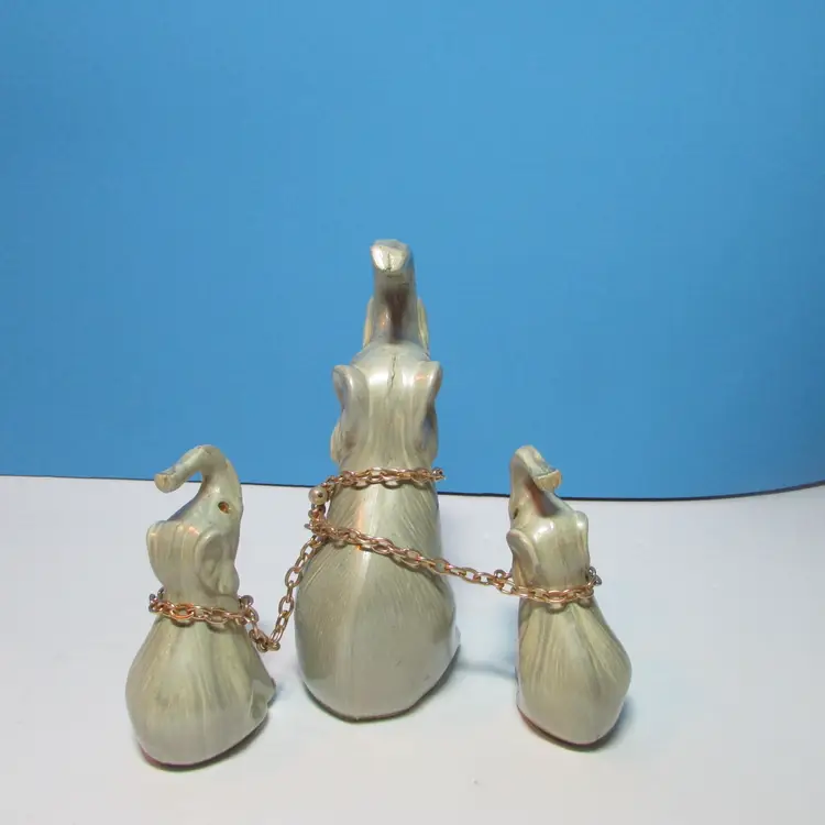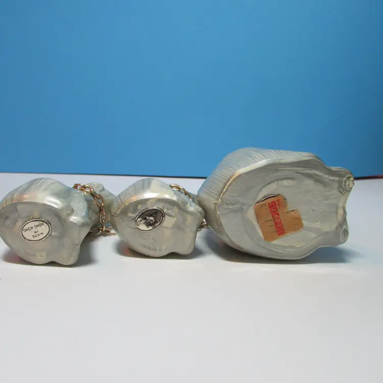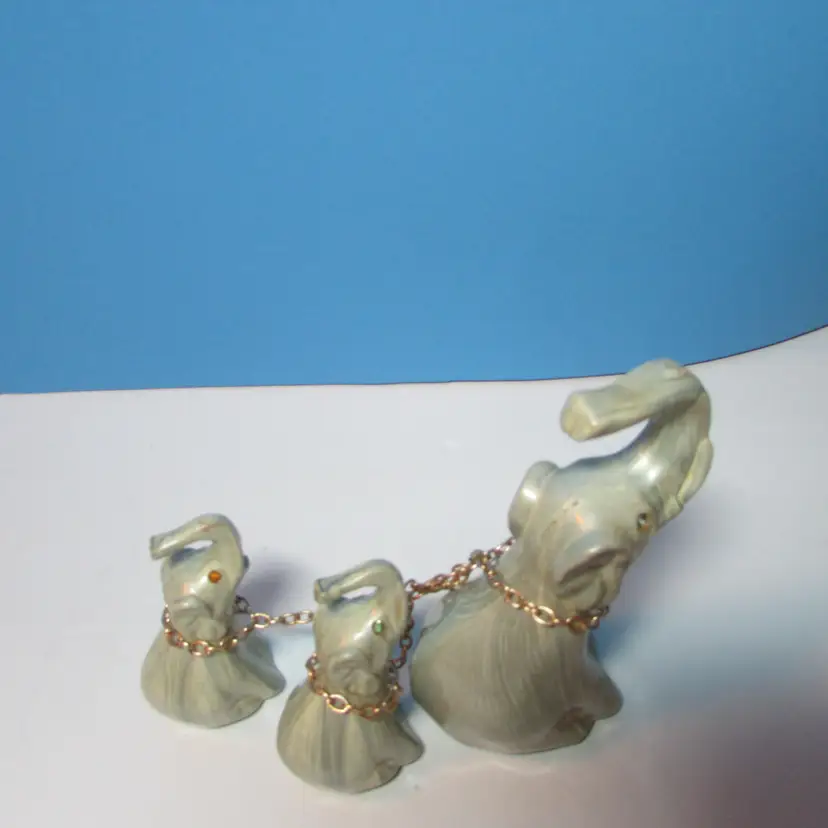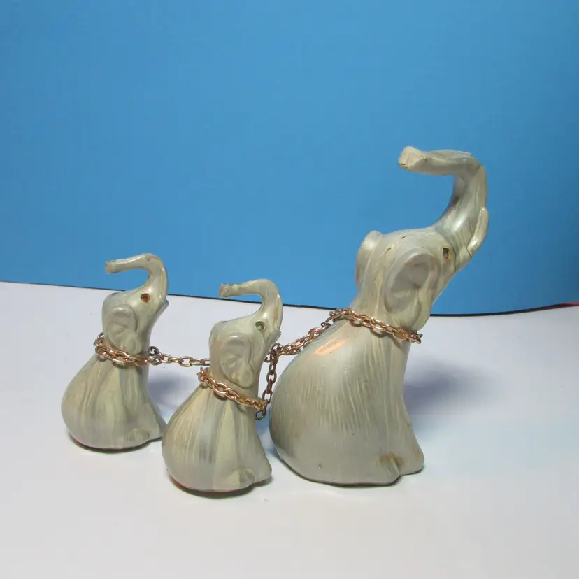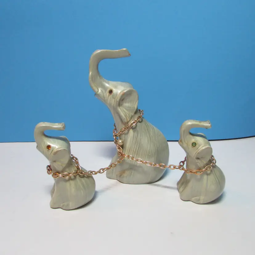 This adorable set has some wear, the largest elephant is missing an eye. Still nice to display, the largest is about 6" and the smallest is about 3 1/2". This is shipped from a smoke free home. Thanks for looking!