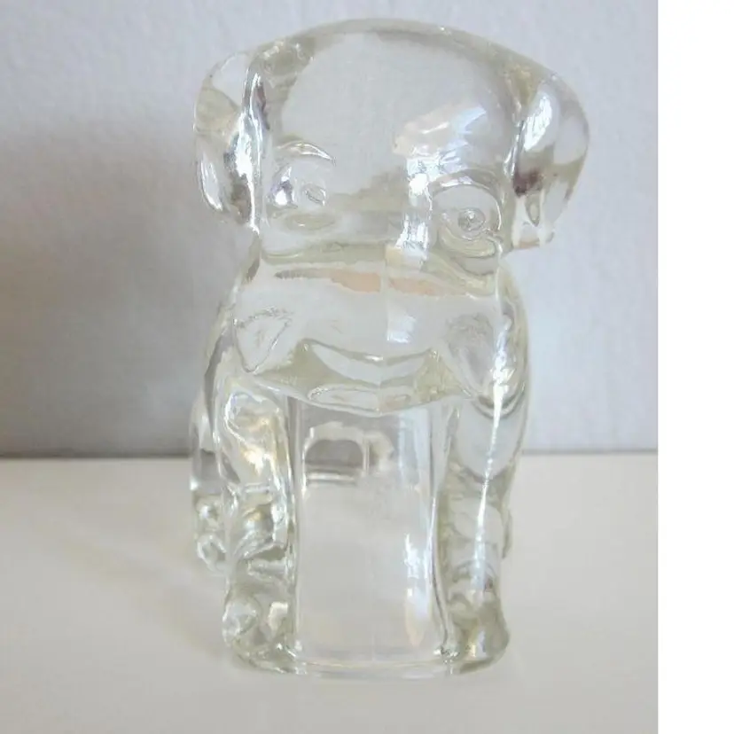 Vintage Federal Glass Sitting Dog Candy Container. Made from glass. He measures 2" x 2 1/2" x 3" tall. These were designed to have hollow bottoms which is where the candy had been. In good condition.