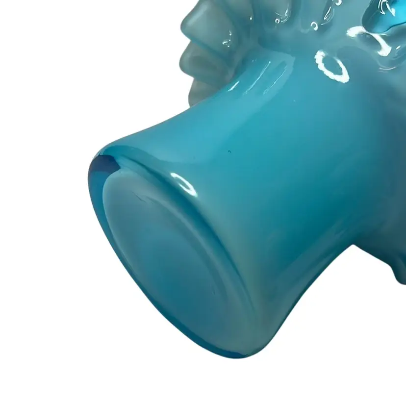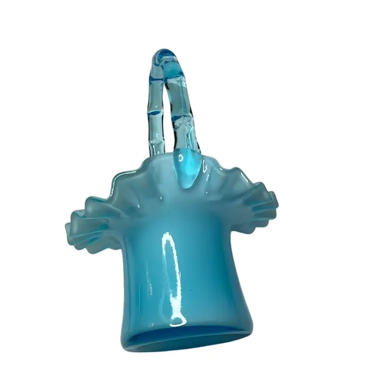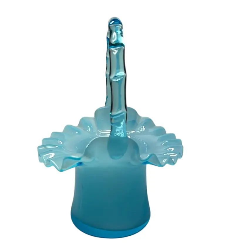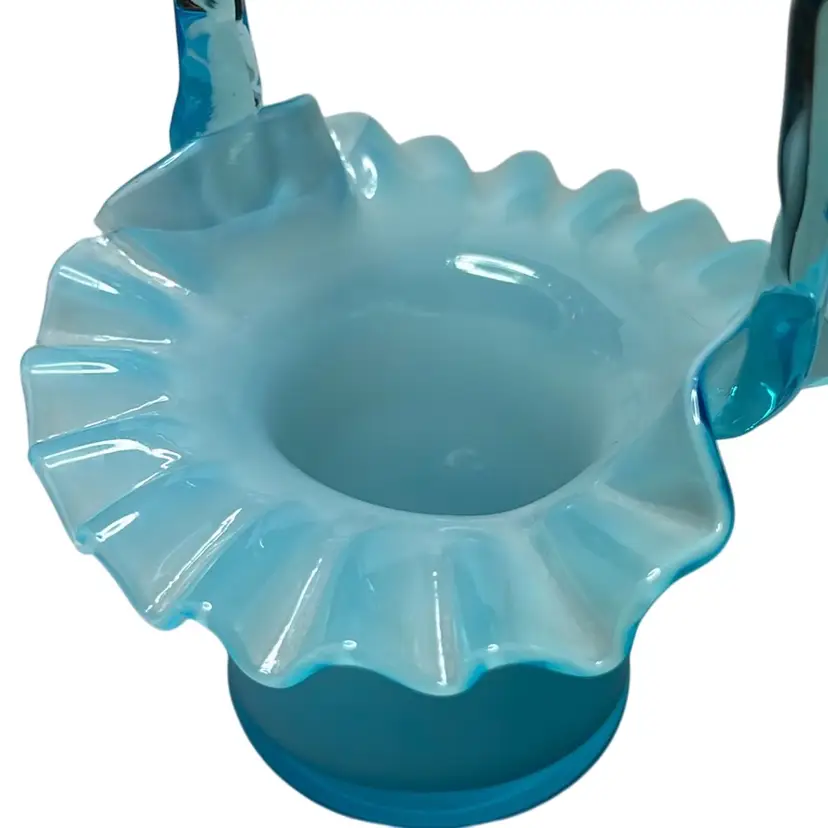 (Overlay or encased) ruffled top edge and a clear blue twisted handle. Perfect condition- measures 6.5” tall & 3.75” wide
