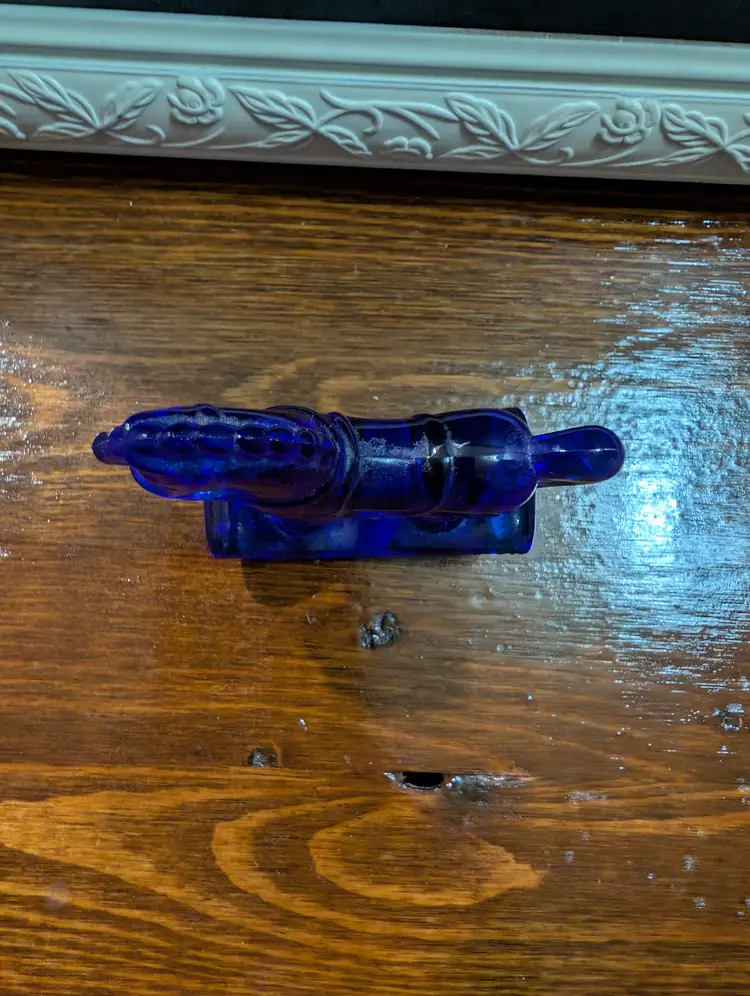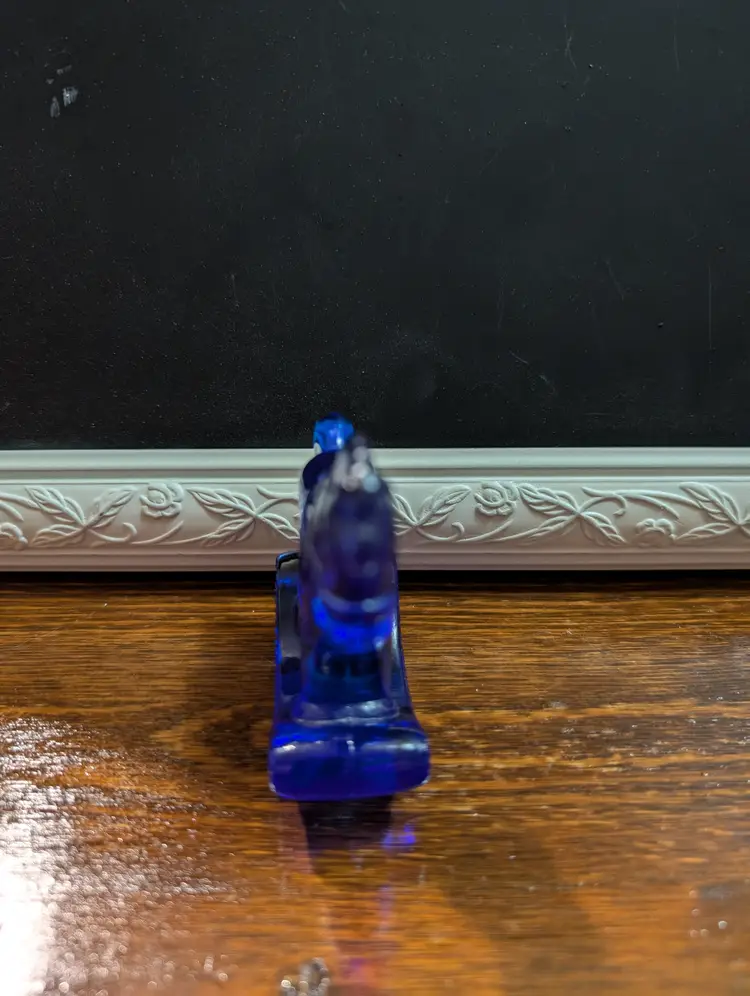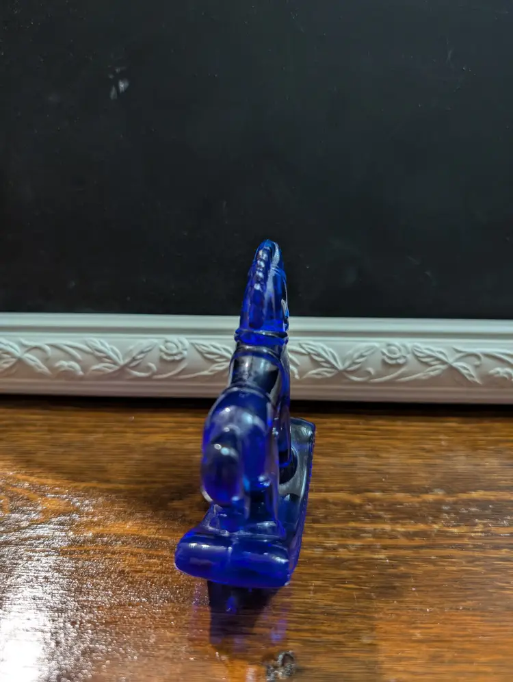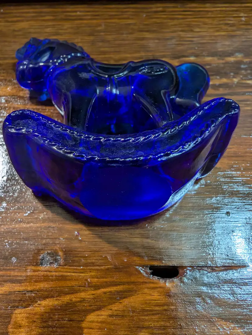 Vintage Fenton cobalt blue small rocking horse glass figurine. Figurine is in amazing shape with no chips or cracks and has a beautiful dark blue color. Piece has Fenton Mark on the back hind end of horse. Piece is approximately 3 inches height and length and has a 1 inch width. Beautiful collectible piece.