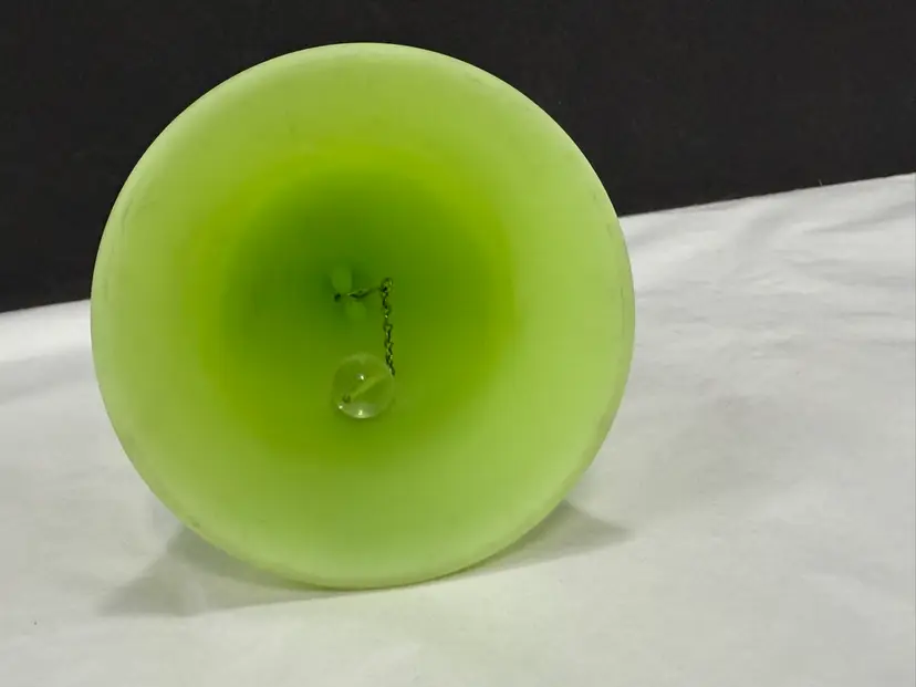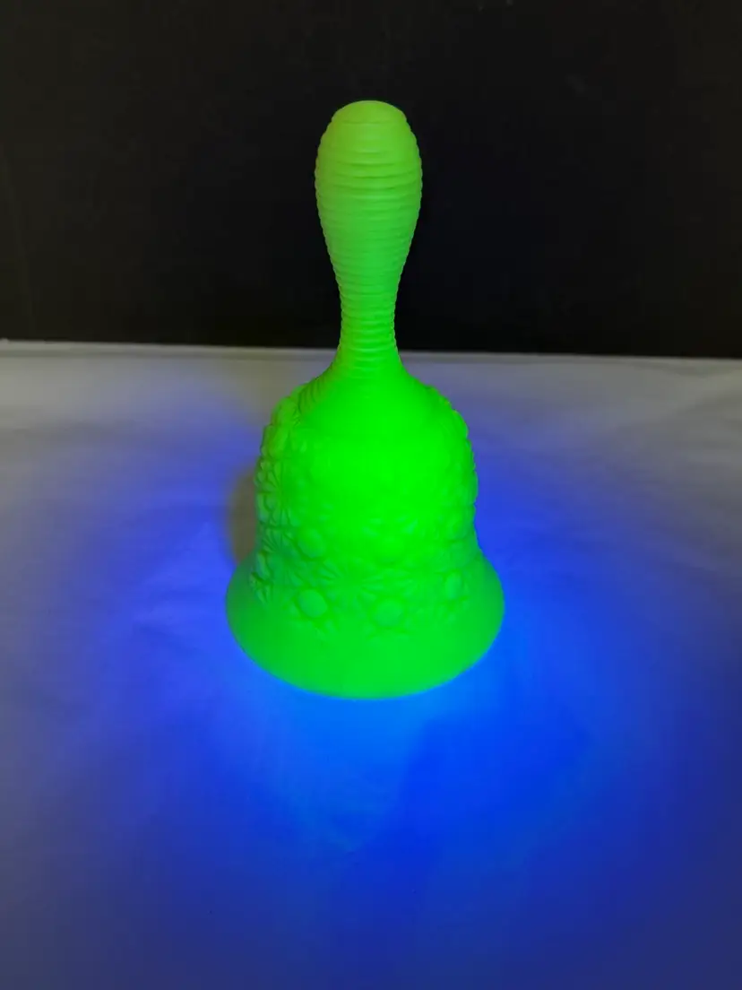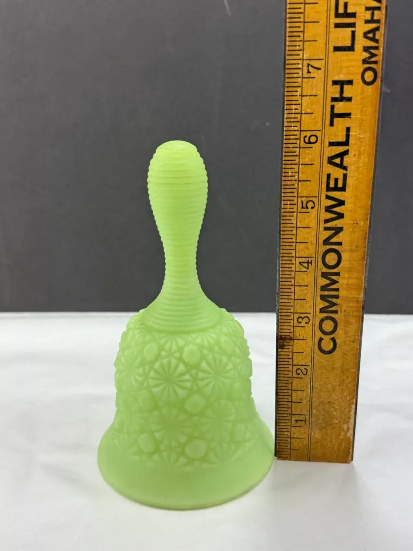 Vintage Fenton Daisy and Button Bell made of custard glass. These bells were produced by the Fenton Art Glass Company and are known for their distinctive "Daisy and Button" pressed glass pattern and ribbed handle. Pattern: Daisy and Button Material: Custard glass, which is an opaque yellow glass that can appear lime green and glows under UV light. Manufacturer: Fenton Art Glass Company