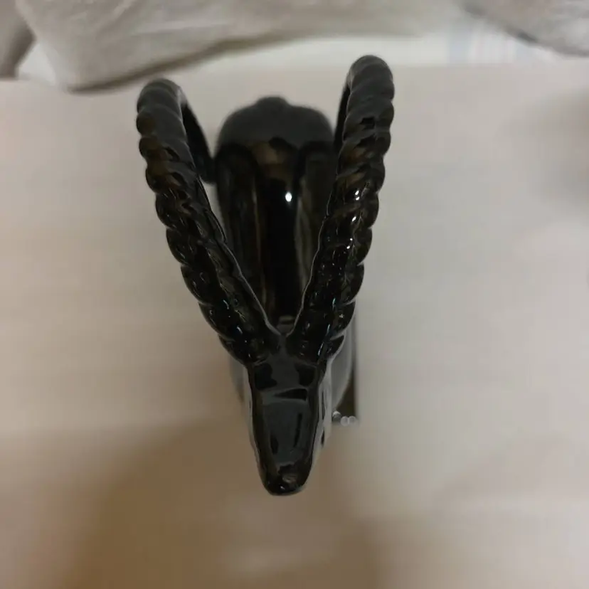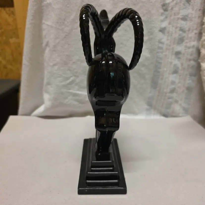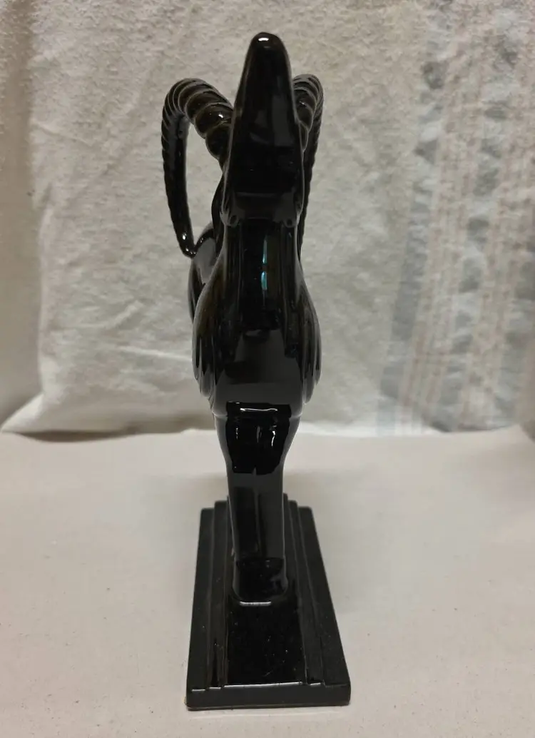 This Vintage Fitz and Floyd Black Antelope Bookend Statue is a medium-sized ceramic sculpture featuring a detailed antelope design. This mid century modern style piece has a glossy finish and a 3D effect, making it an eye-catching collectible for any room. Signed by the brand Fitz & Floyd, this original statue from the late 20th century is perfect for animal lovers and collectors of decorative sculptures. Made in Japan, this vintage bookend statue is a unique addition to any home decor or animal collection.