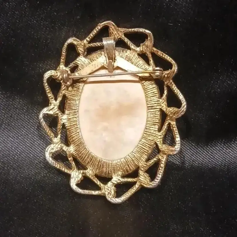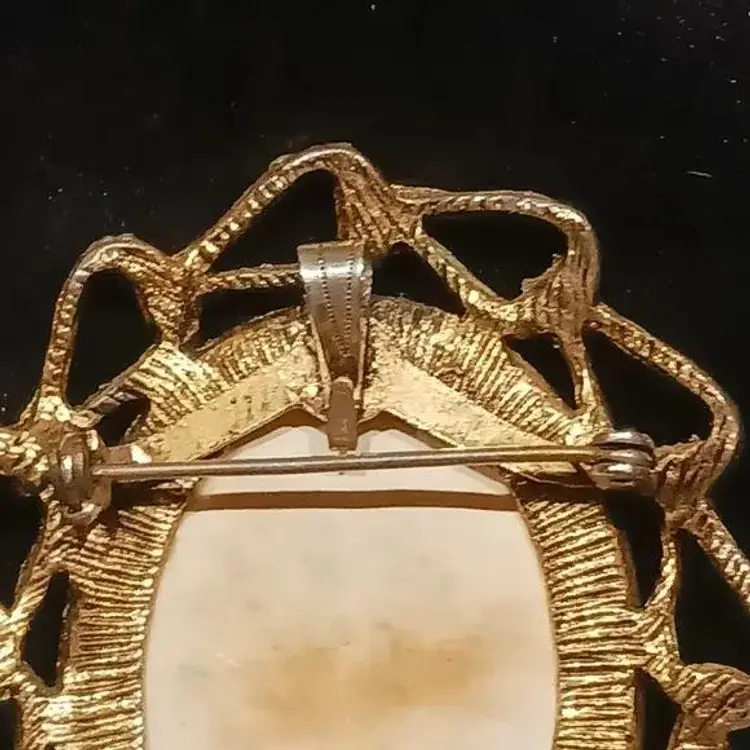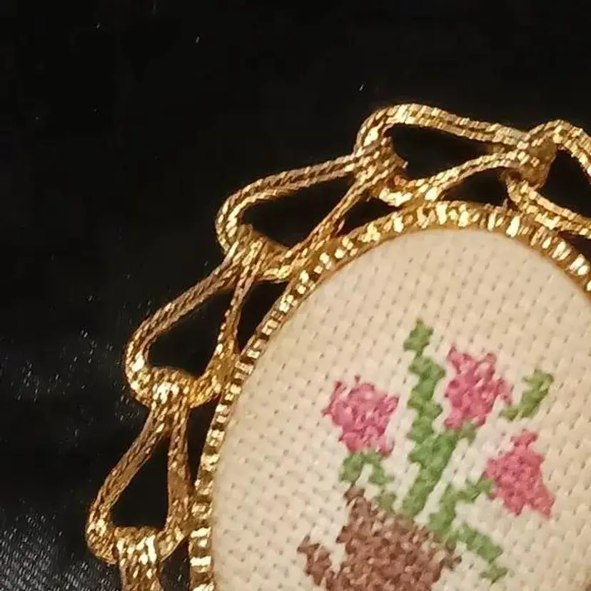 Vintage Framed 2.5in. Floral Needlepoint Brooch Pendant, Gold Tone Frame. Pre-owned, Very good condition.