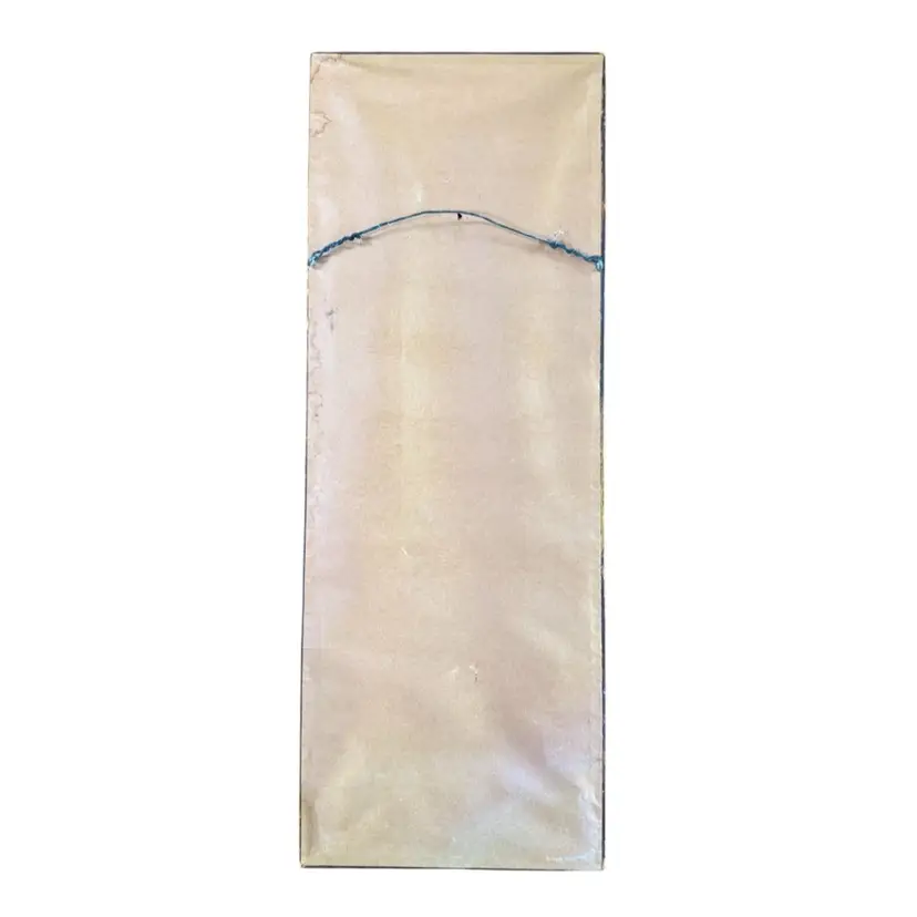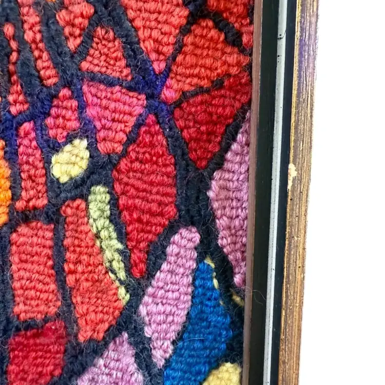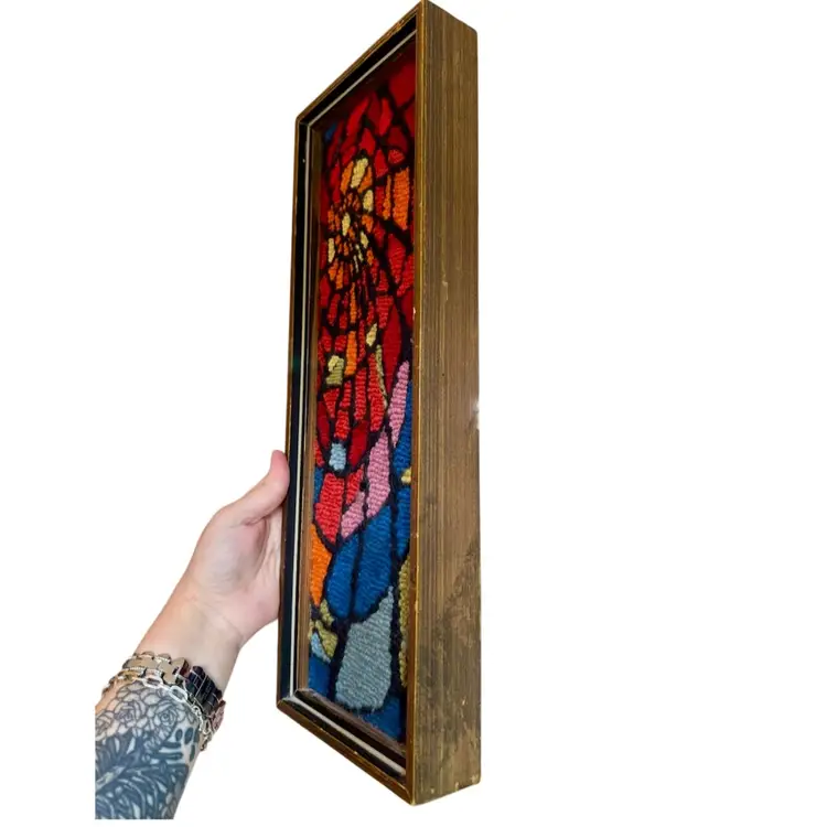 16 1/2”x6”x1 5/8. Awesome abstract design which resembles a spider web. Definitely a statement piece with all of its colors and bold outlines! Needlework isn’t as taught as it once was in a few spots.. but good condition overall. Frame has a hanger and has a slightly metallic gold finish. There is a small chip on the right rim of the frame, see picture.