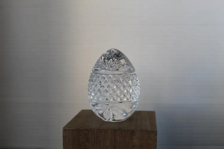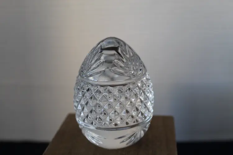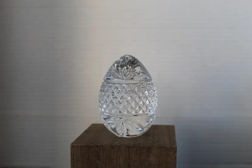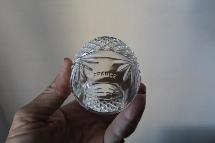 This vintage France lead crystal egg paperweight with an etched fern and hobnail pattern is a beautiful and delicately etched piece of decorative pottery and glassware. Made in 1993, this original Art Deco style paperweight features intricate designs and a clear color, adding a touch of elegance to any space. Crafted from 24% lead crystal, this paperweight weighs 1 lb and measures 3.5 inches in height and 2.5 inches in width. A true vintage gem from the 1990s, this paperweight is a unique and charming addition to any collection. France is imprinted on the bottom to add to its authenticity. This a beautiful heavy piece.