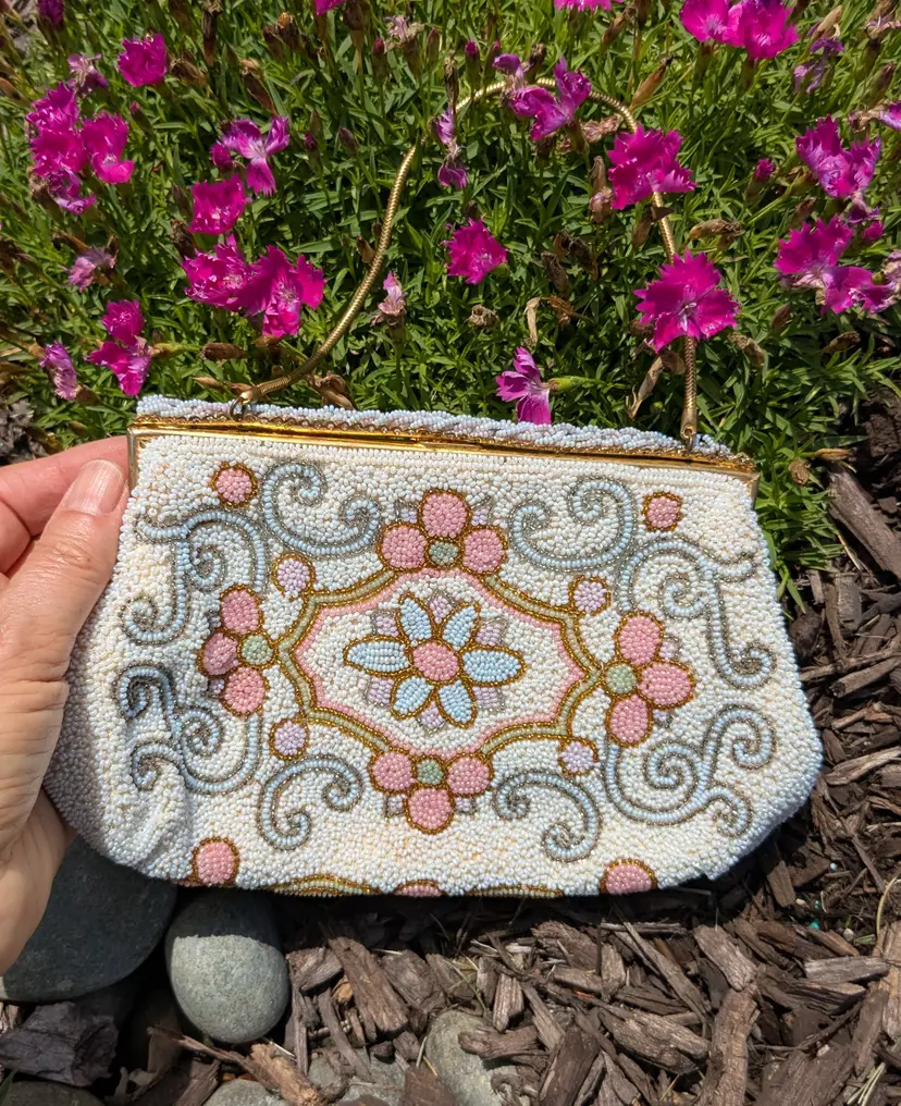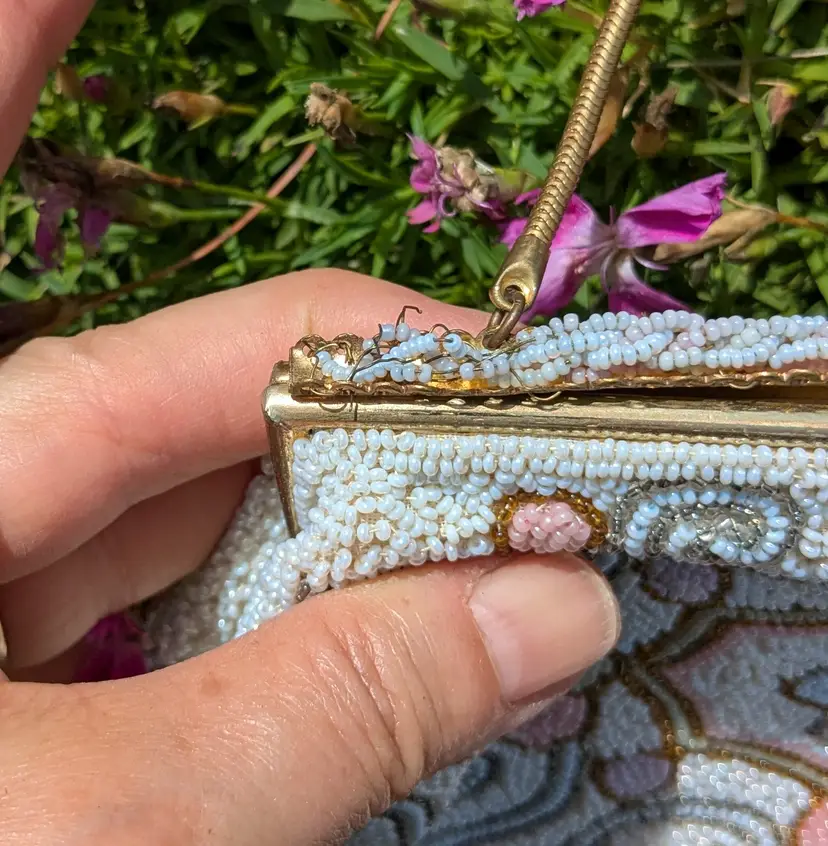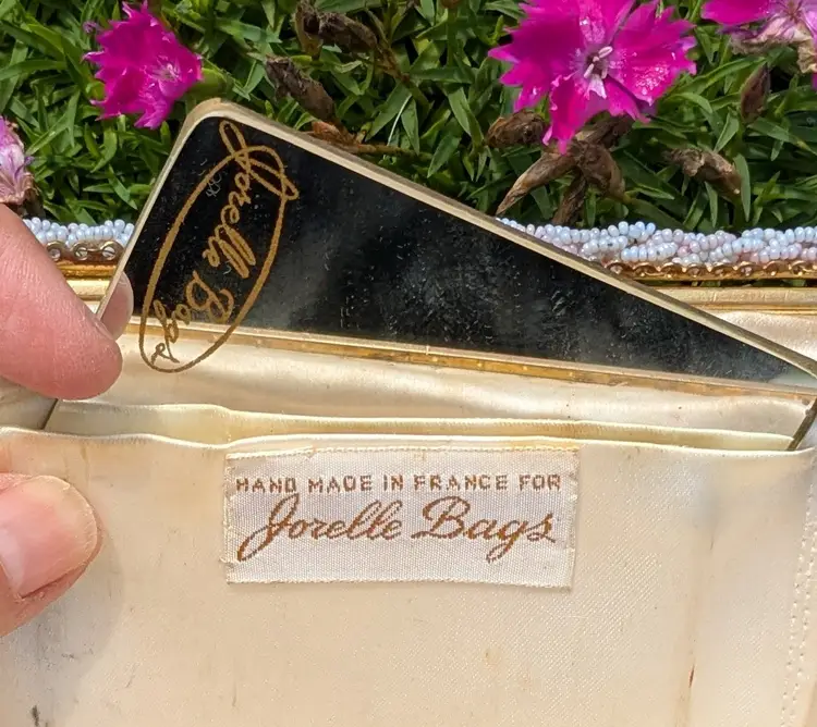 5" long by 8" wide with a 10" chain handle. Marked Hand Made in France for Jorelle Bags. Note that there is discoloration of the satin interior and some missing beads on the top left rim.
