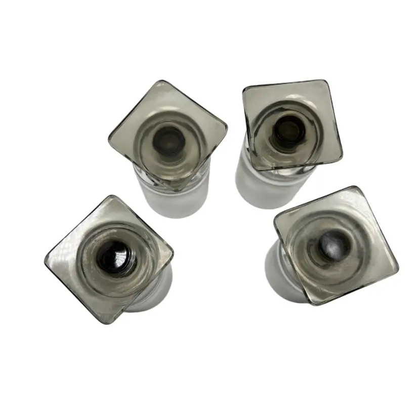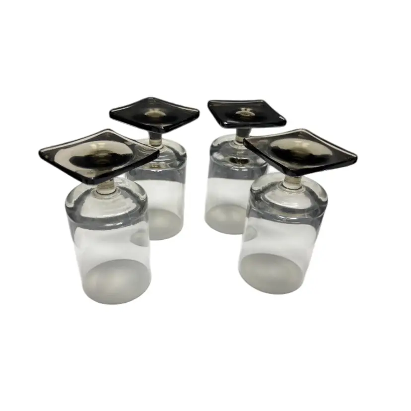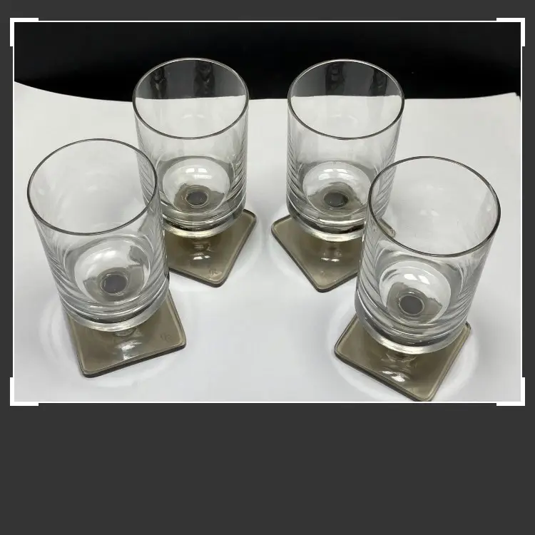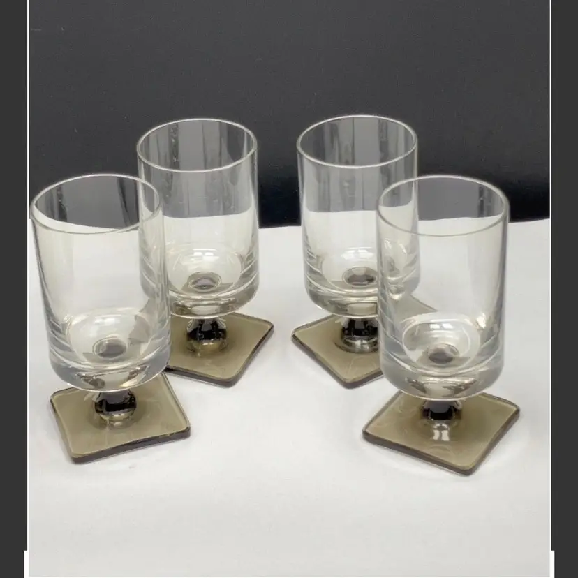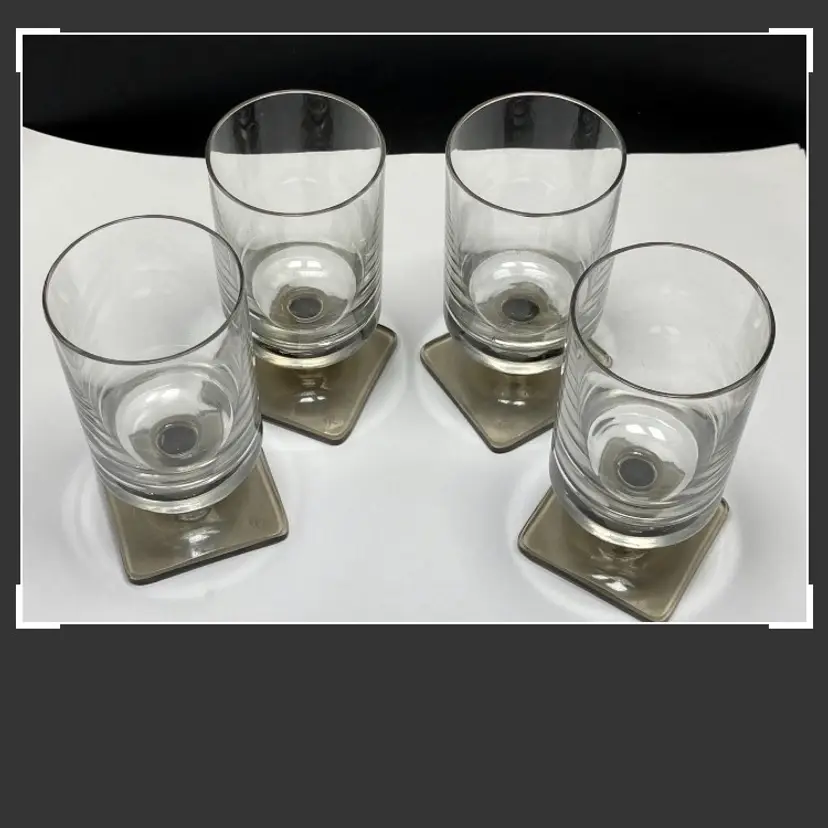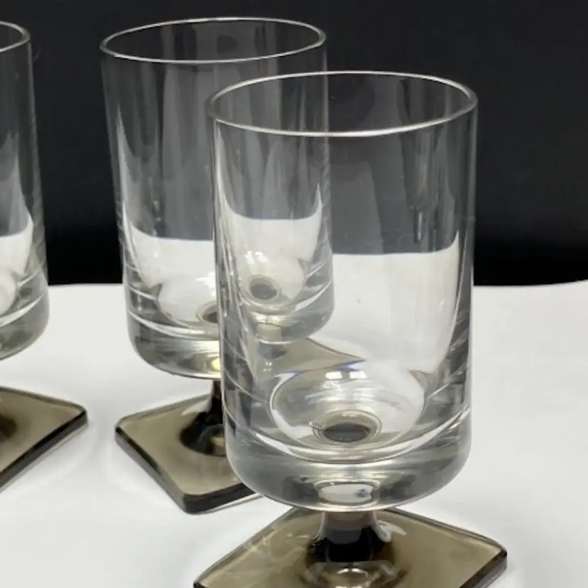 Rosenthal's cordigal glasses with smoky transparent base and stem with a crystal top. Each marked with Rosenthal on the bottom. approx. size 3.5”. no chips or cracks.