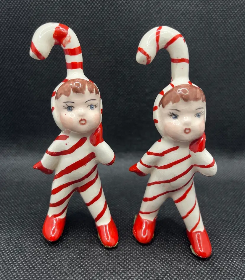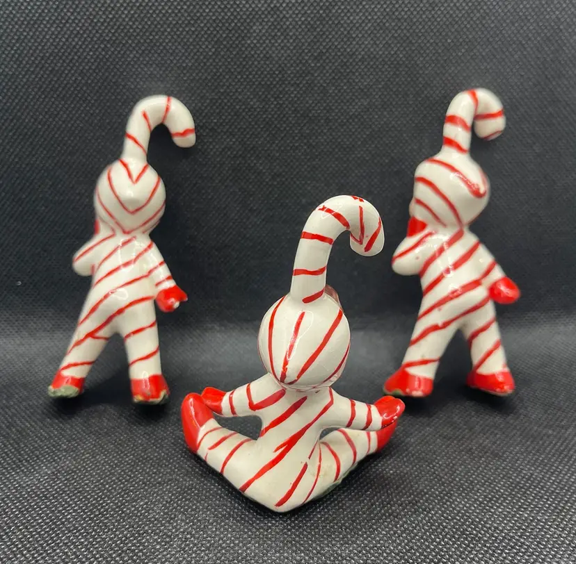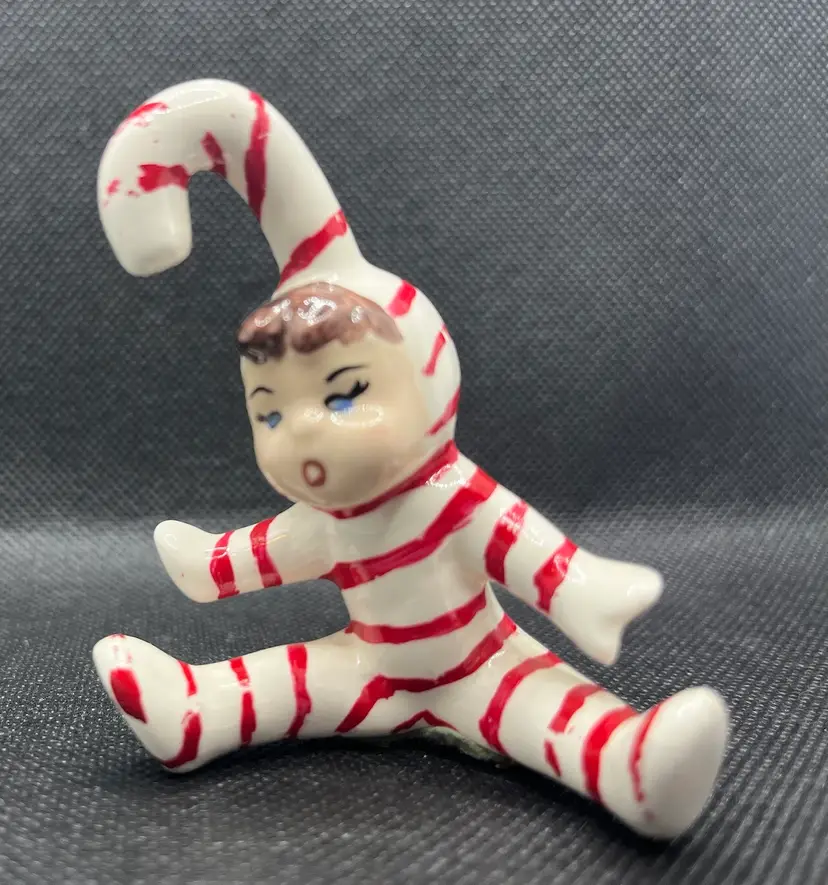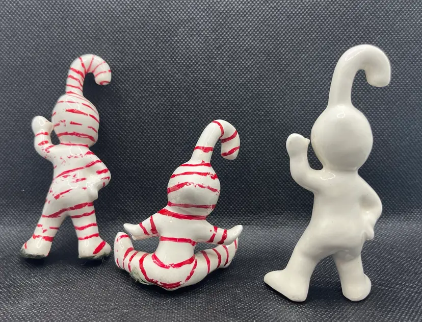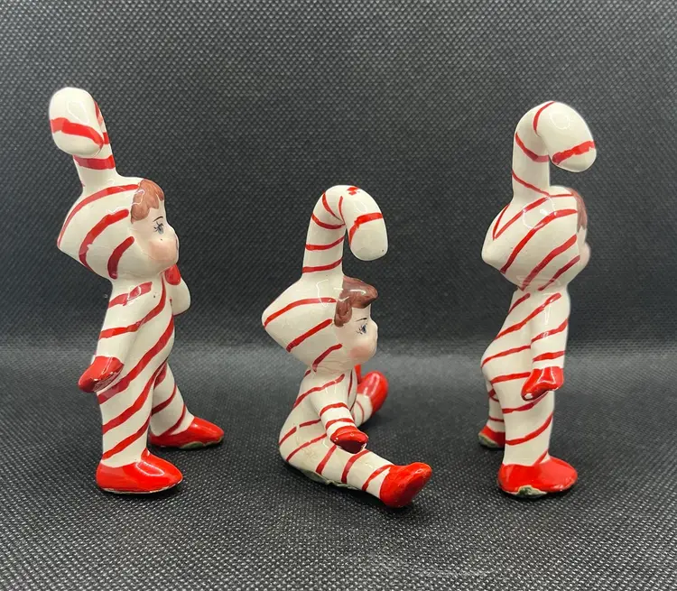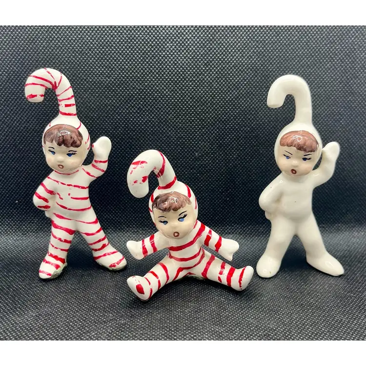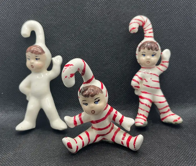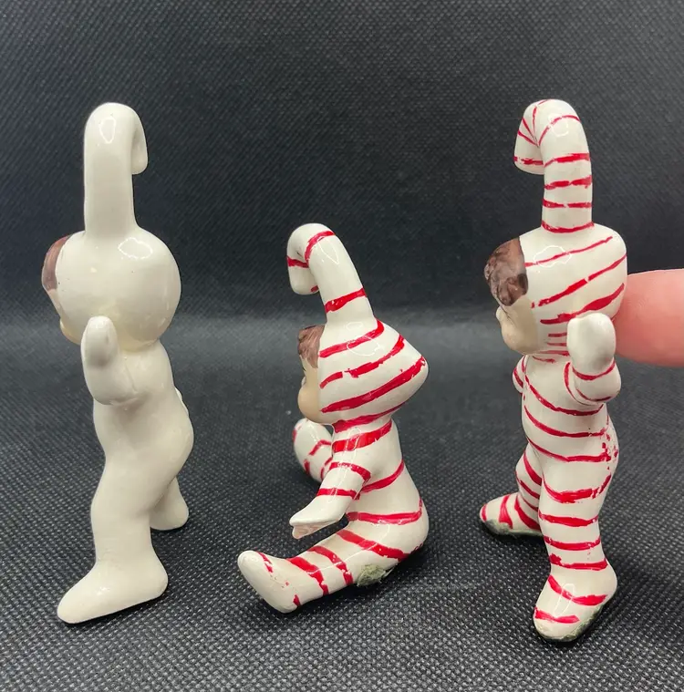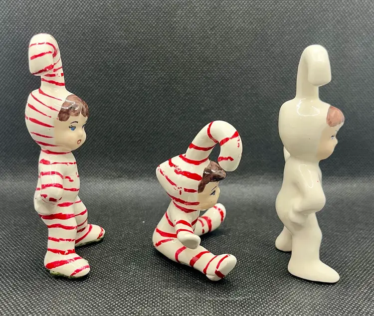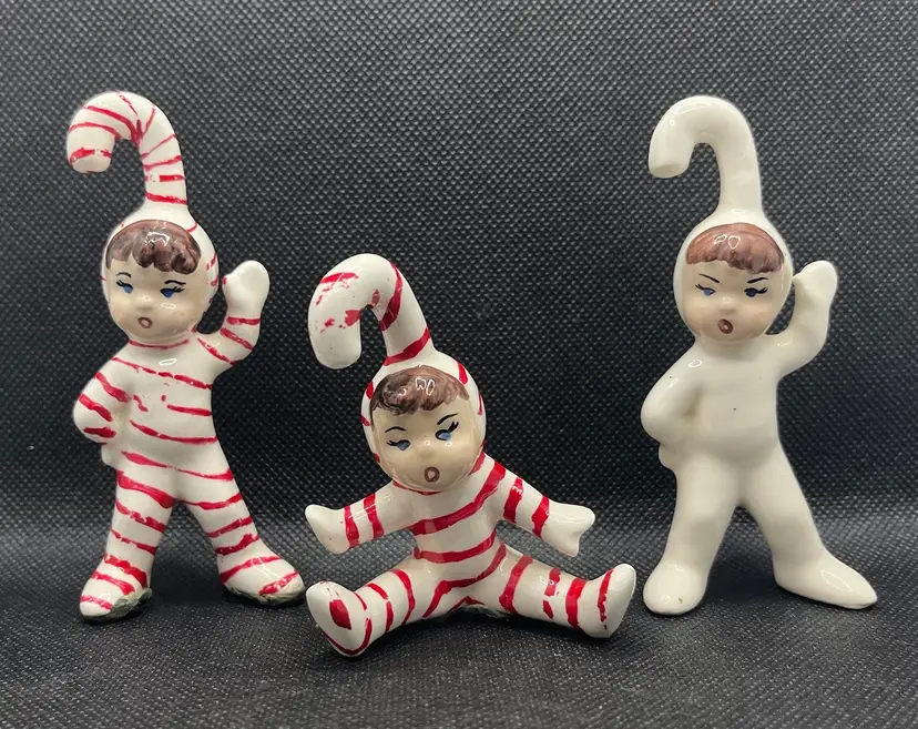Vintage Hand Painted Candy Cane Pixies Kids Christmas Figurines 1950’s Kitsch Set Of 3.