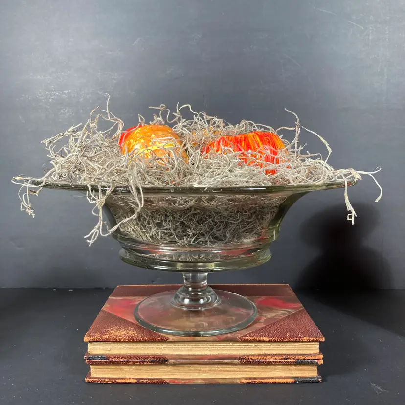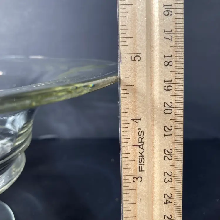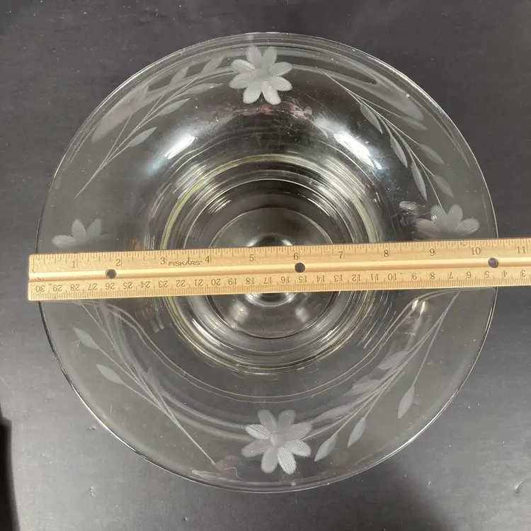 Stands 4.75 inches overall height. Bowl is 10.5 inches in diameter. (glass bowl only is for sale in this listing. I just love styling my finds.)
