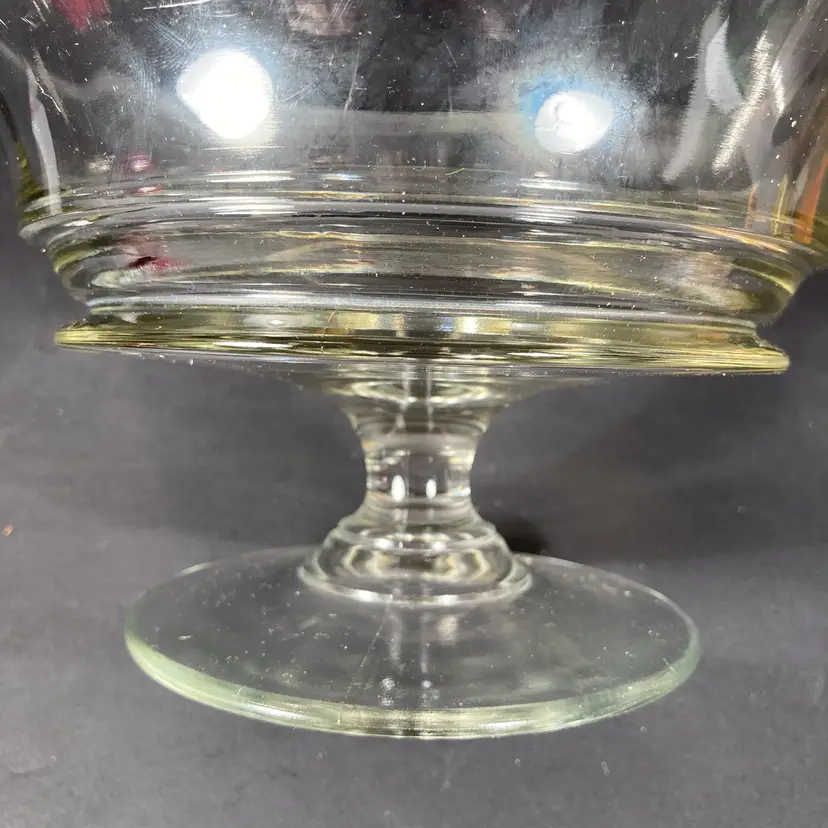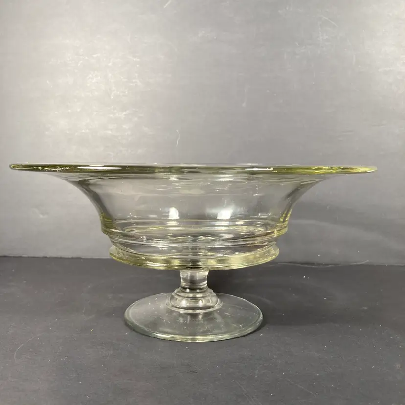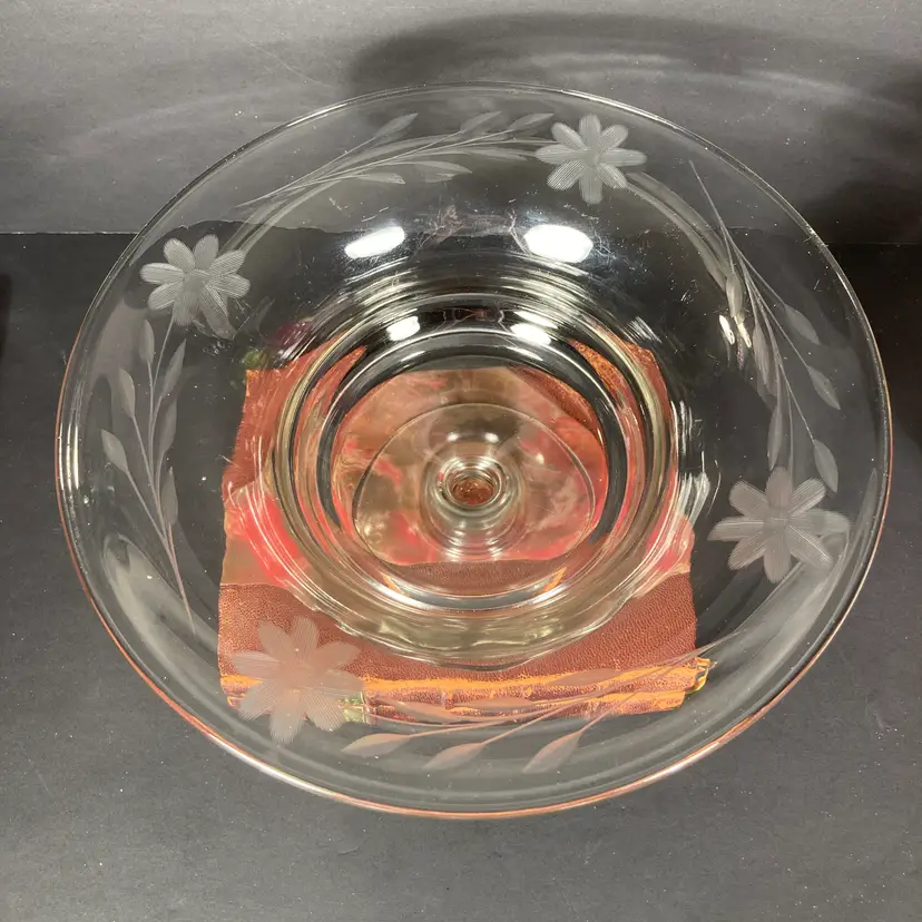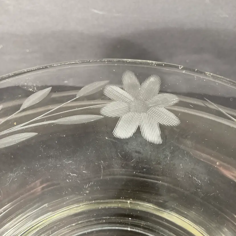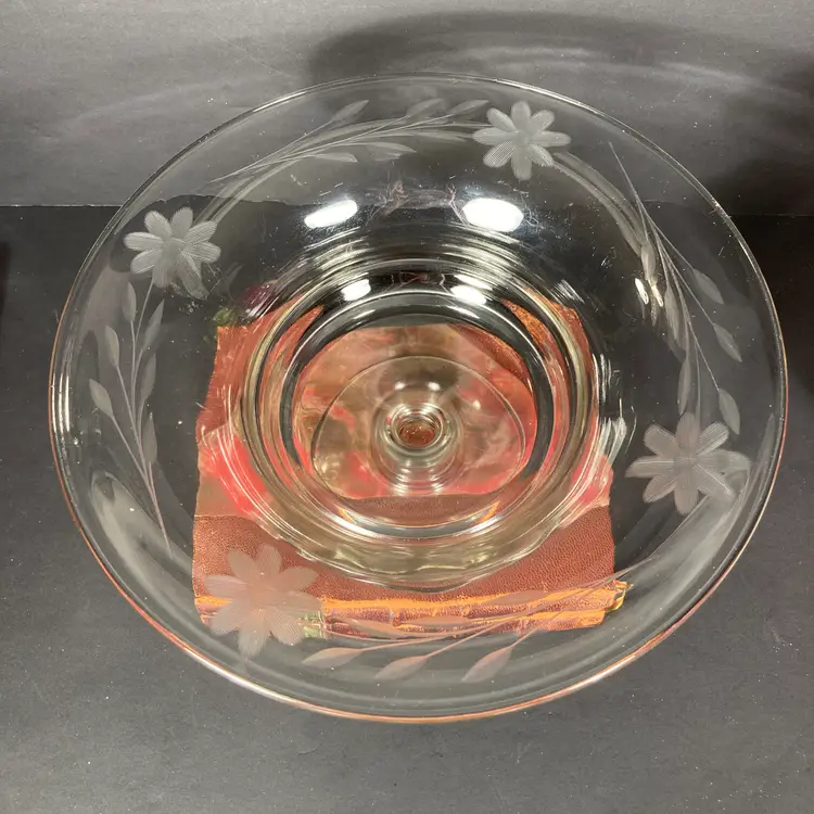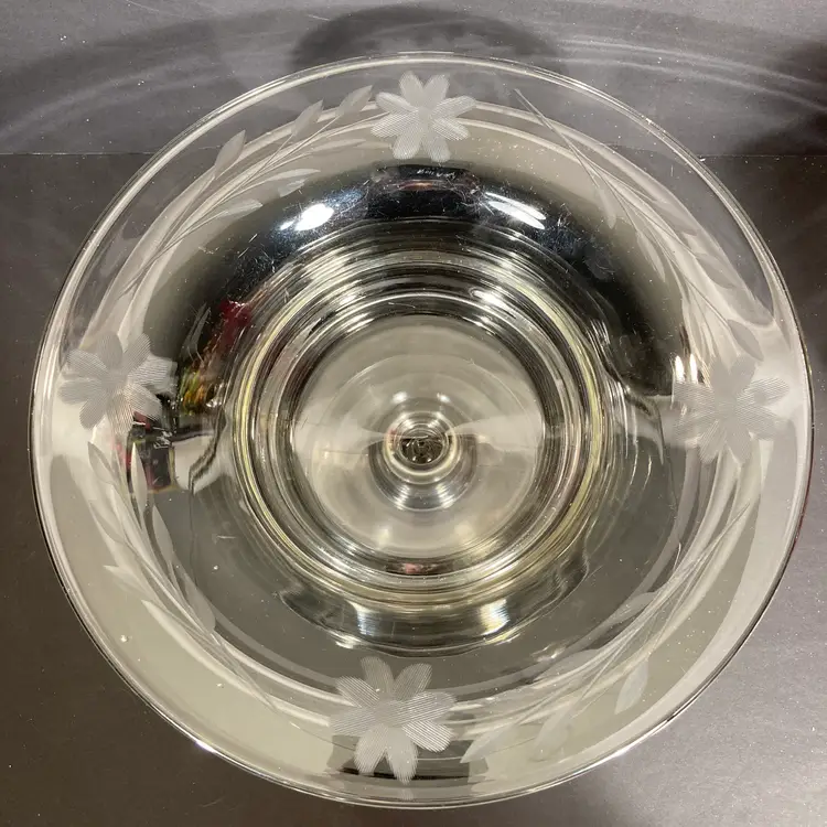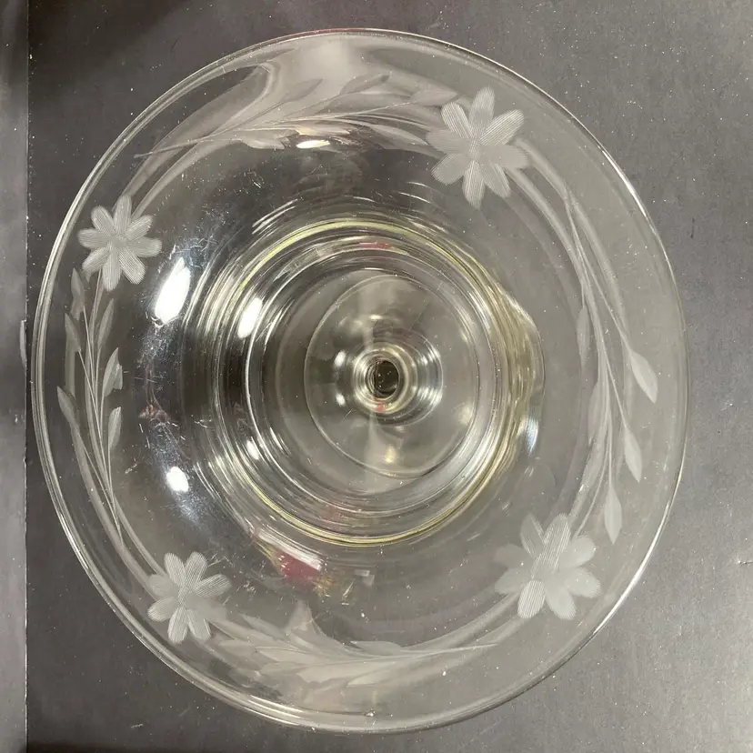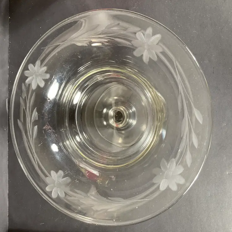 Vintage mid-20th century pressed glass pedestal bowl or compote in a classical form. Has elegant hand wheel-engraved floral designs at the rim.