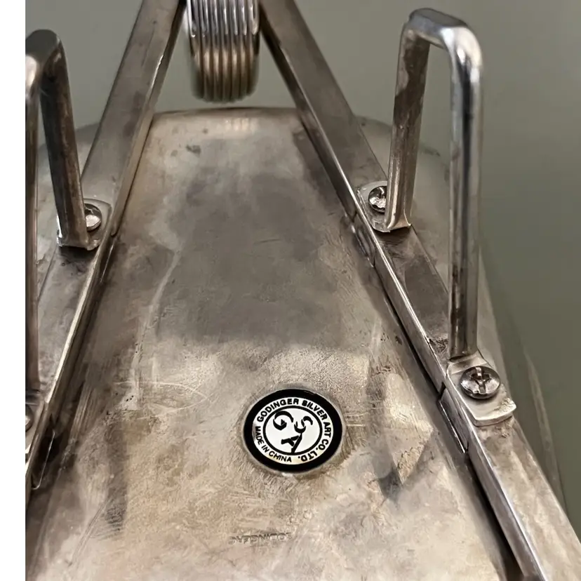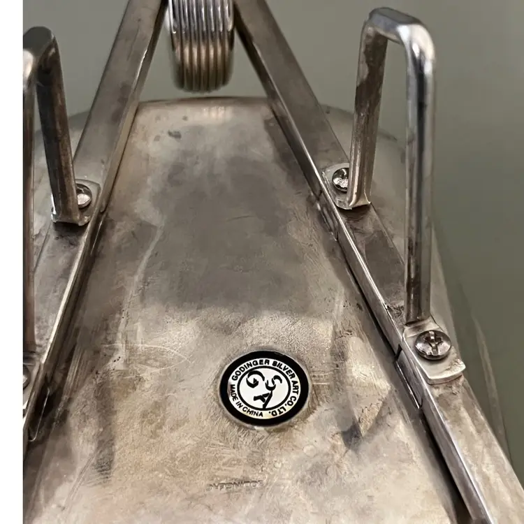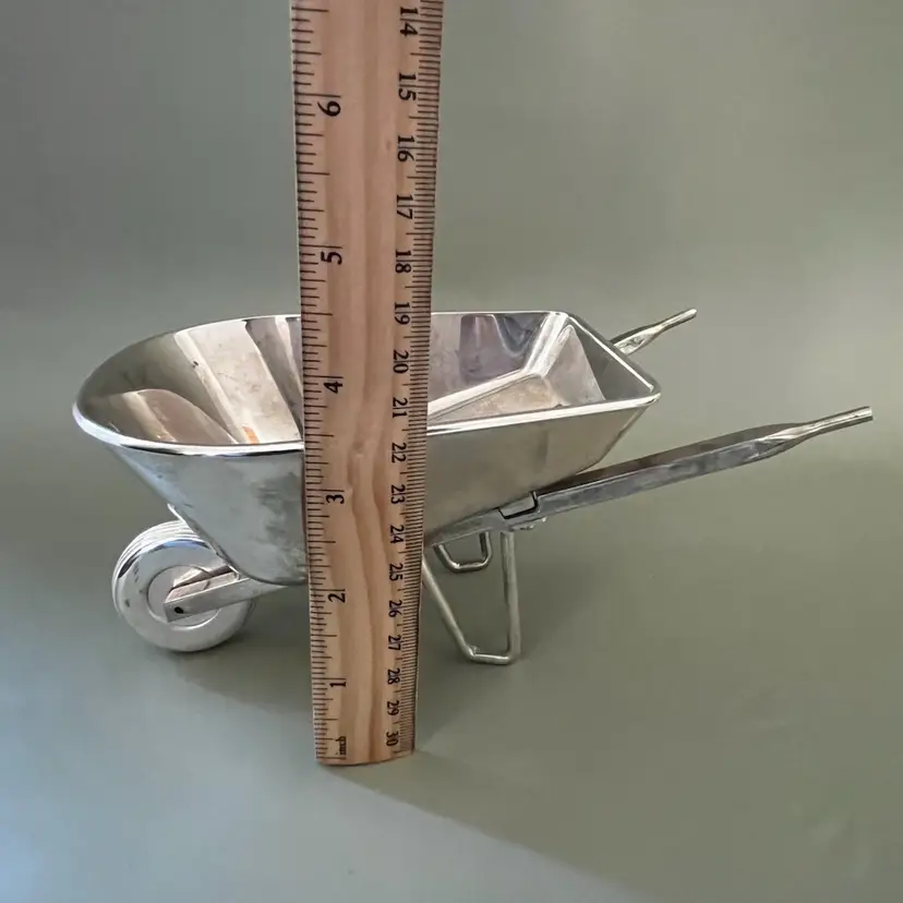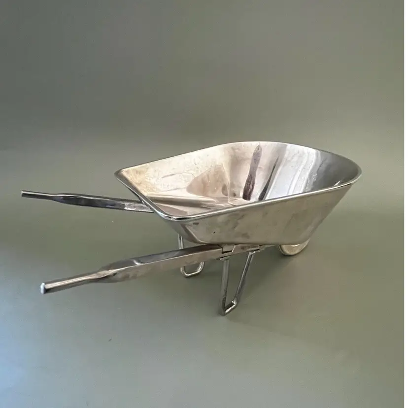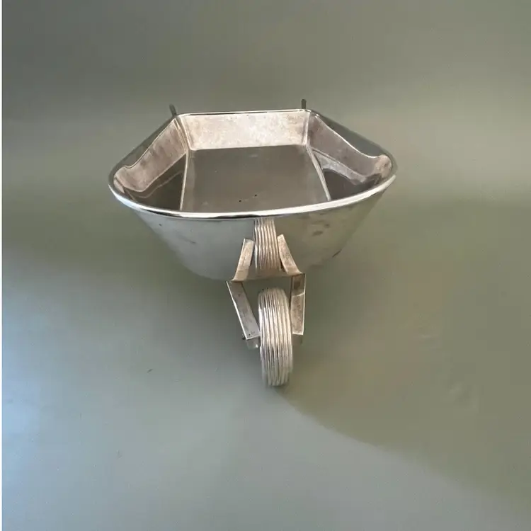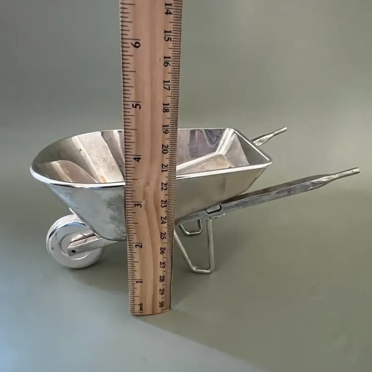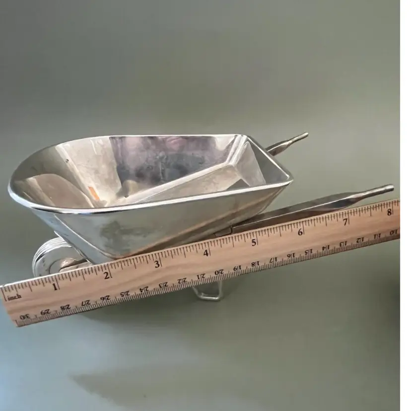 The Vintage Goddinger Silver Art Co Wheelbarrow Nut/Candy Dish is a charming and whimsical piece made of silver plate. This unique dish is perfect for serving nuts or candies in a quaint and decorative way. The Godinger brand means quality and craftsmanship for this collector's item, making it a delightful addition to any home decor.