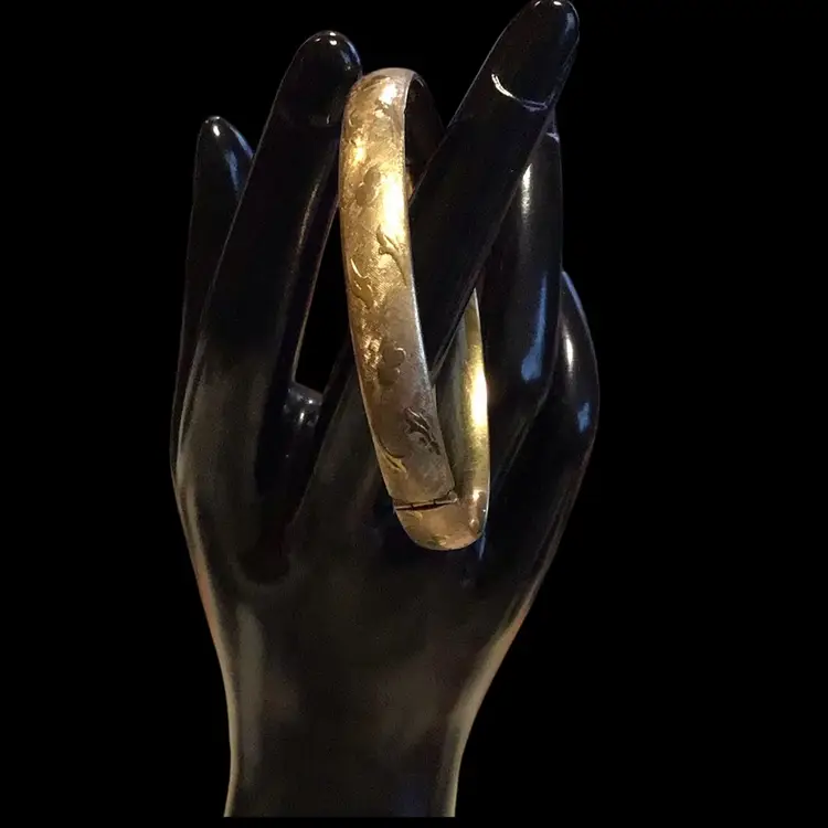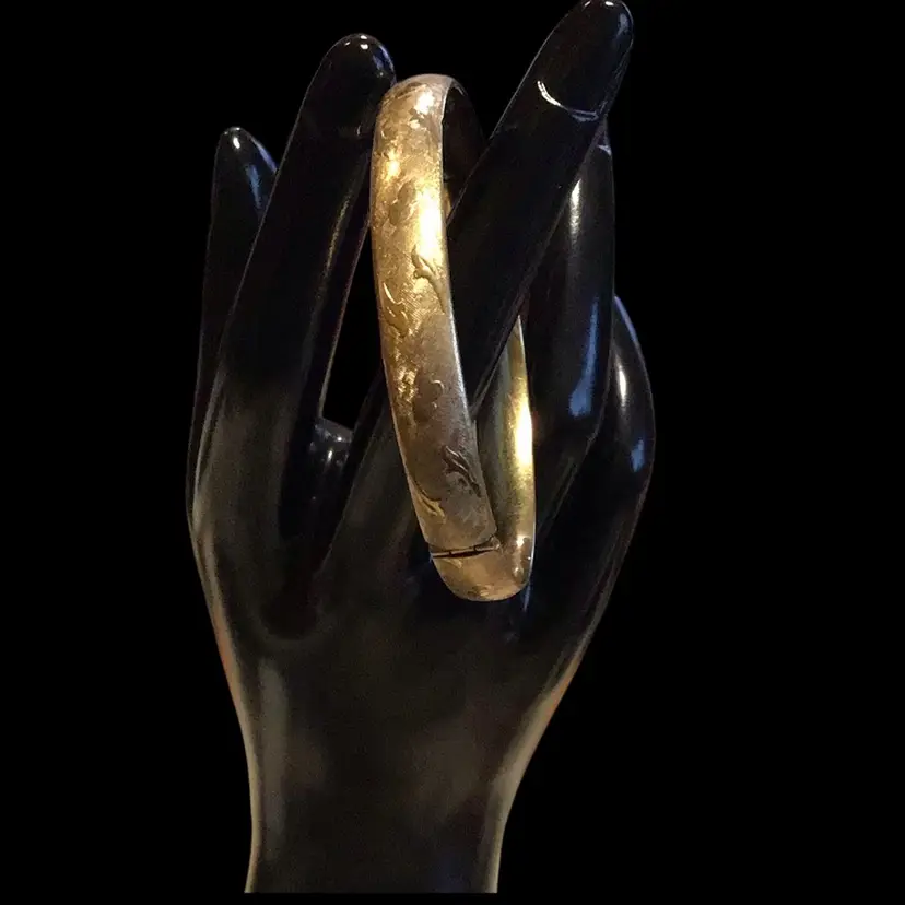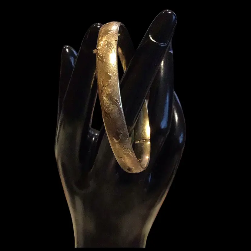 12K GF ‘Marathon’ brand hinged, with etched detail hearts & leaves, small size 6, very little wear, gorgeous. #S104