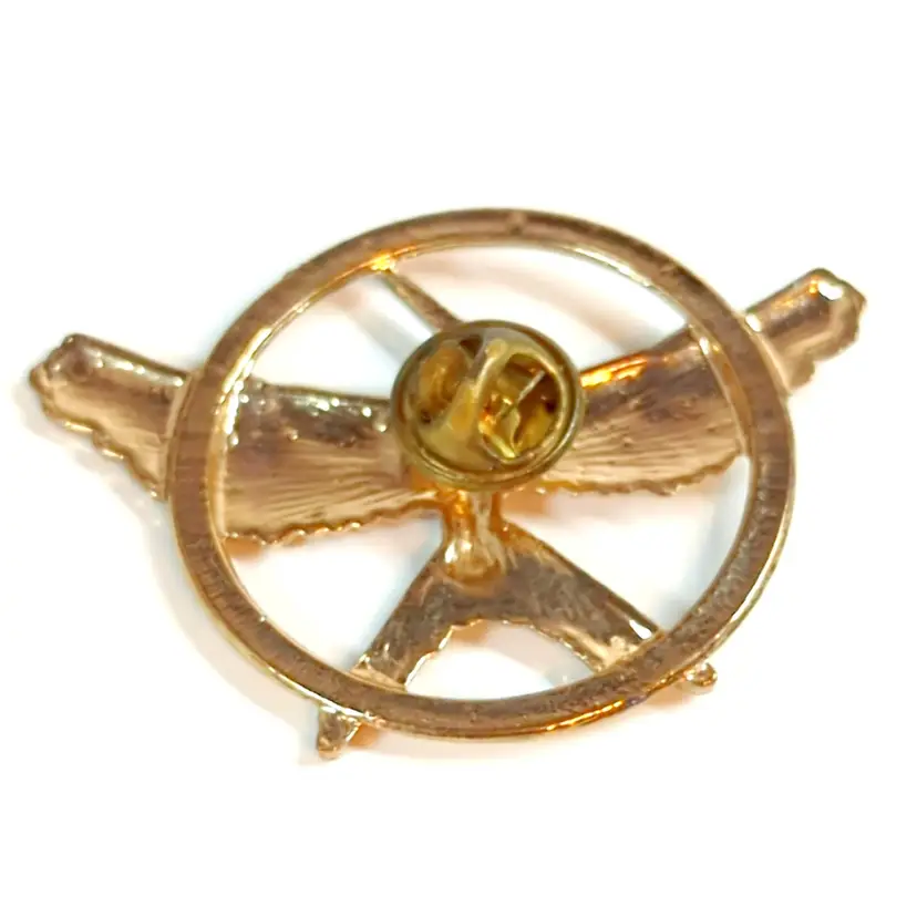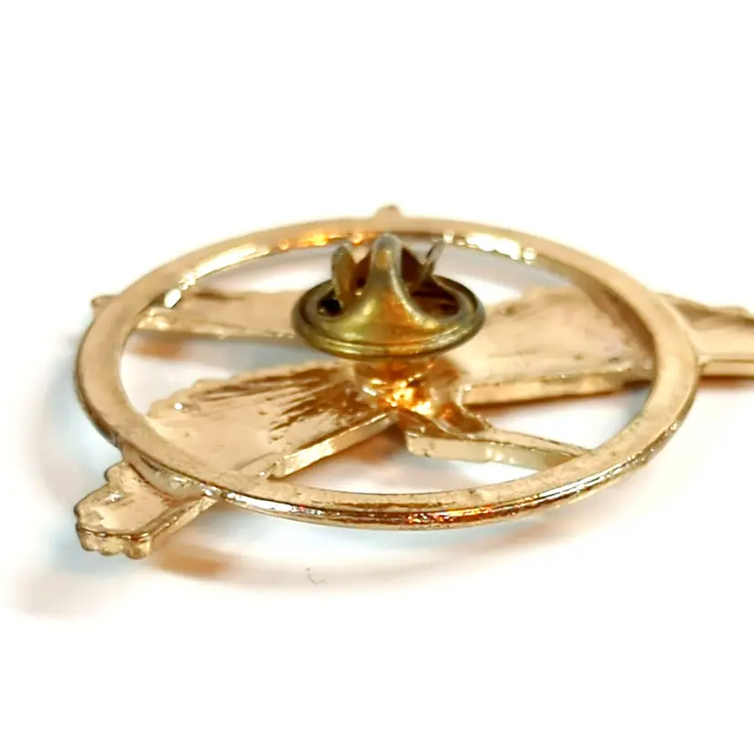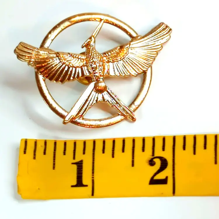 • Vintage design • Mockingjay motif • Measures 1.5 inches in diameter • Gold tone finish • Secure pin-back closure