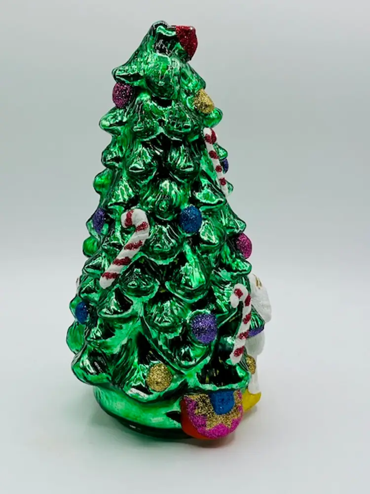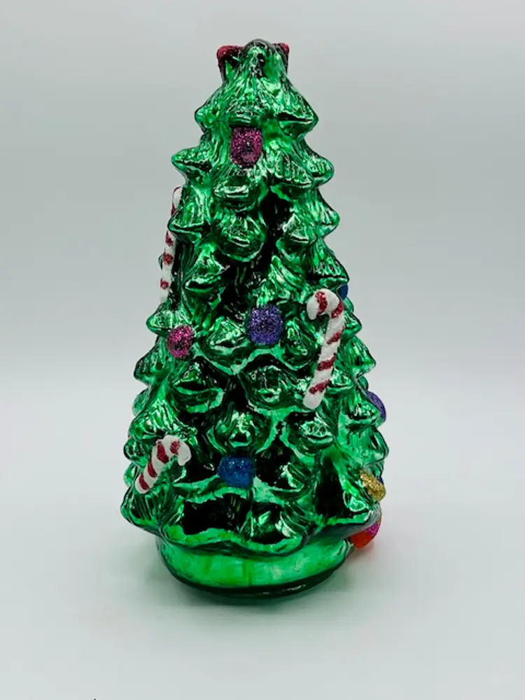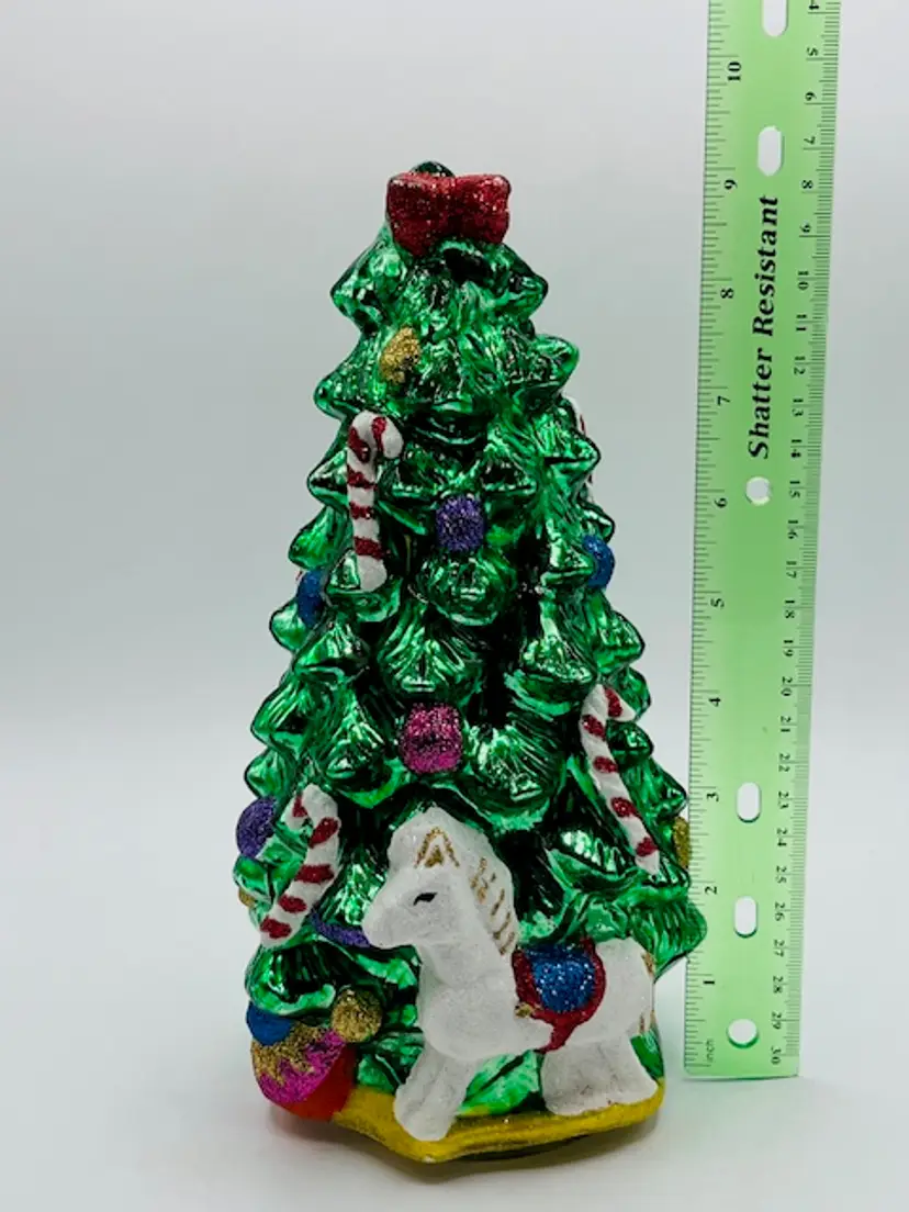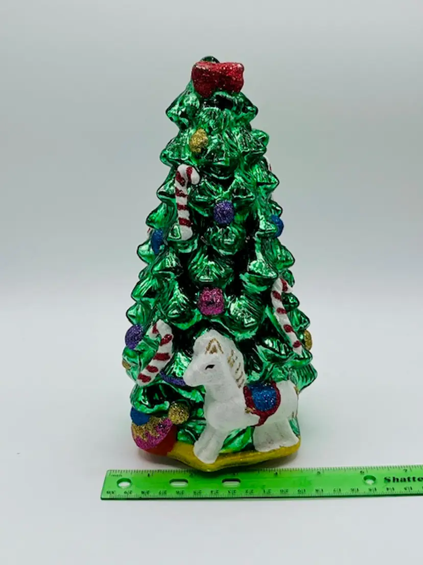 This Vintage Green Mercury Glass Christmas Tree stands 9.5" tall and would make a charming addition to your holiday decor. Made of glass and featuring a festive green color, this free-standing figurine is perfect for any room in your home. The rocking horse design adds a touch of whimsy to your Christmas tree while being a unique and eye-catching piece for adults to enjoy during the holiday season.