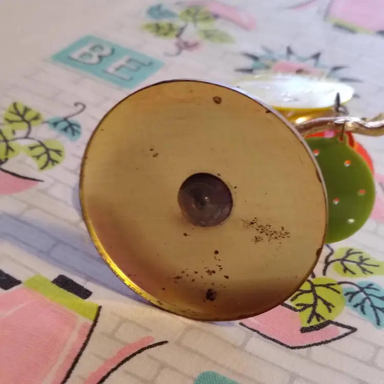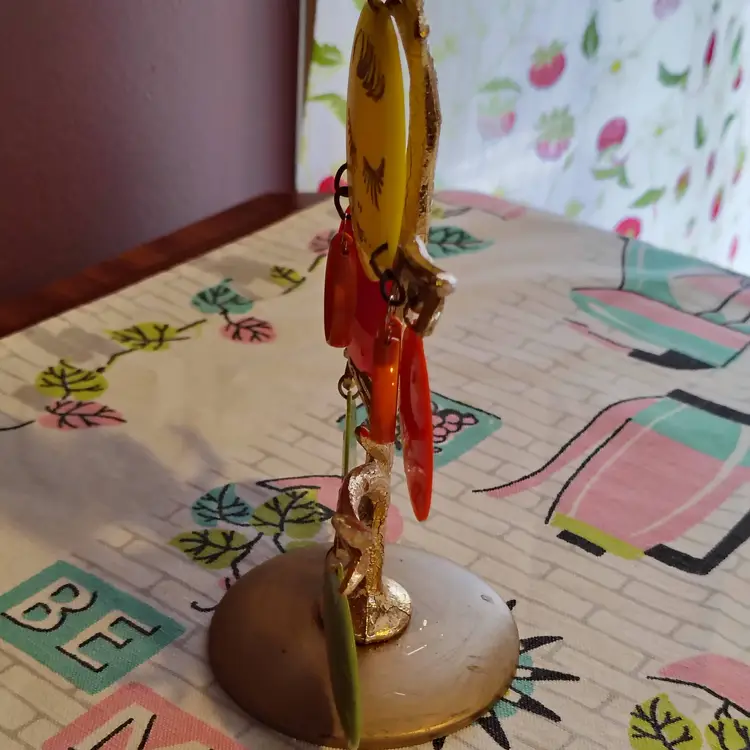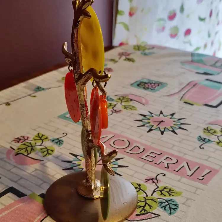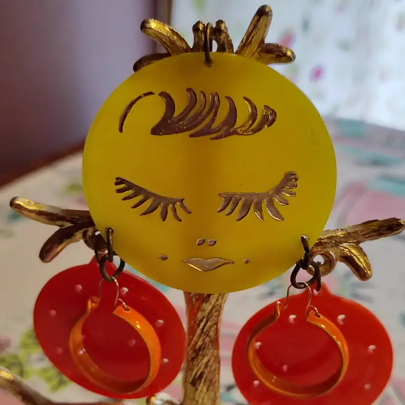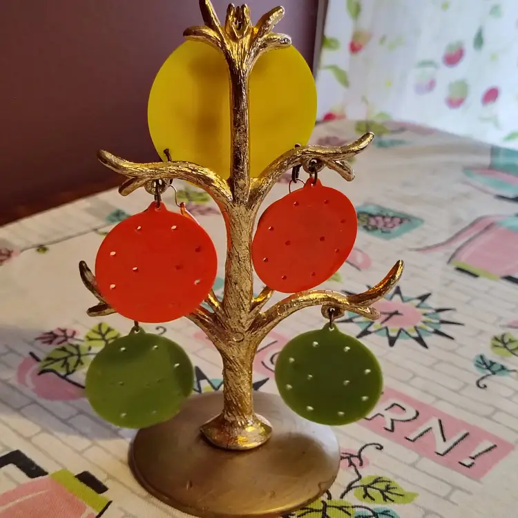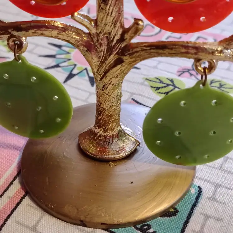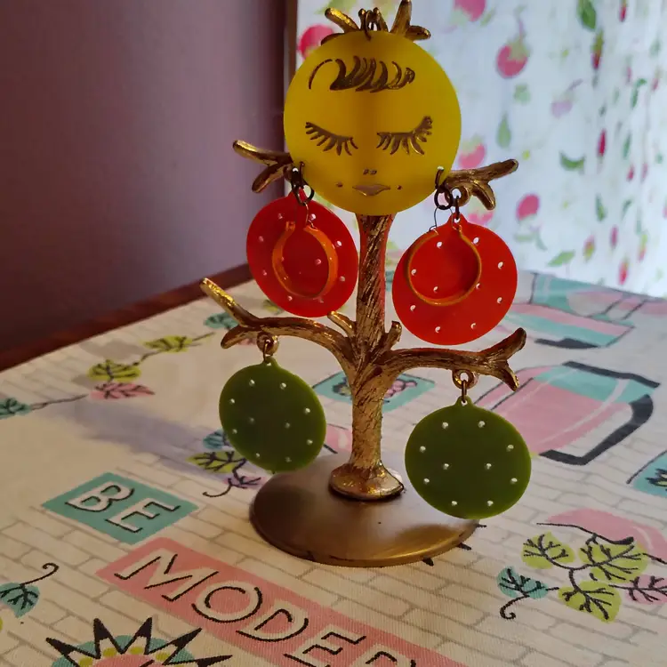 This is a vintage earring holder that absolutely screams 1970s! This metal tree holds five plastic disks, four of them punched full of holes to hold your little treasures. The fifth disk is decorated with a stylish woman's face, and she come with a pair of her own hoop earrings, that match the orange discs below! Funky! Condition: This gal is in Excellent shape! The base is secure, and all of her discs are well attached and undamaged. The only thing I noticed is a tiny splash of gold paint on one of her lower discs, probably just a miss from painting the base. Size: She measures 4" across, and is 5¾" tall. Her base measures 2¾" across.