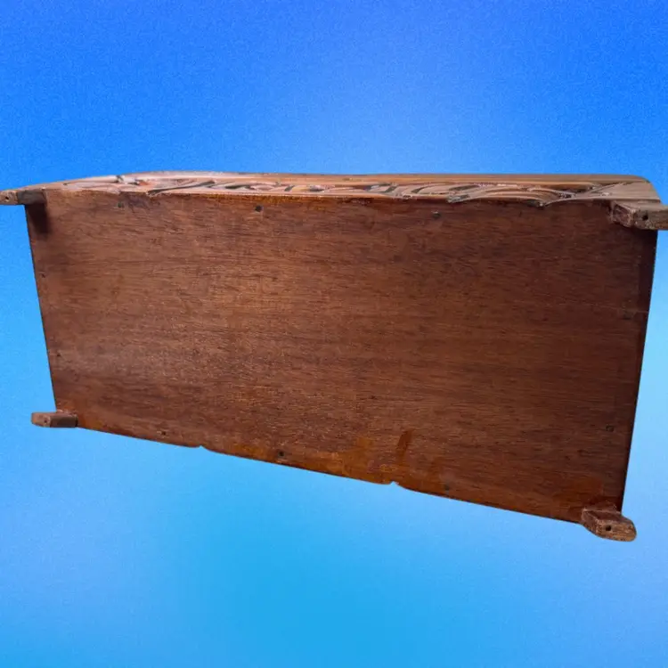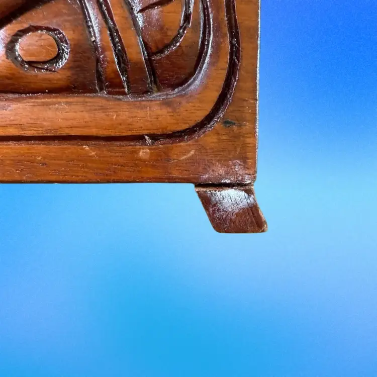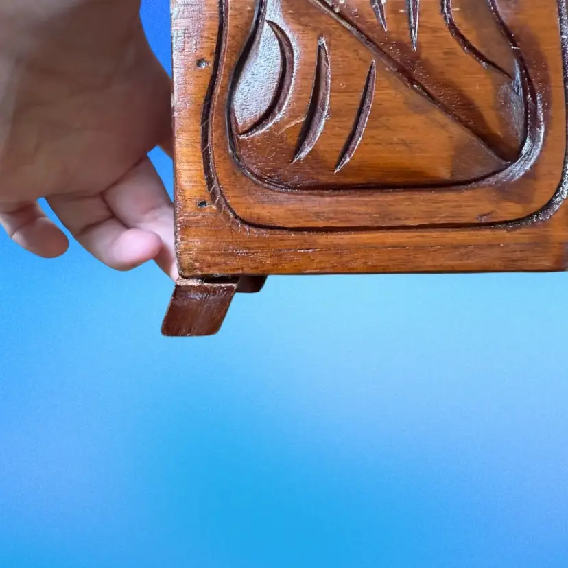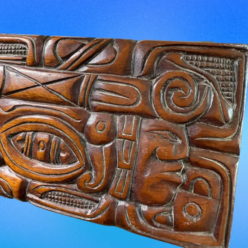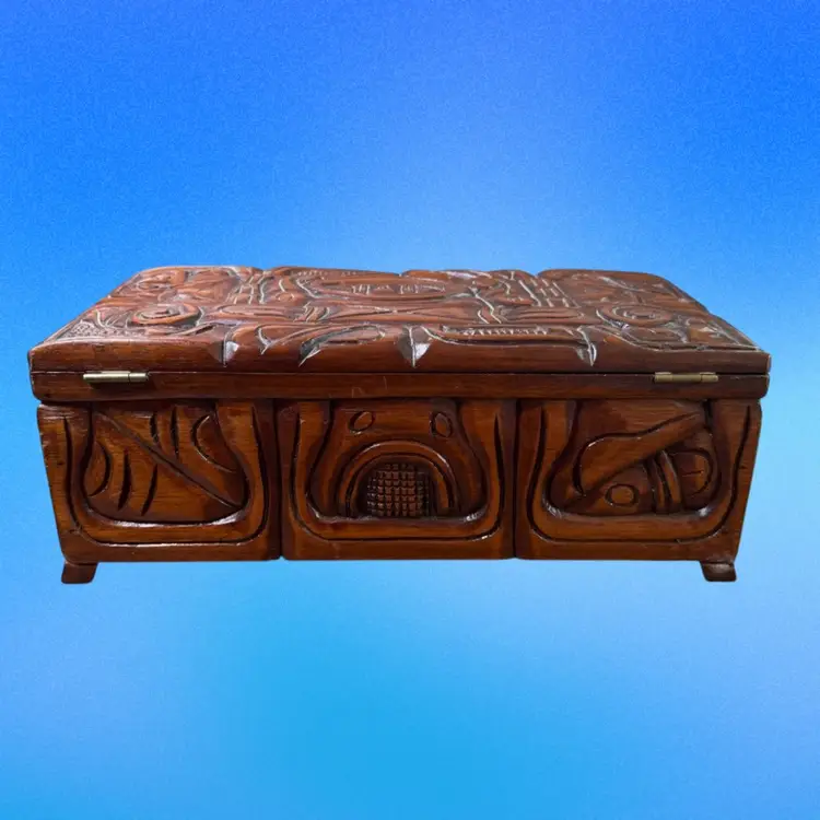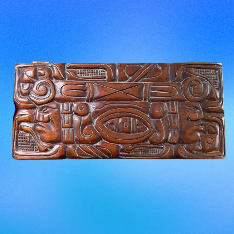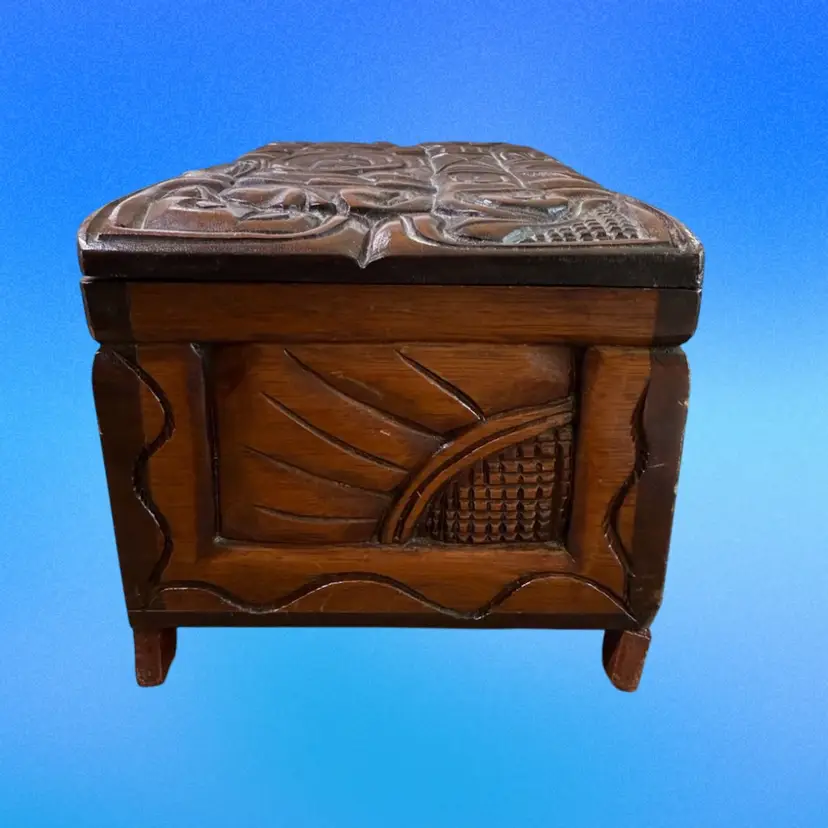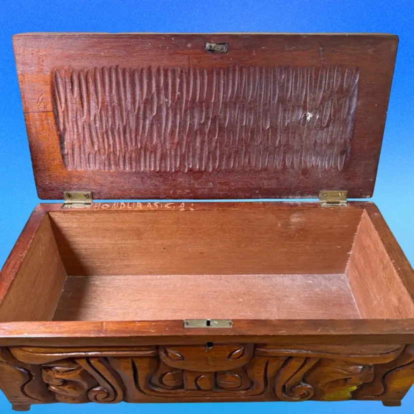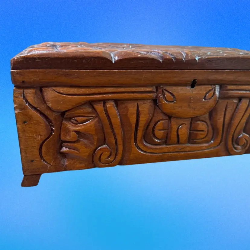 12.5”x5.75”x5”. Beautiful hand carved box, with an abstract/organic motif that incorporates the faces of Mayan warriors. Signed “Honduras, C.A.” on the inside. In pretty good vintage condition - needs a tedious cleaning due to dust in the crevices. Has some minor scratches/nicks throughout. The two back feet are slightly off kilter - one has some white paint on it as well. But still stands fine. Has a key hole but no key.