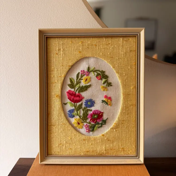 The soft yellow fabric background paired with the delicate white frame gives it a soft, inviting look that will make any room feel cozy and special. The hand-stitched details really stand out, showcasing the love and craftsmanship that went into creating this unique piece.
