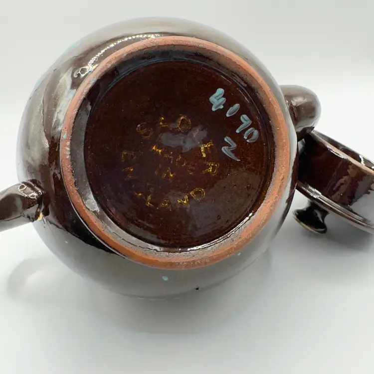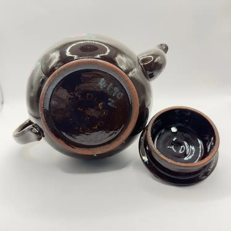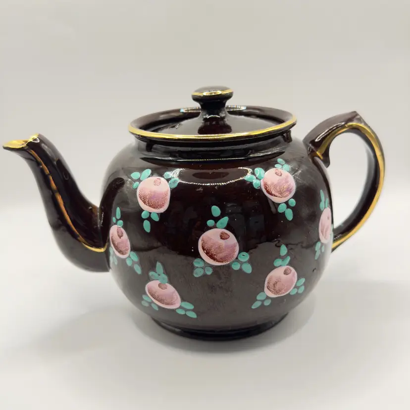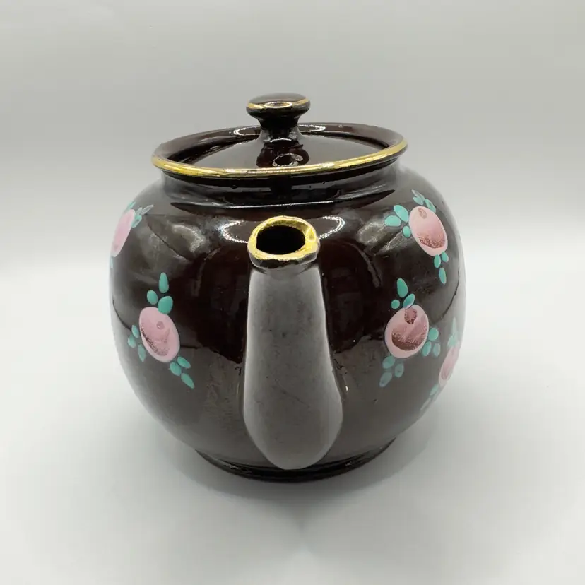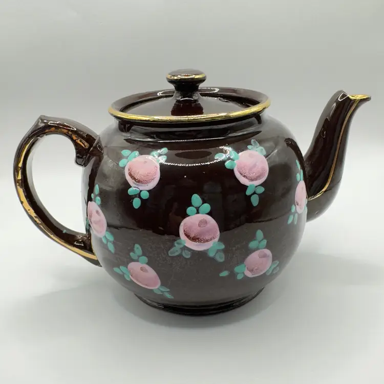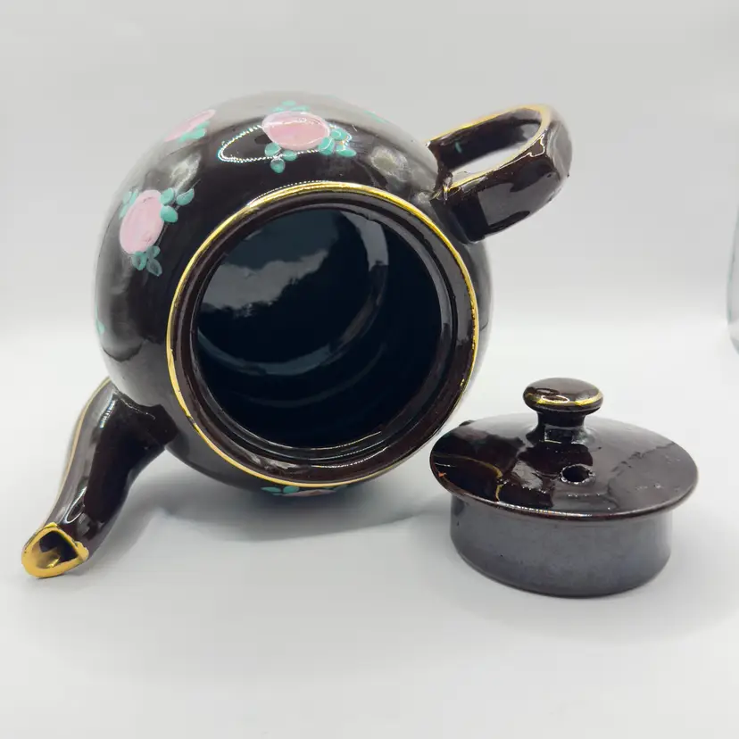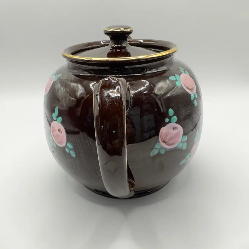 Add a touch of vintage charm to your tea time with this delightful hand-painted ceramic teapot. Featuring a rich dark brown glaze adorned with pink floral designs and elegant gold accents, this teapot is perfect for both display and use. In excellent condition with no chips or cracks. Measures 5.5x8.25 inches. Weighs 3lbs.
