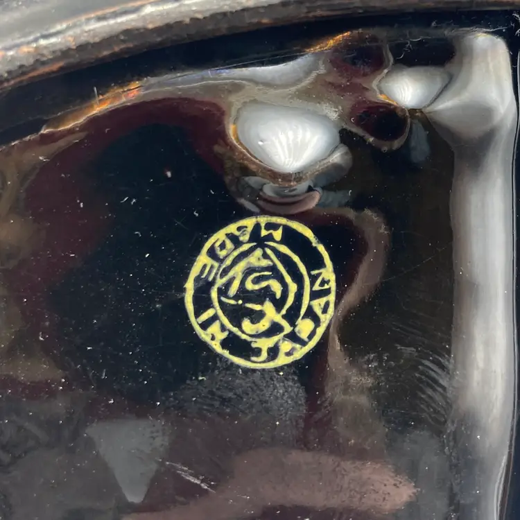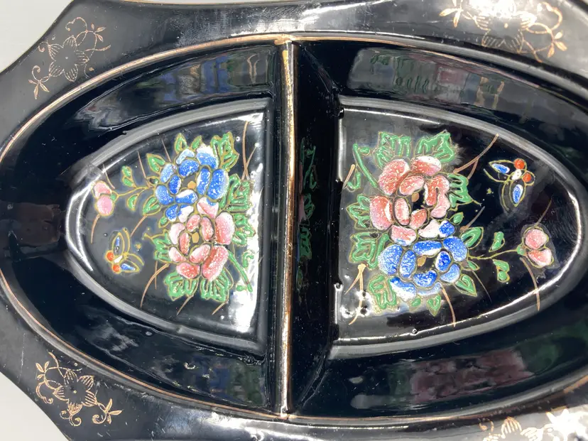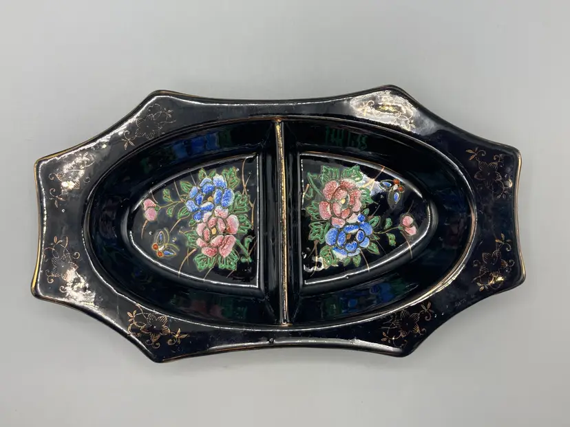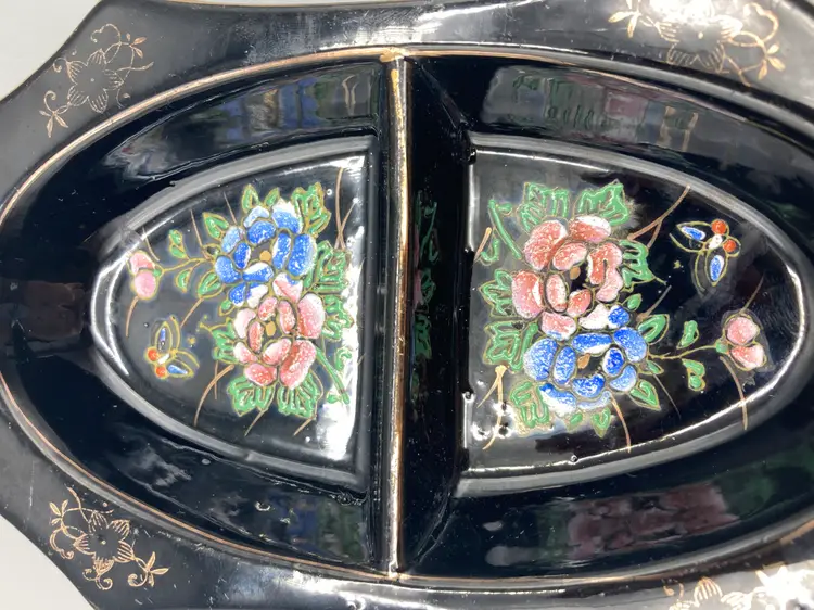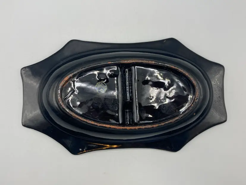This dish is in good condition. It does have some paint loss and some minor chipping around the base where it sits, clearly seen in pictures. This dish measures approximately 8 1/2" x 4 3/4" and 1 1/4" high.
