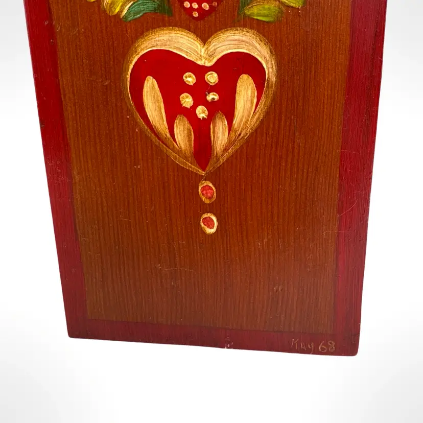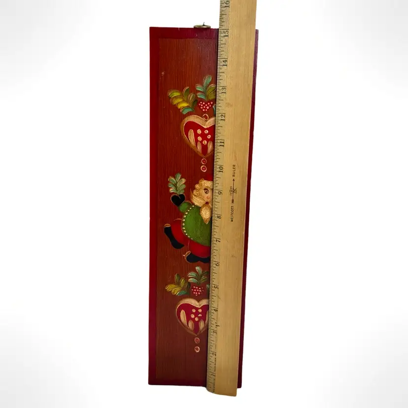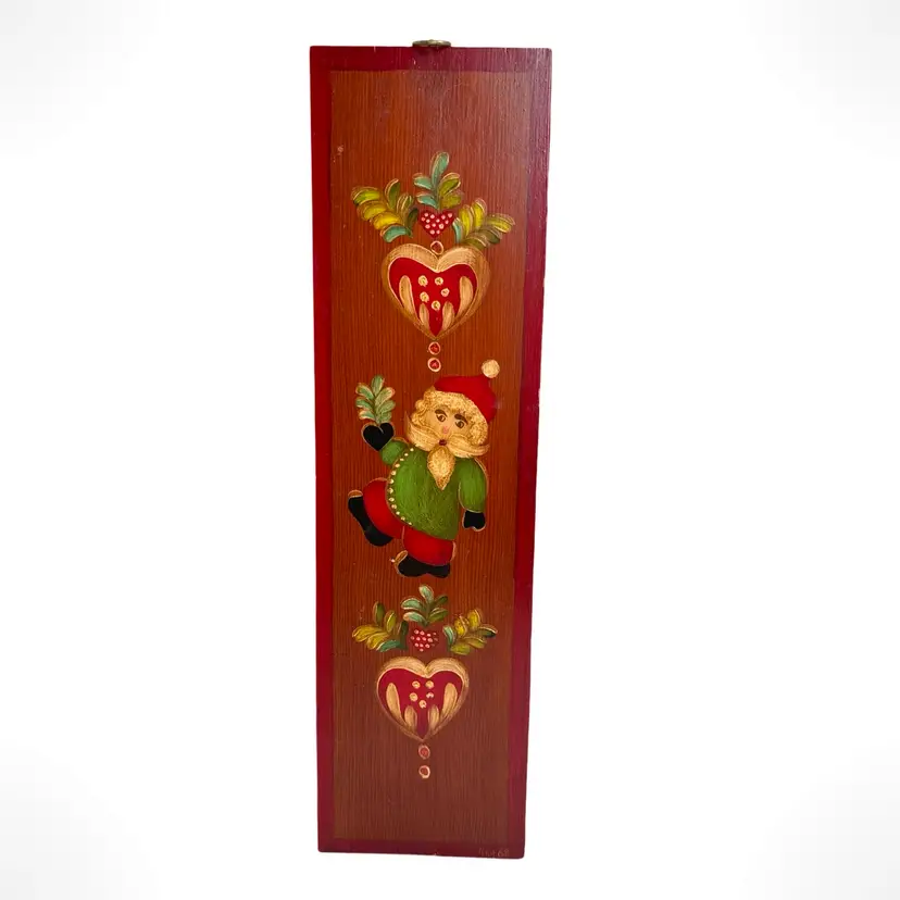 Unique vintage hand painted toleware folk art Santa on wooden board, signed Key 68. Measures approx. 15” tall.