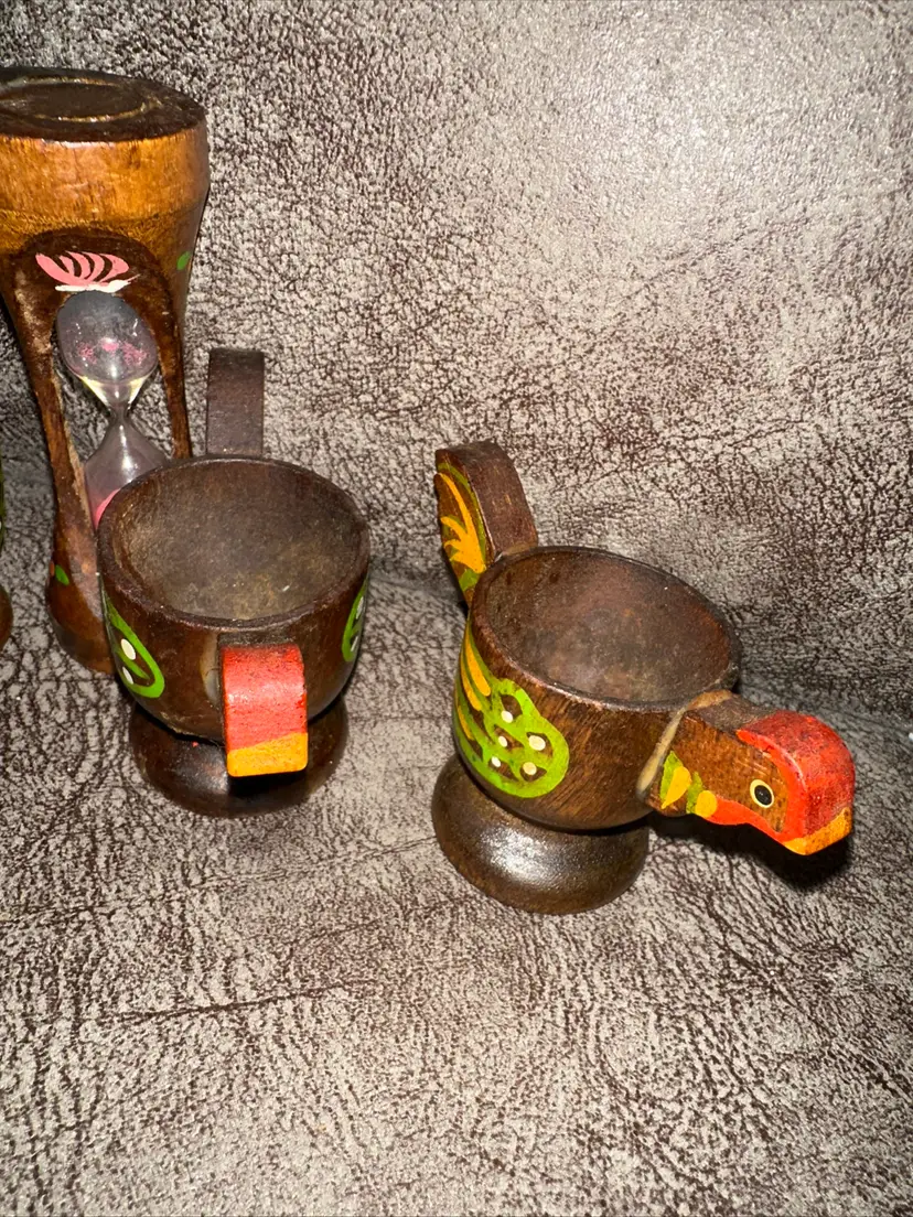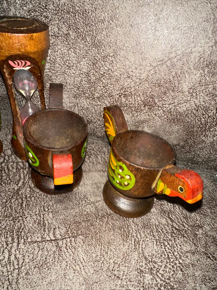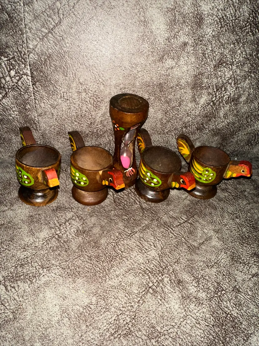 Vintage hand painted wood chicken egg cups and hourglass timer set of 5
