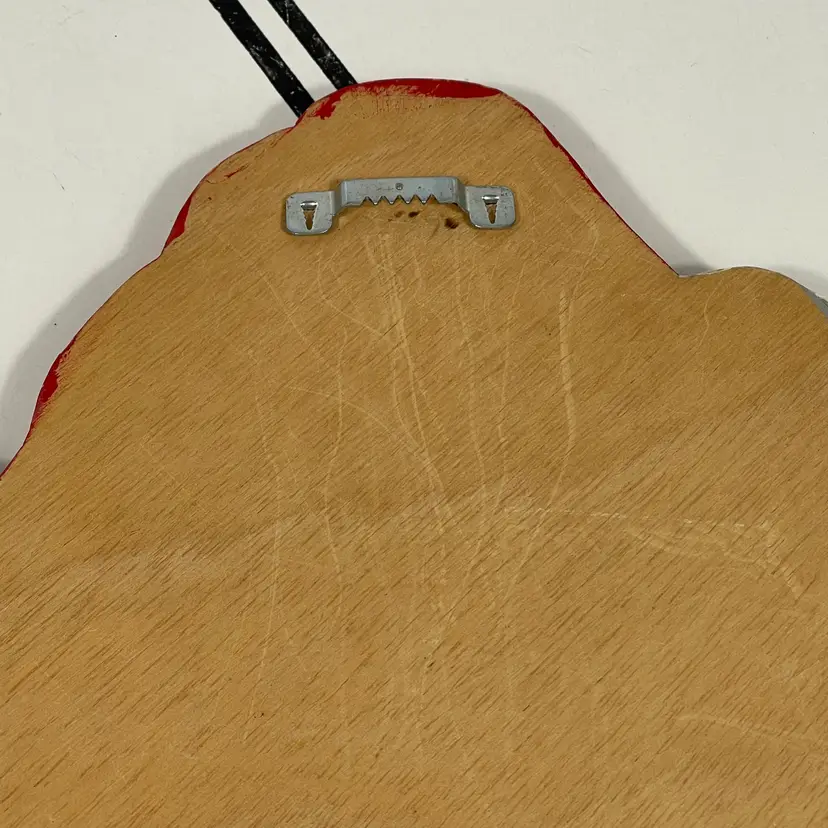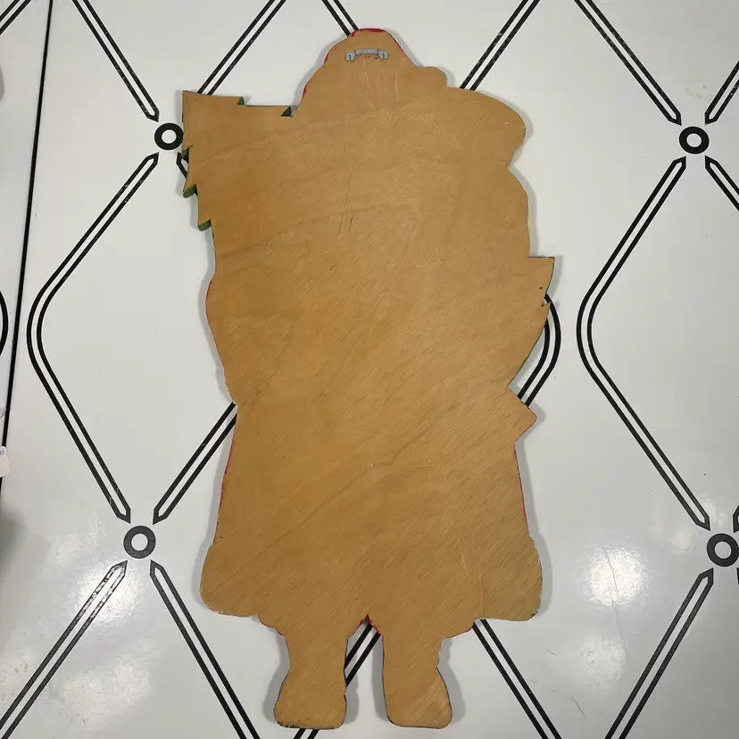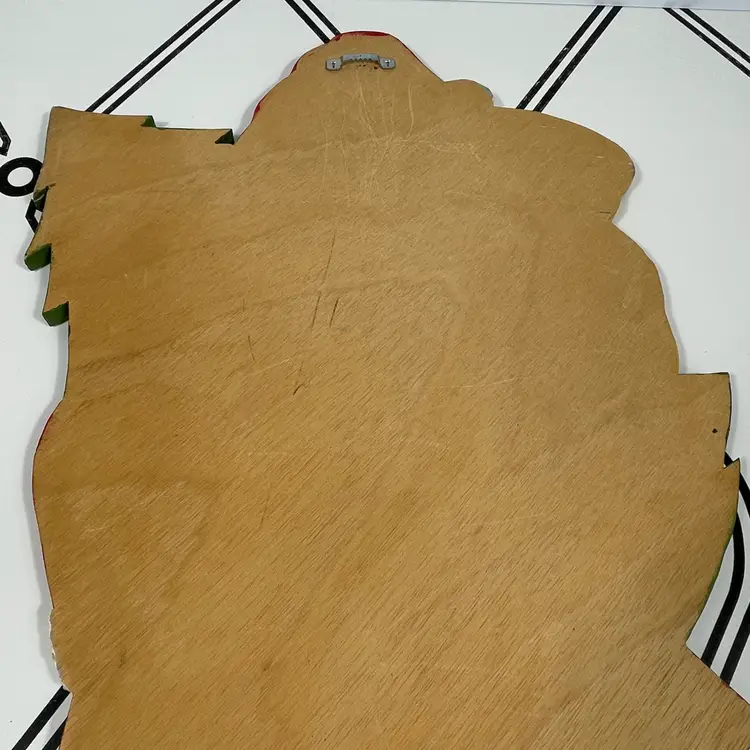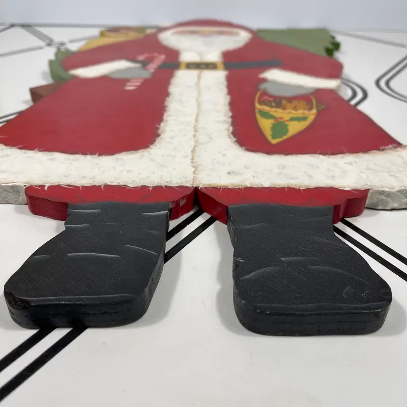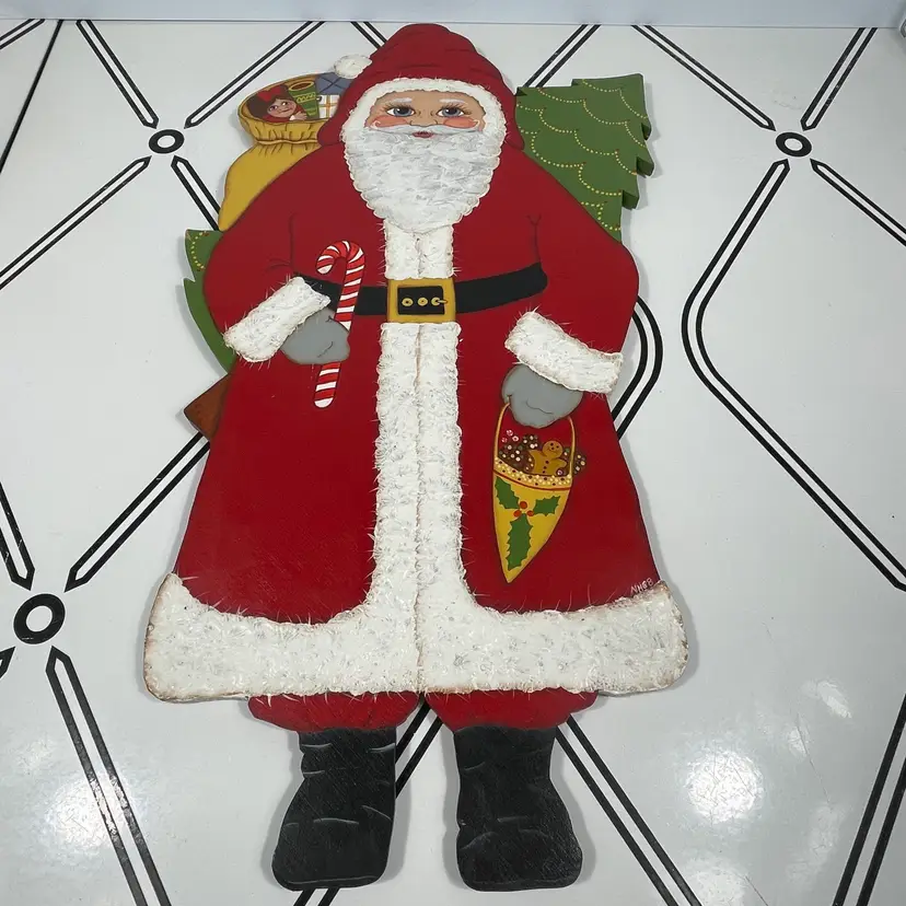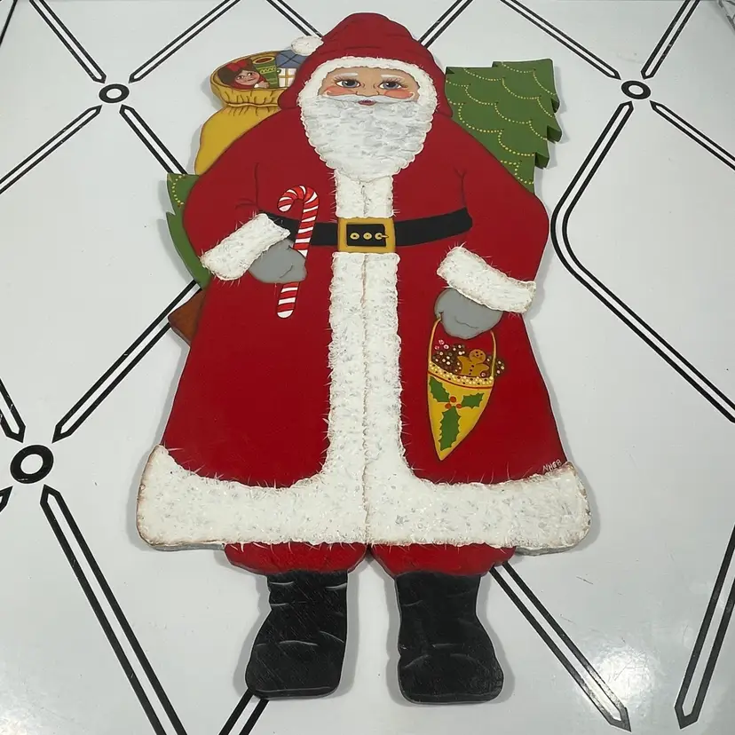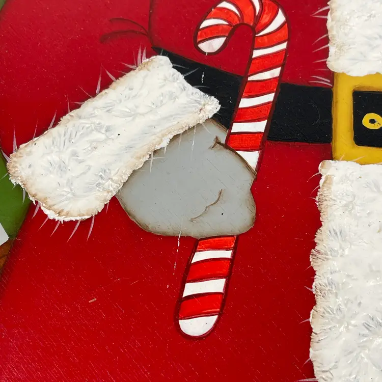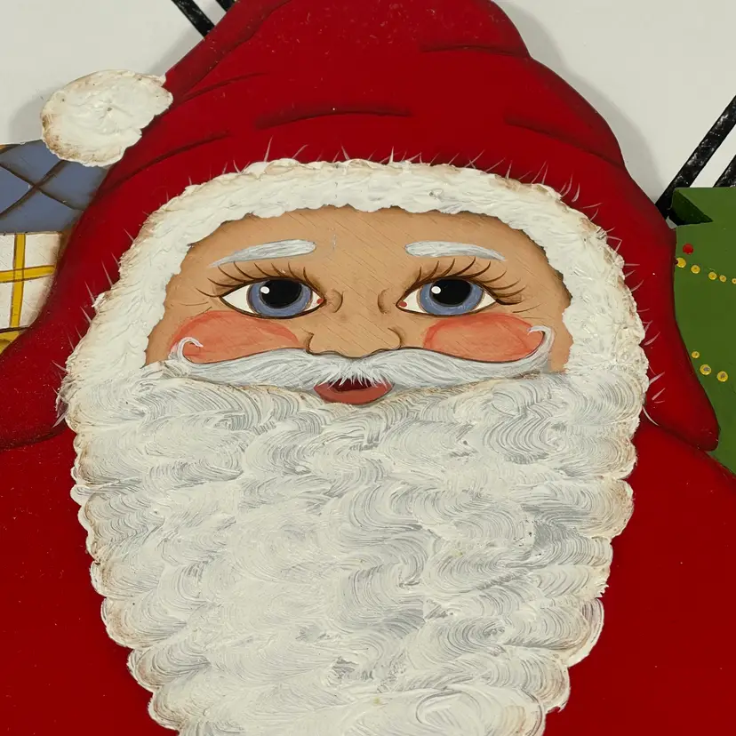 Add a touch of festive charm to your holiday décor with this delightful vintage hand-painted wooden Santa wall hanging. Santa is depicted in his classic red suit with white trim, carrying a candy cane and a festive holiday cornucopia, with a decorated Christmas tree and toy sack peeking from behind. His rosy cheeks, bright blue eyes, and detailed features give him a warm, nostalgic look that captures the magic of Christmas.