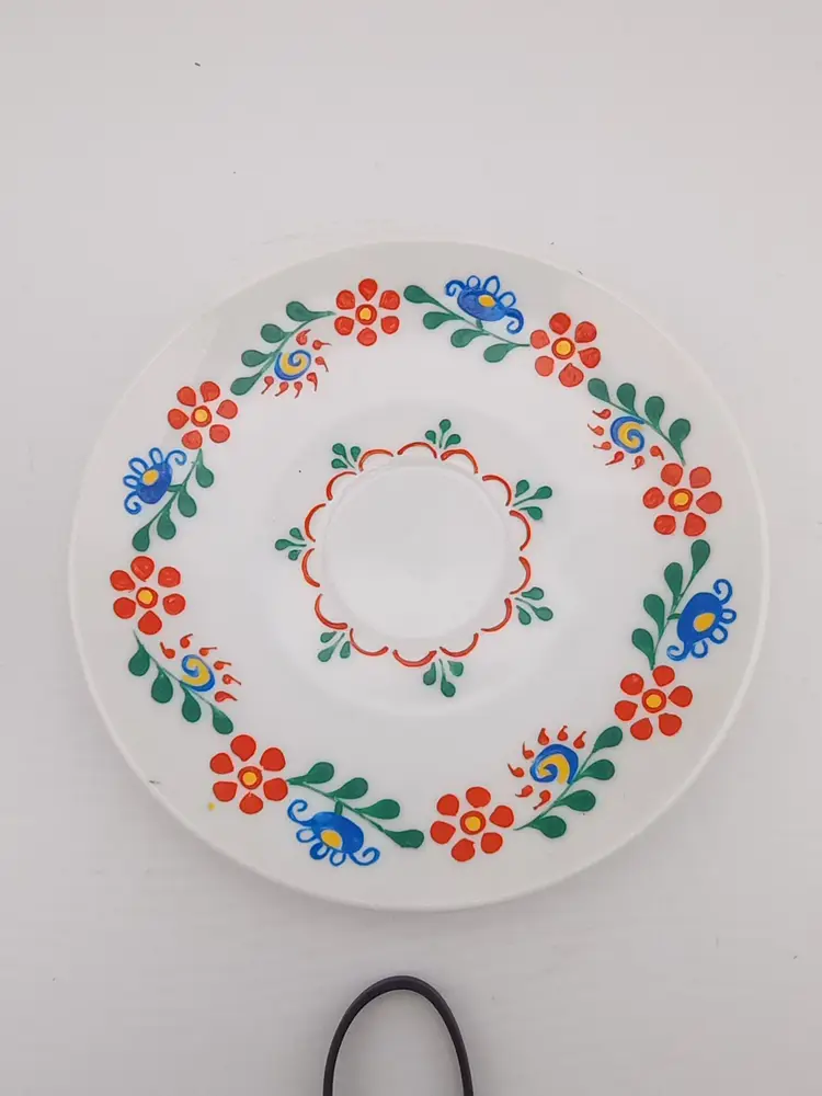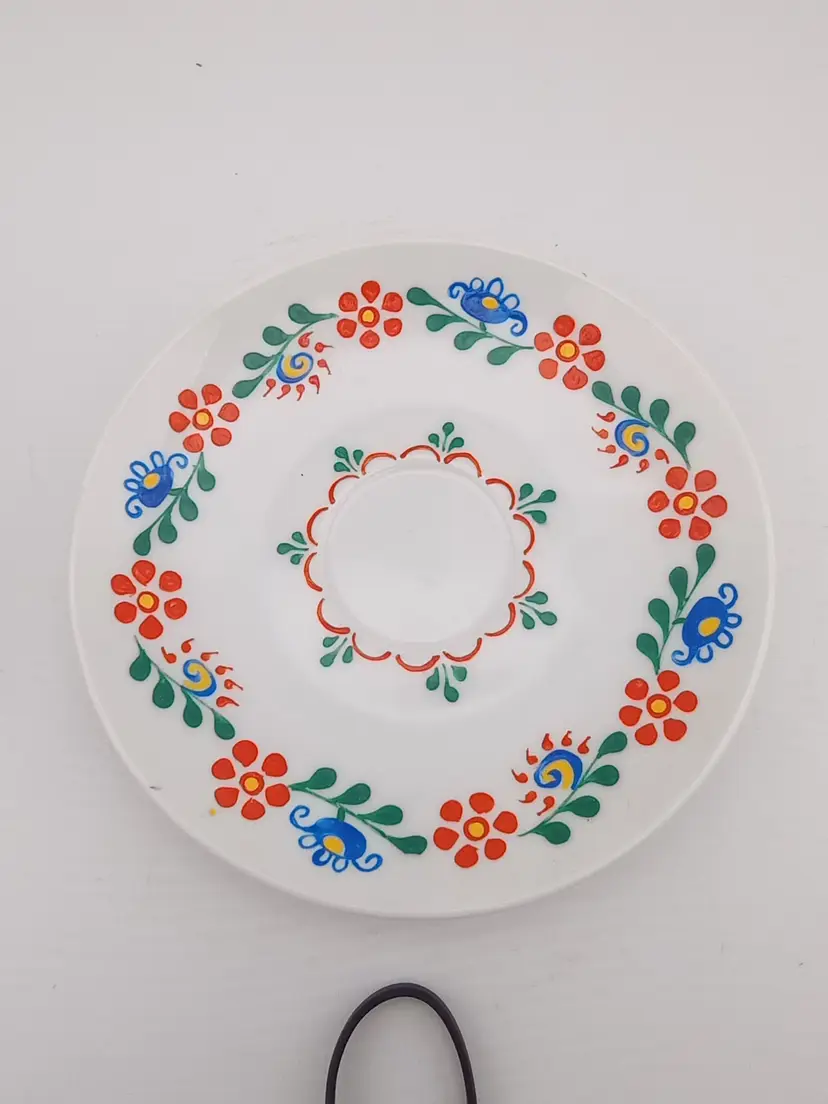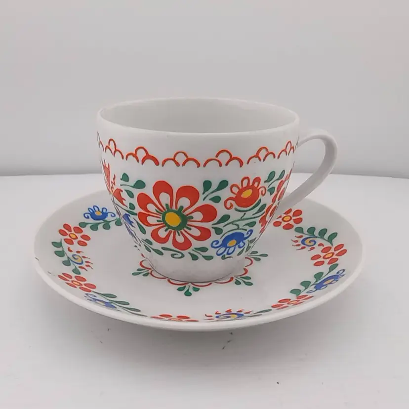 This is a beautiful handpainted cup and saucer. It matches the serving platter I have listed from 1994. I believe it's Polish. It's in excellent vintage condition with no chips or cracks.