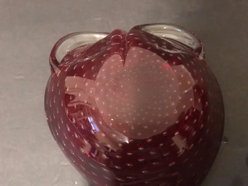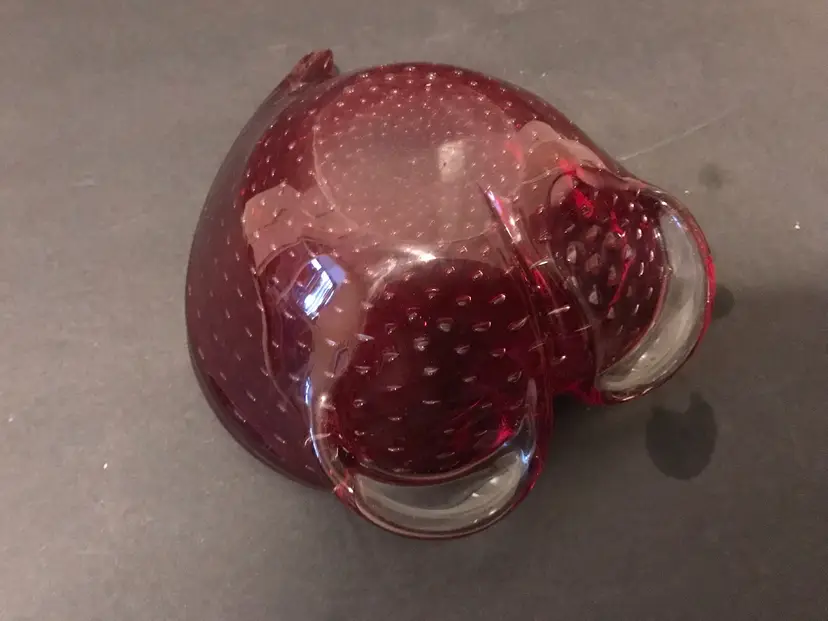 Vintage Heart Shaped Art Glass Bowl Ash Tray candy or trinket dish Controlled Bubbles Red Very good used condition with no chips or cracks. Measures approx. 8”x7”x2”