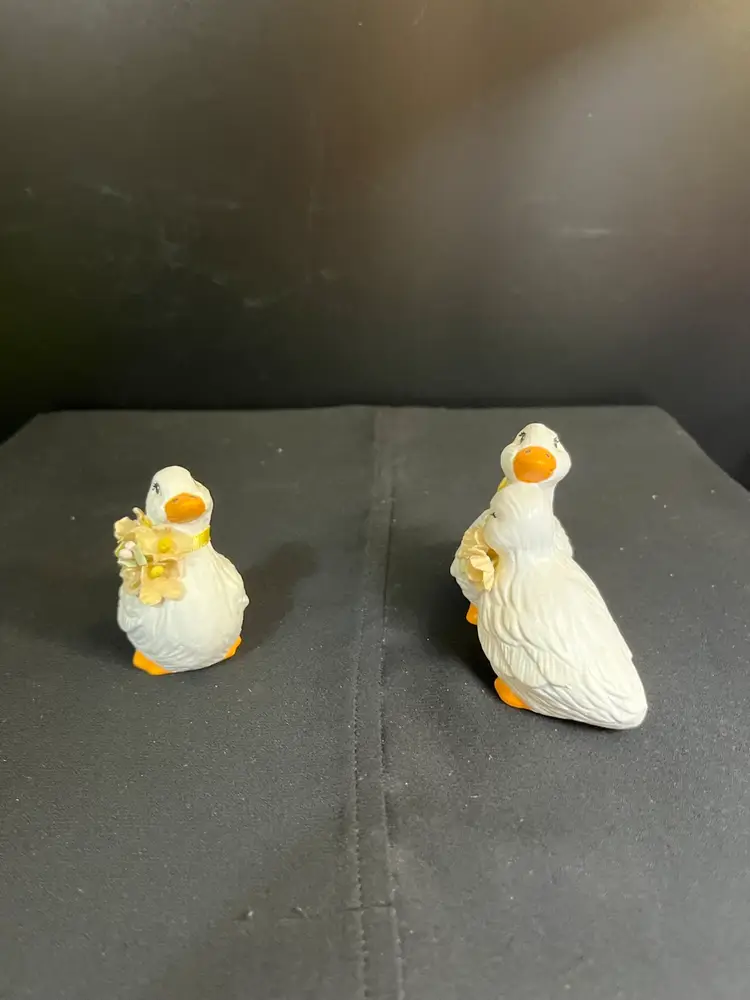These are painted very well-Eyes are adorable. Love the ribbon & flowers-adds just the right amount of pop. There are no chips or cracks, and are in great vintage condition. The pair measures approx 2.75" x 3.5", The single measures approx 2.5"h, 2"W, together they weigh approx 3.0 Oz