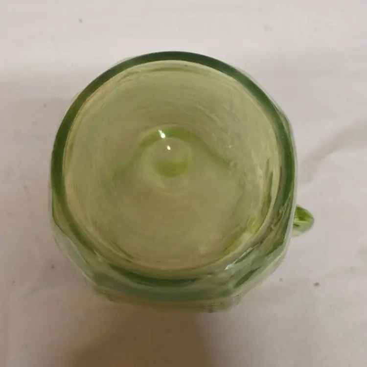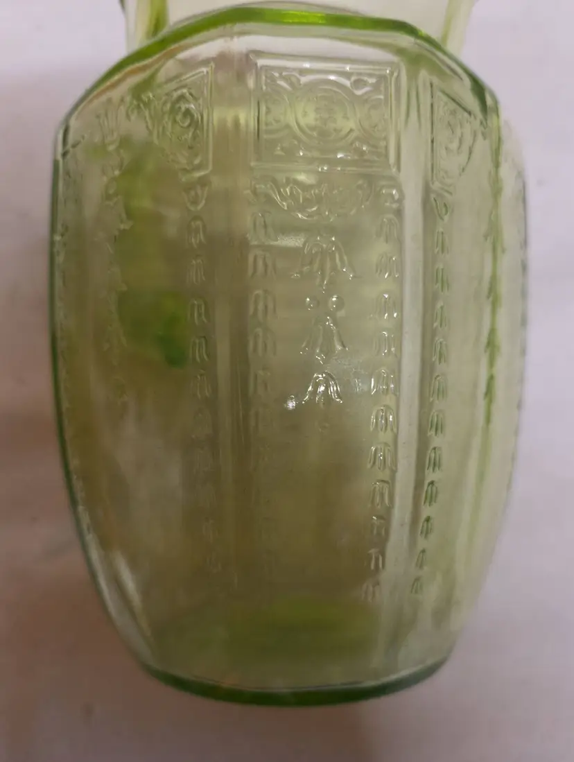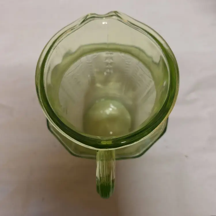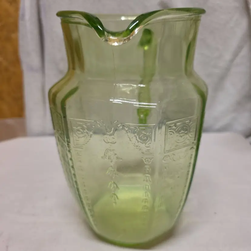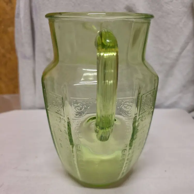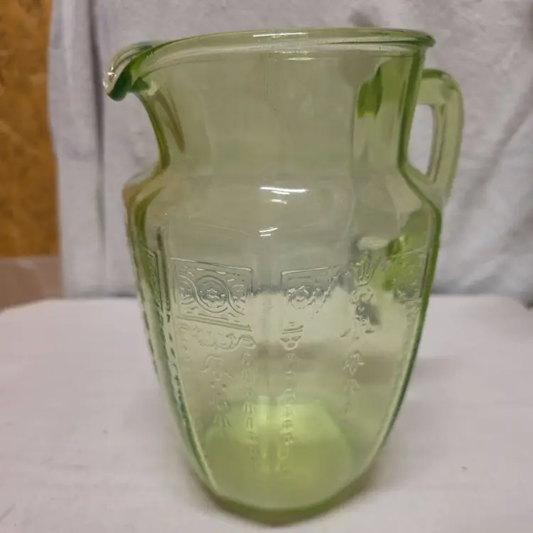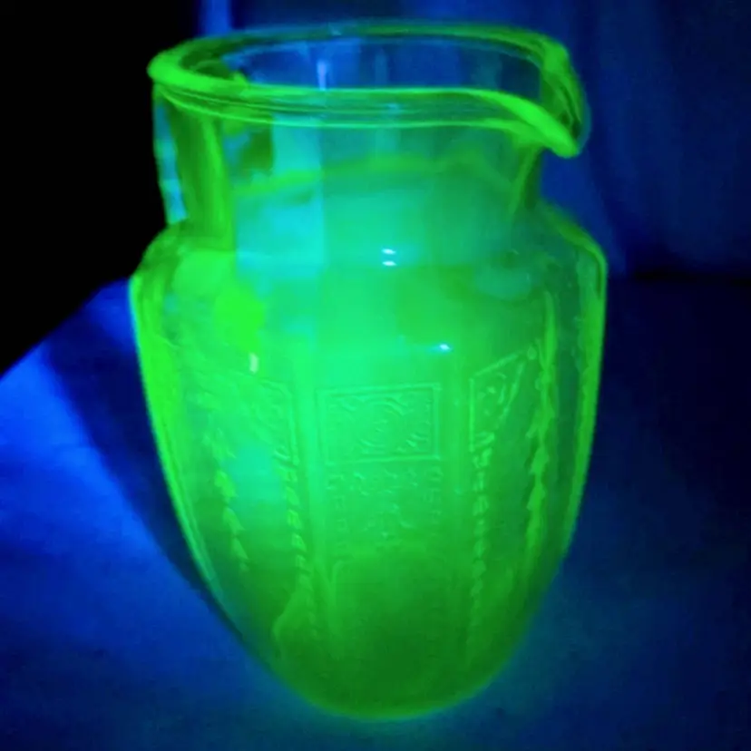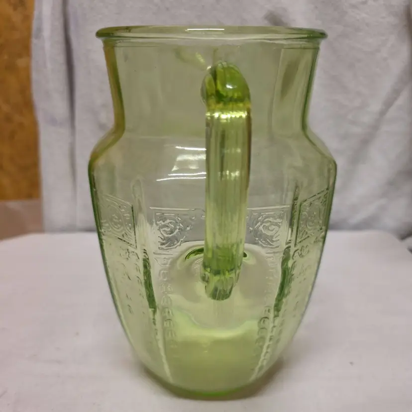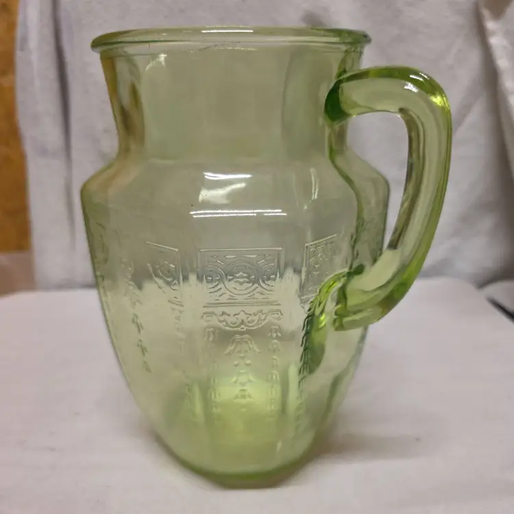 The Vintage Anchor Hocking Uranium Glass "Princess" Pattern 1930s 60 oz Pitcher is a unique and beautiful piece of glassware that glows under black light due to its uranium content. Handmade in Ohio by Anchor Hocking in the 1930s, this pitcher features a decorative all-over pattern with a flower theme, typical of the Great Depression era. With a capacity of 60 oz and a height of 8.5 inches, this pitcher is not only functional but also adds a touch of vintage charm to any table setting. Made with a shiny finish and refrigerator-safe, this rare find is a true collectible item for glassware and uranium enthusiasts.