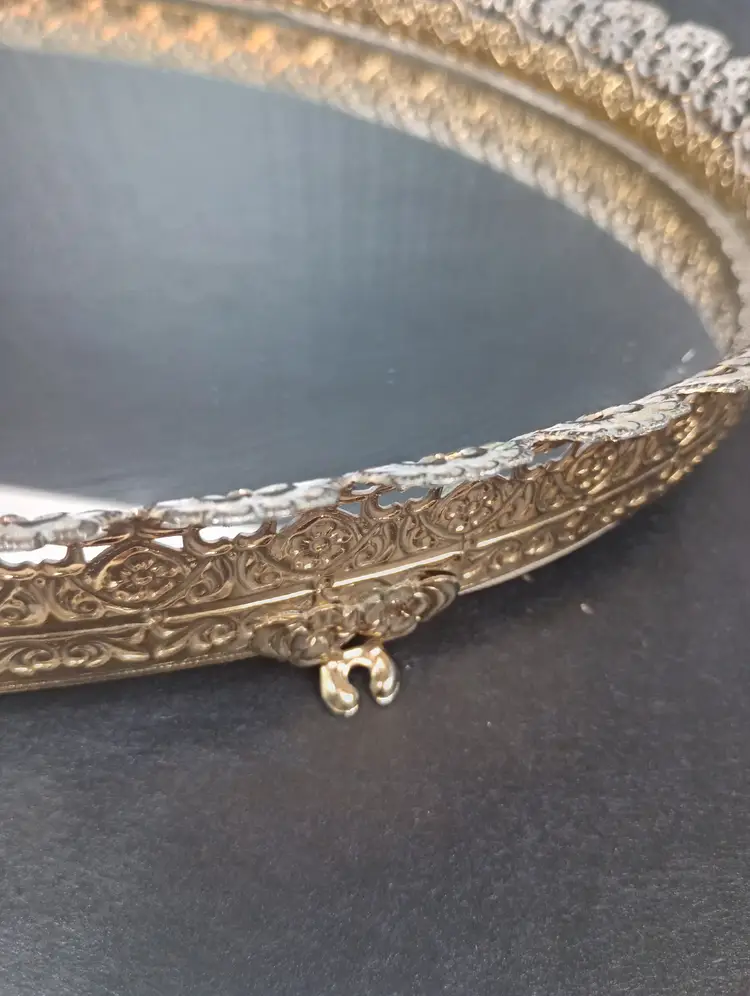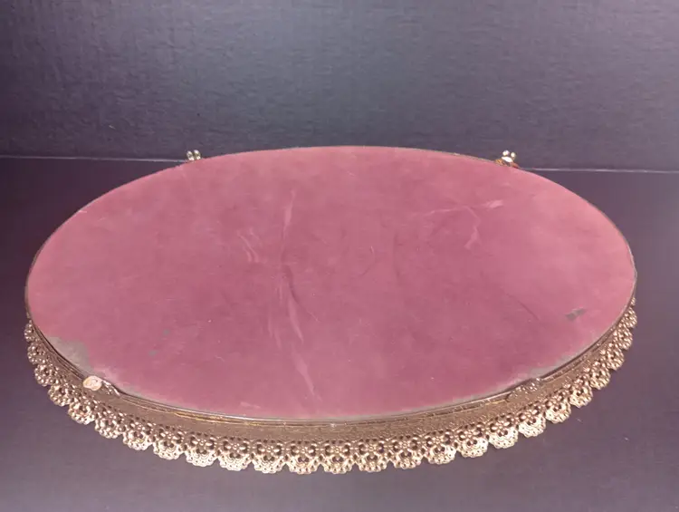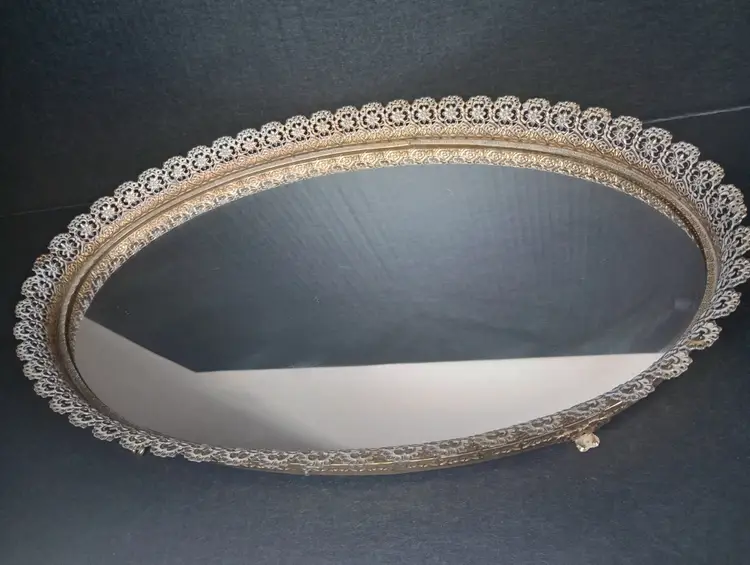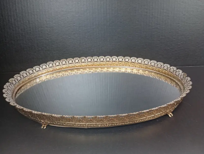 Vintage Hollywood Regency Mid Century 17 in wide oval footed mirrored vanity tray.