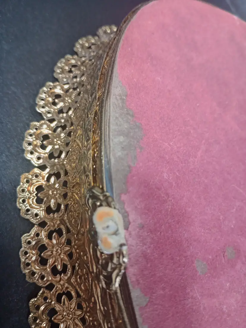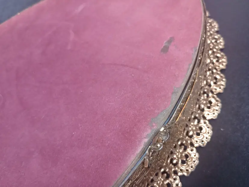 The underside of the tray is lined with maroon velvet. Some discoloration. Note photos.