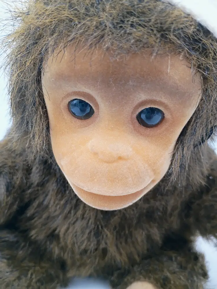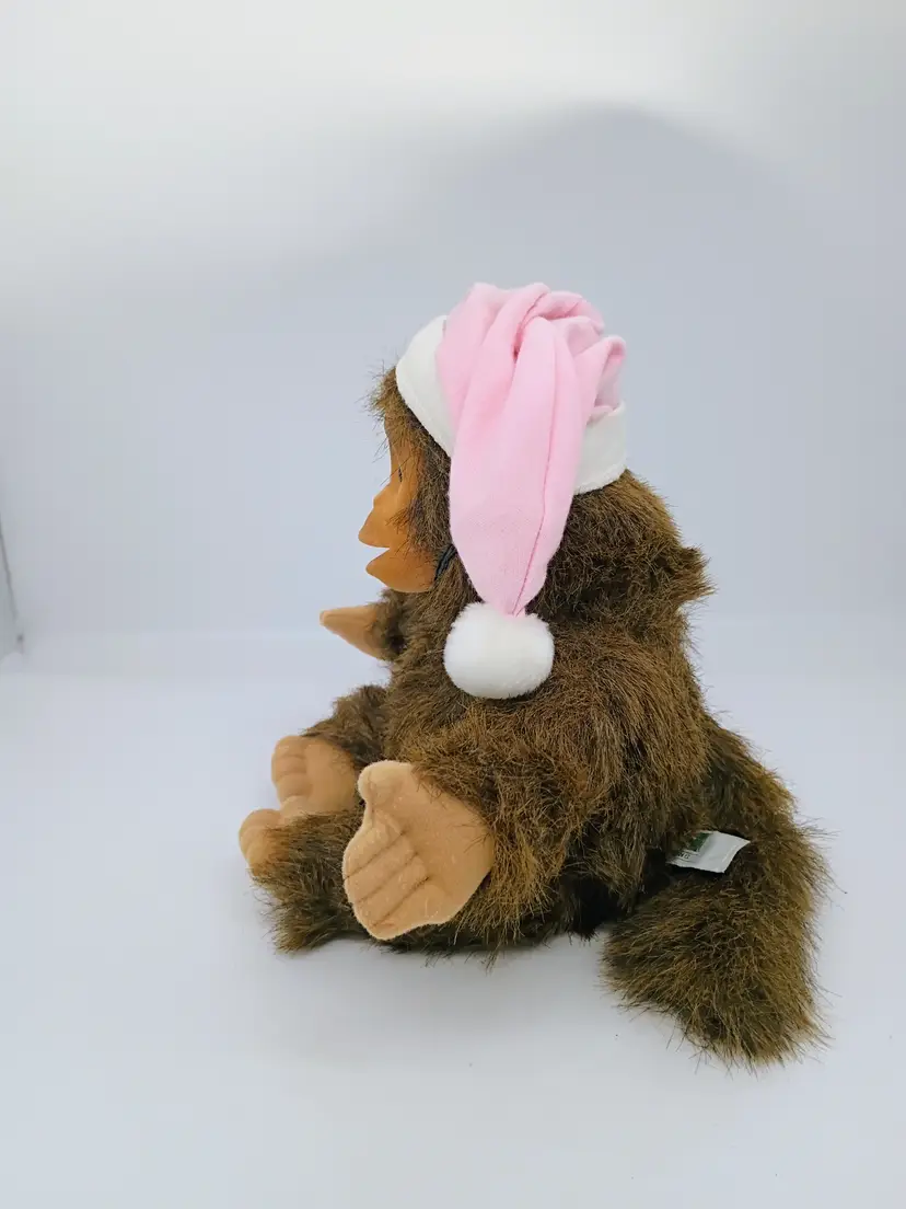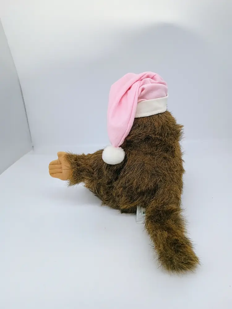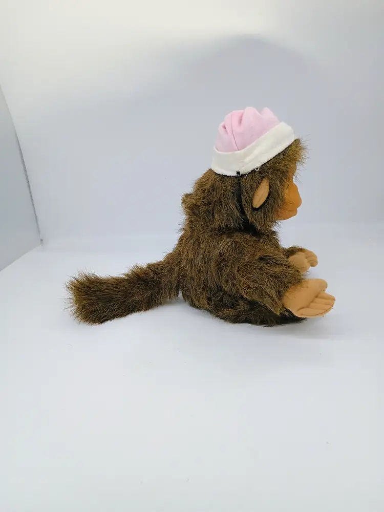 Vintage Hosung Baby Monkey Chimp Plush Flocked Soft Rubber Face Stuffed Animal Pink Hat. This is 9 inches tall sitting. The hat can be removed. Circa 1990-1994 This is preowned, No rips tears holes stains . No odors. Flocking on rubber face intact. Fur is soft and pliable not matted or crushed. No shedding. This has pink floppy Santa hat. Excellent condition. Ships USPS domestically and UPS International Shipping globally