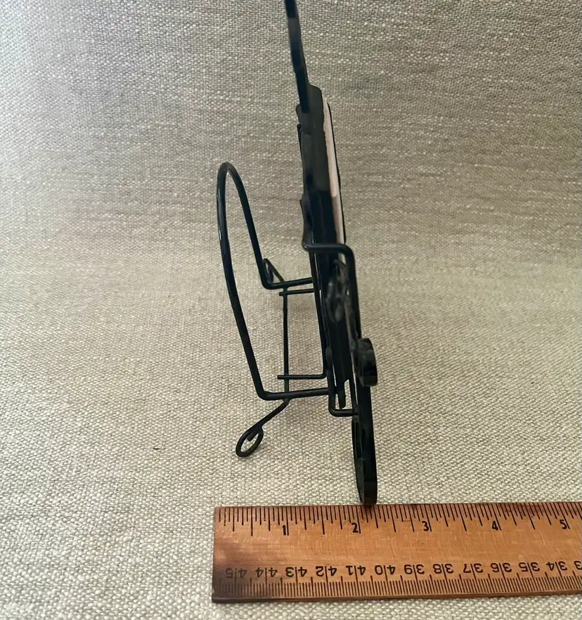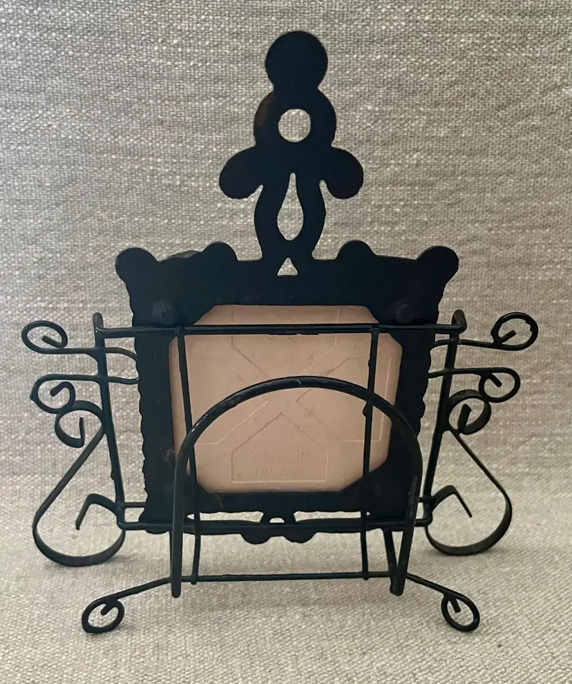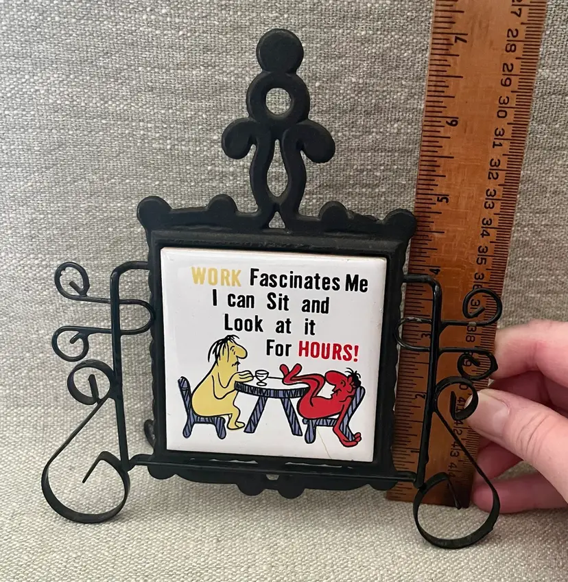This vintage humor black ironwork trivet napkin holder is a unique and kitschy piece that adds character to any kitchen or dining table. The square-ish shape and white multicolor tile design give it a fun and playful look, perfect for everyday use. Made of mixed materials including cast iron, metal, and ceramic, this original piece from the 1970s or very early 1980s is sure to bring a smile for collectors and vintage enthusiasts. Hand wash only to maintain its charm and authenticity ~ the tile appears to have a crack in its lower portion. It may be surface scratch or it may be through to the other side, yet isn’t seen as it could be behind the metal. Made in Taiwan with an Olympic Rings symbol above.