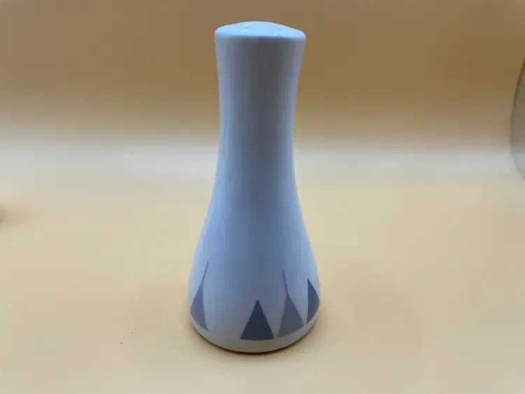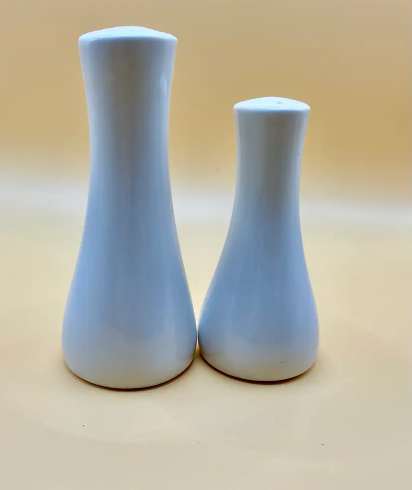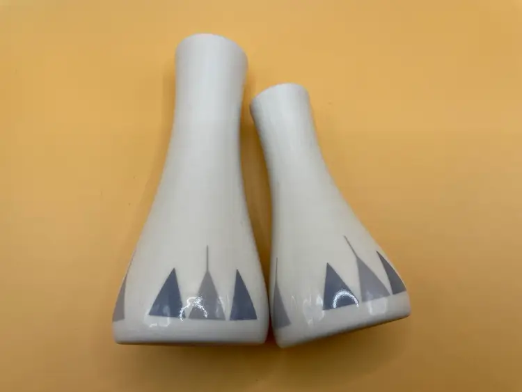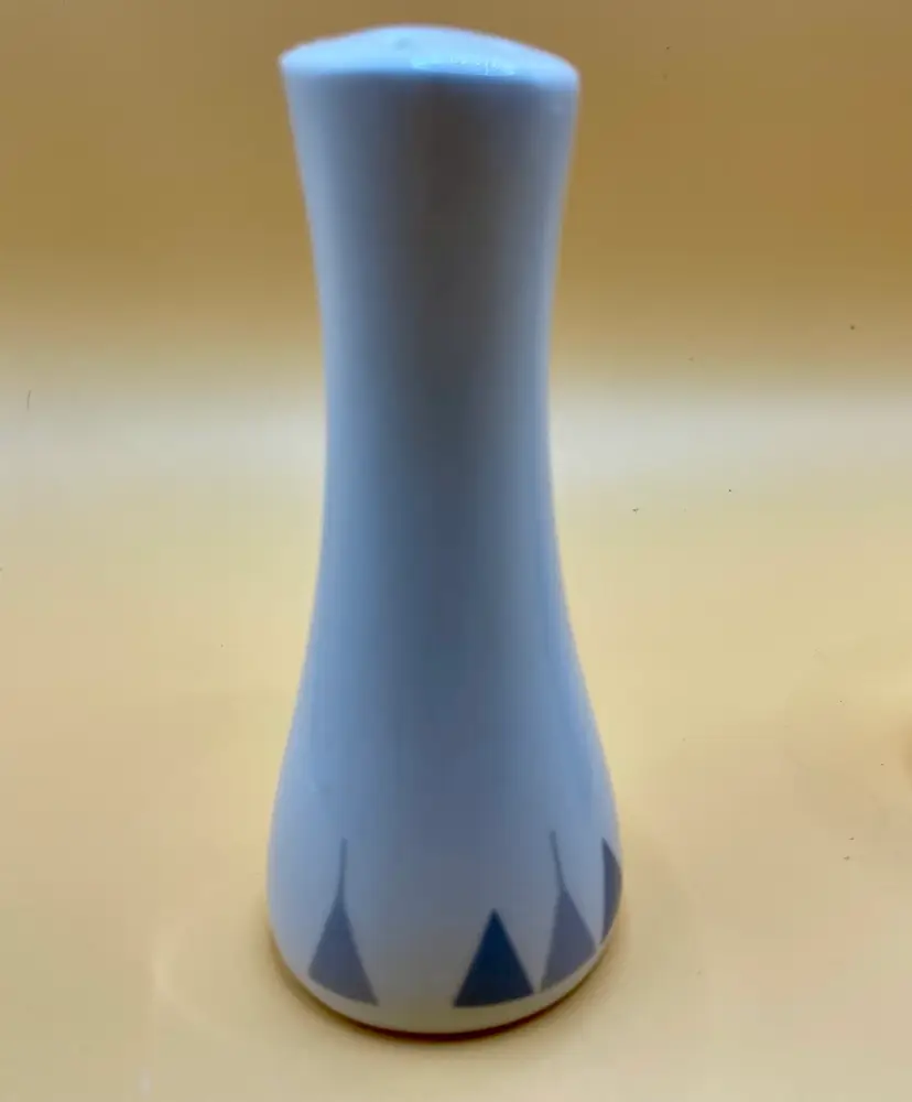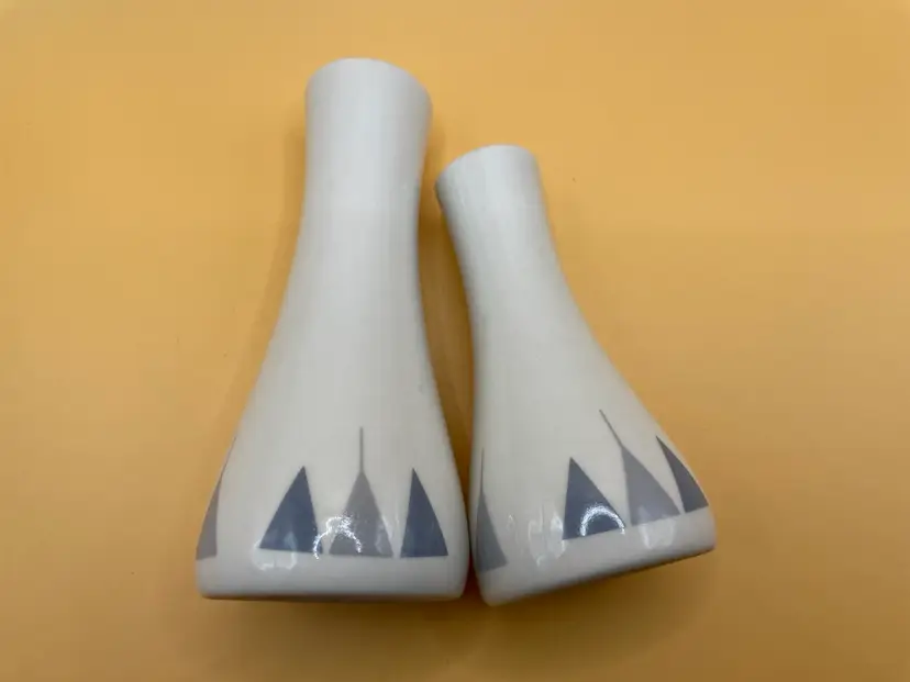 The Vintage Impromptu Iroquois Ben Seibel Pyramids Salt & Pepper Shakers from the 1960s are a set of two porcelain items featuring a geometric pattern of pyramids in white and grey colors. Made in Syracuse, New York, these hourglass-shaped shakers with glossy finish and cork stoppers reflect the Mid-Century Modern style. Standing at a height of 4.5" for the salt shaker and 3.75" for the pepper shaker, these original pieces are a decorative and functional addition to any dining table or kitchen collection.