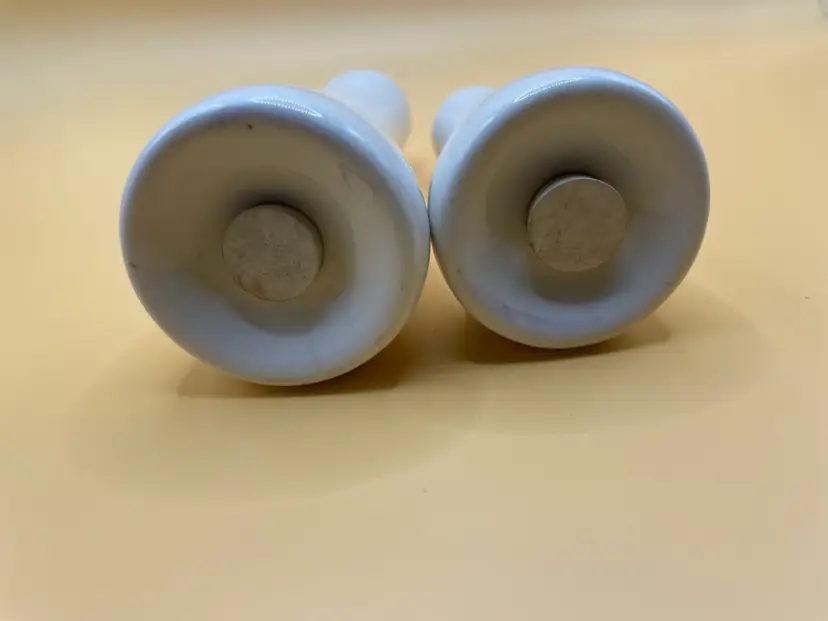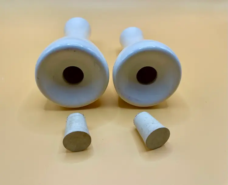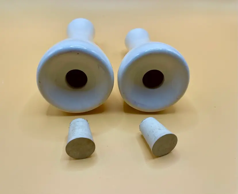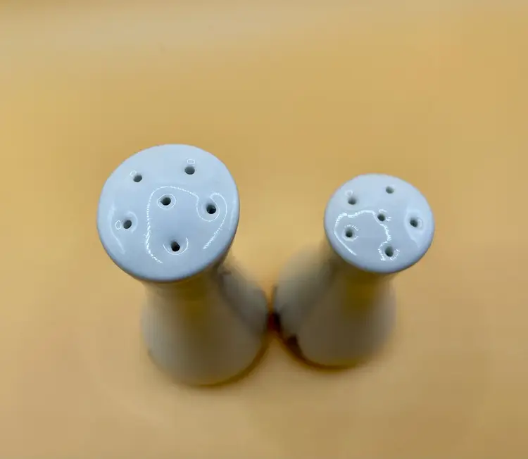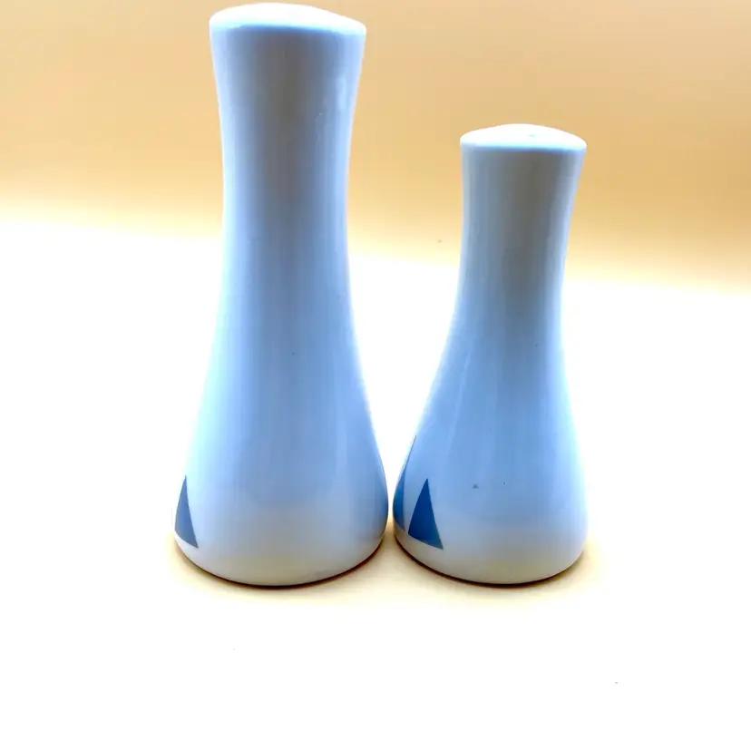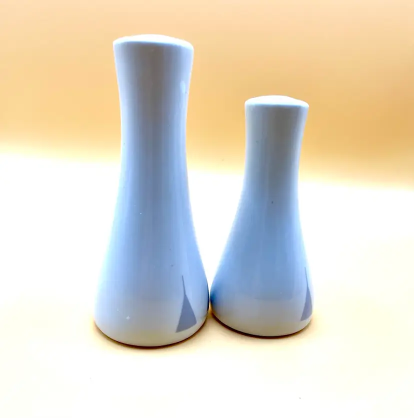The Vintage Impromptu Iroquois Ben Seibel Pyramids Salt & Pepper Shakers from the 1960s are a set of two porcelain items featuring a geometric pattern of pyramids in white and grey colors. Made in Syracuse, New York, these hourglass-shaped shakers with glossy finish and cork stoppers reflect the Mid-Century Modern style. Standing at a height of 4.5" for the salt shaker and 3.75" for the pepper shaker, these original pieces are a decorative and functional addition to any dining table or kitchen collection.