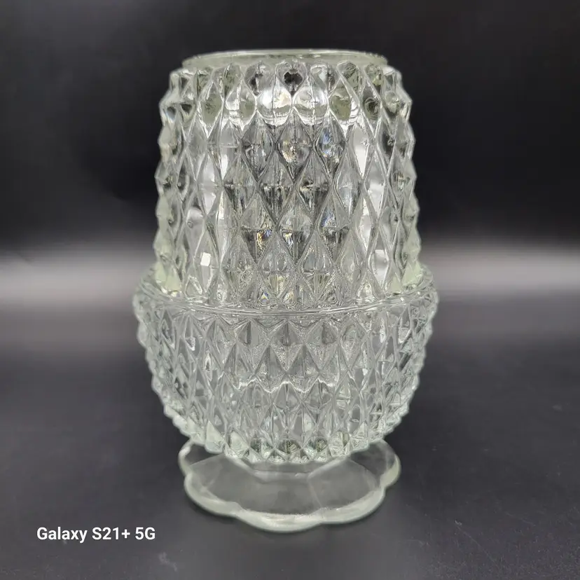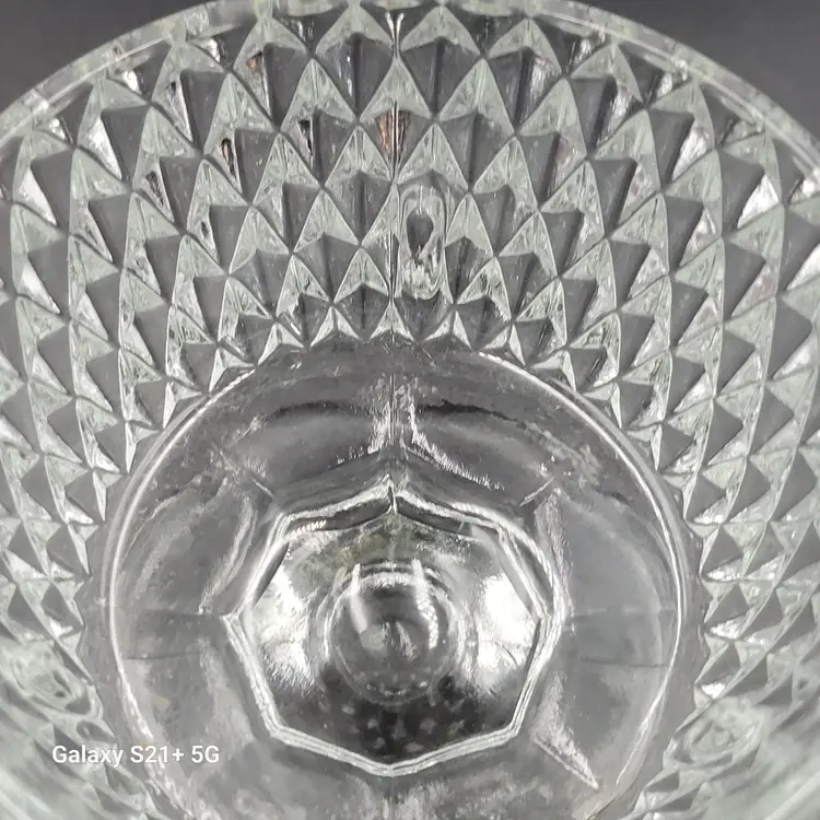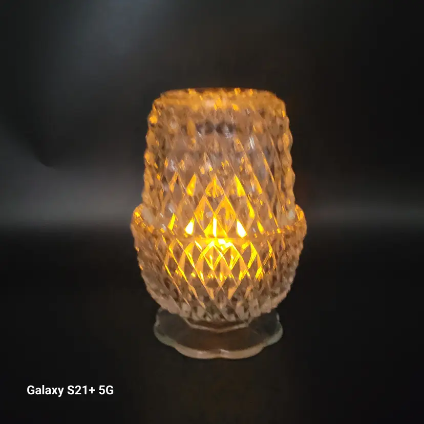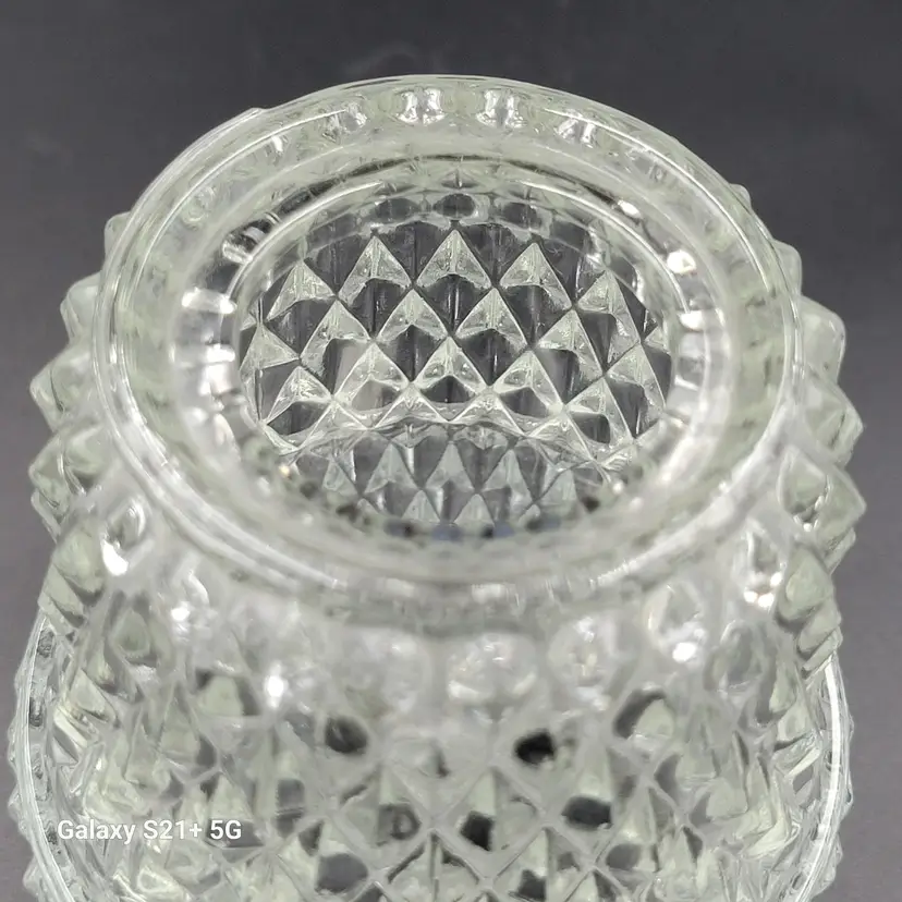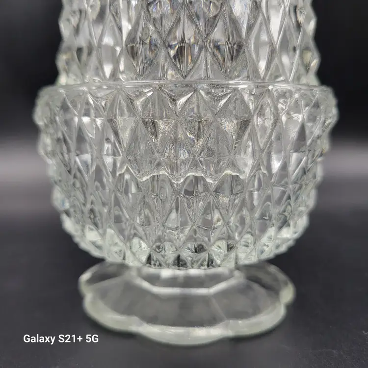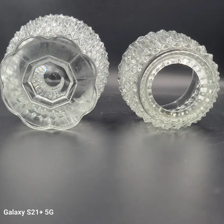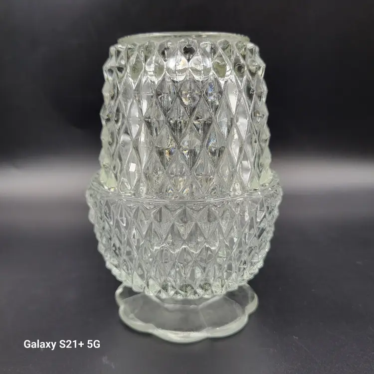 I believe this diamond point, footed clear glass 2-piece fairy lamp was made by Indiana Glass. There are no stickers or maker marks on this.