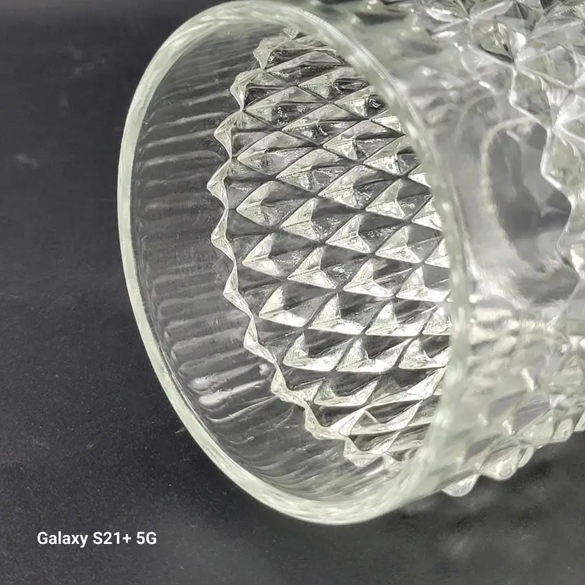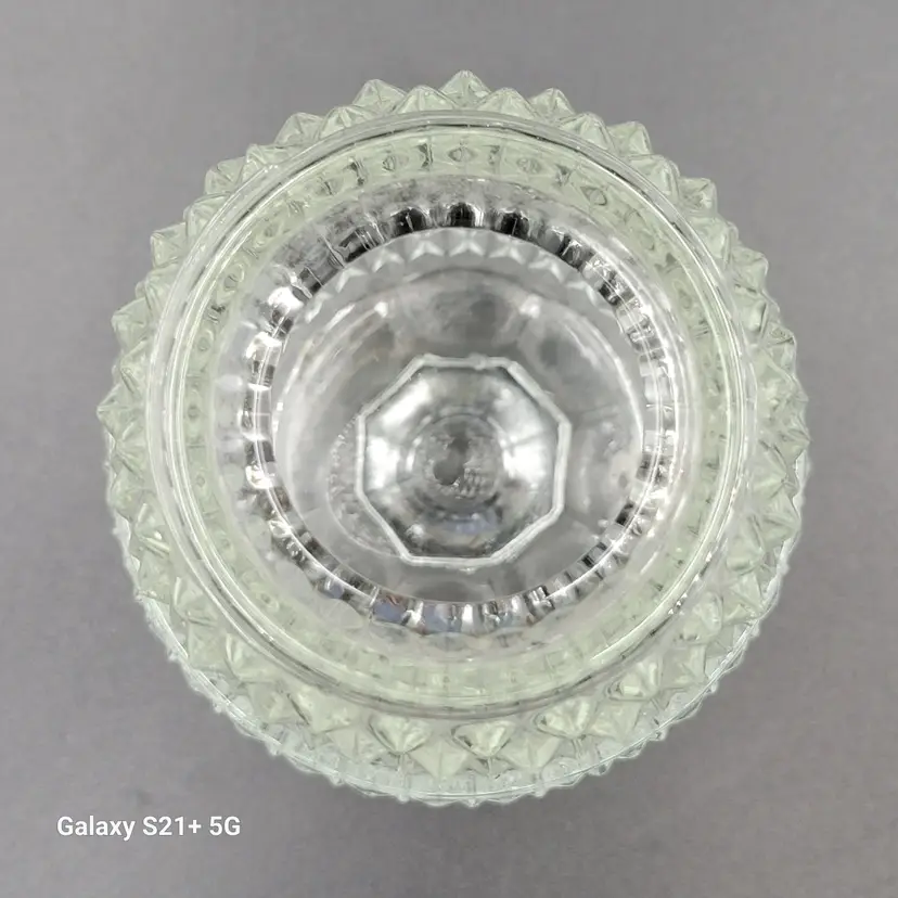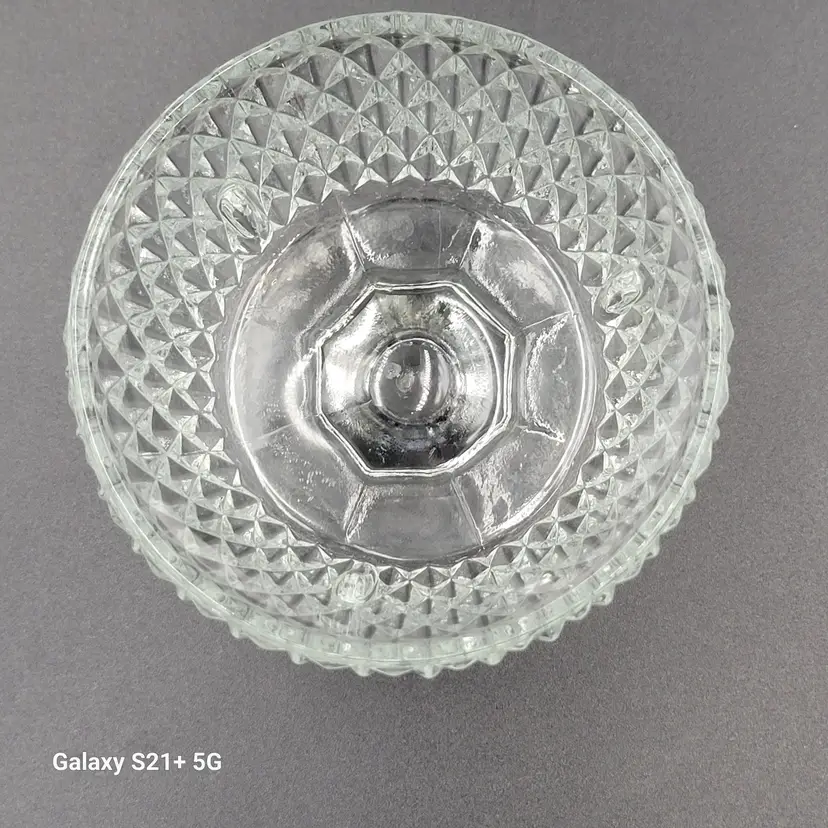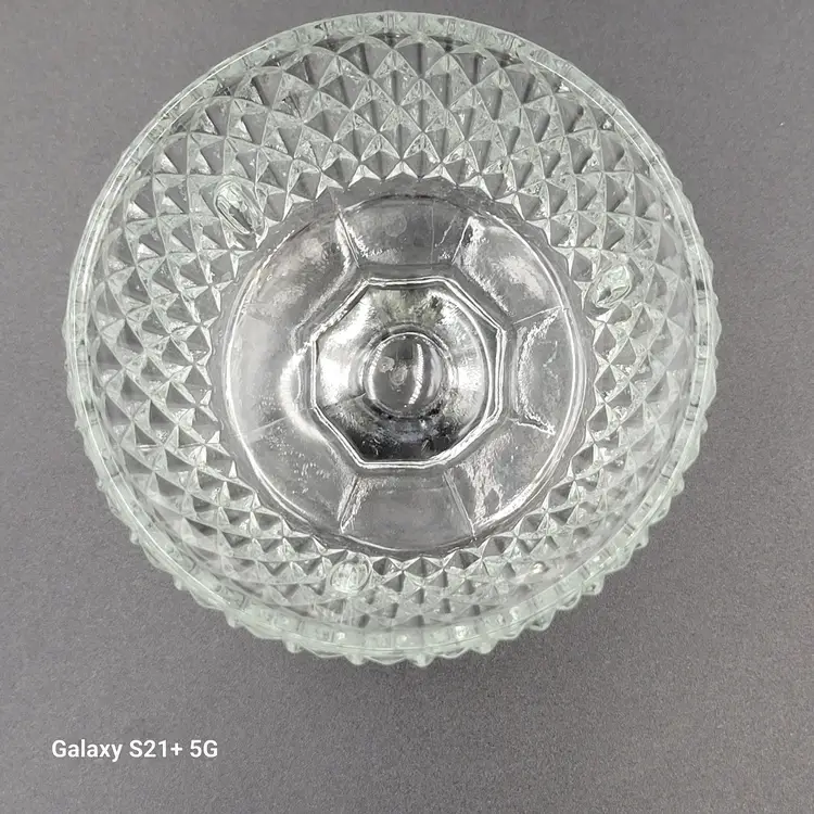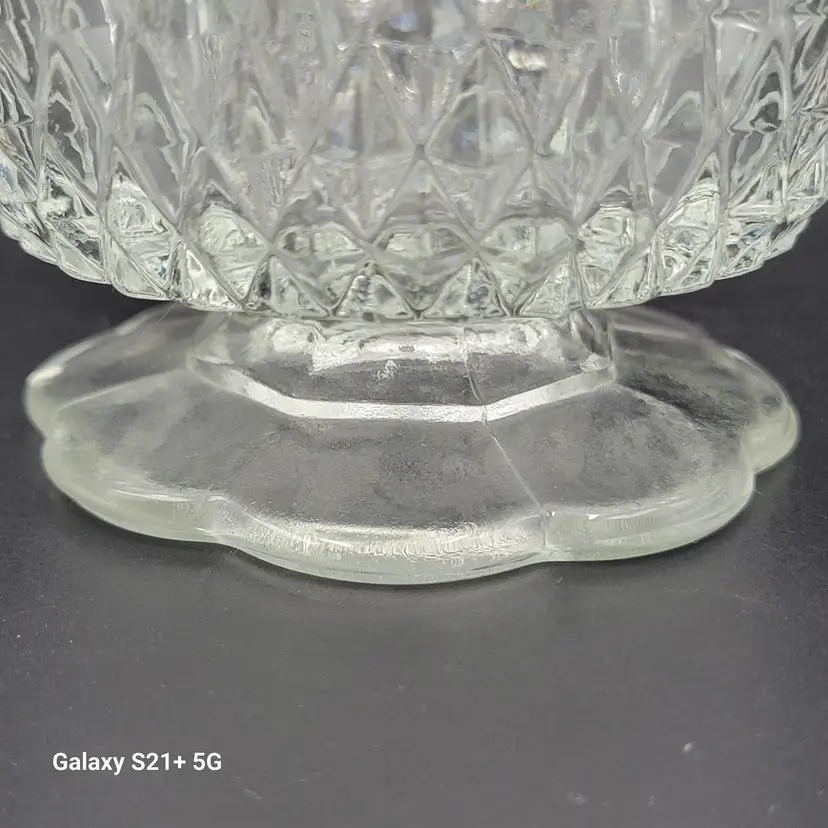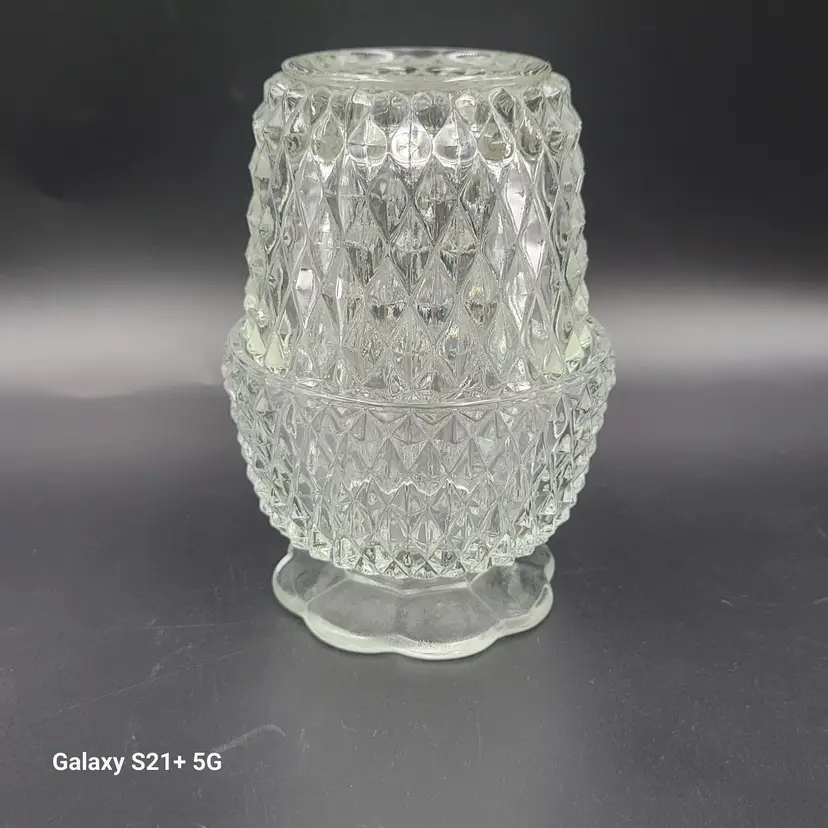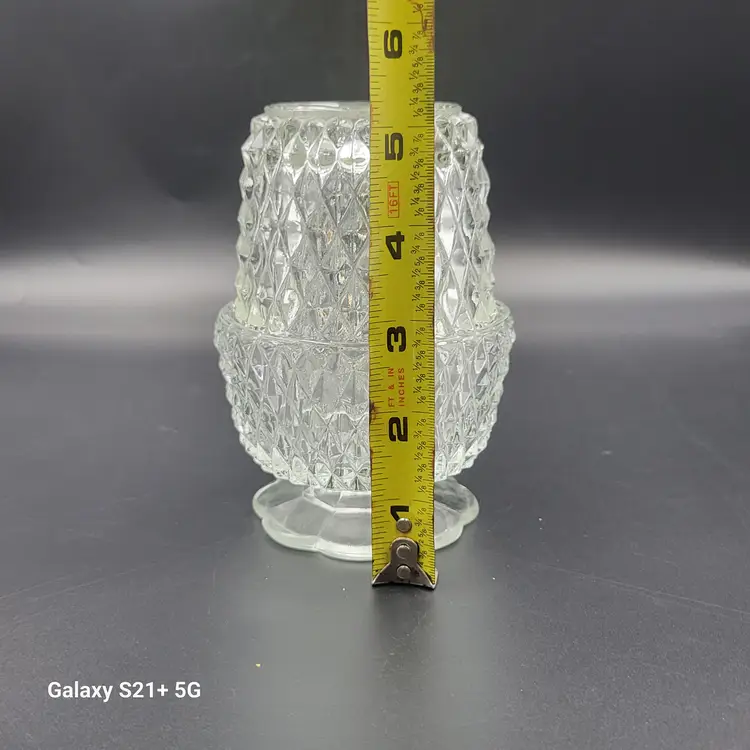 I believe this diamond point, footed clear glass 2-piece fairy lamp was made by Indiana Glass. There are no stickers or maker marks on this.