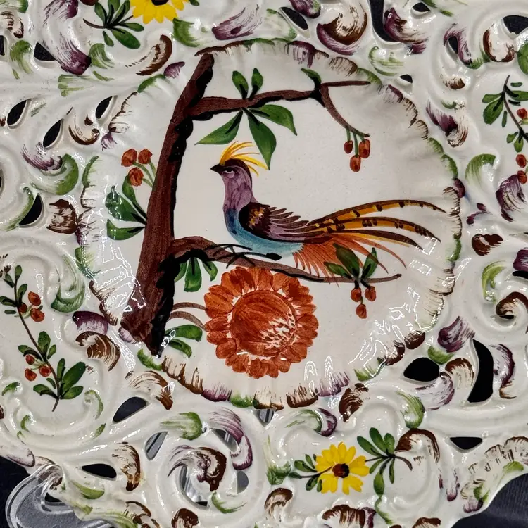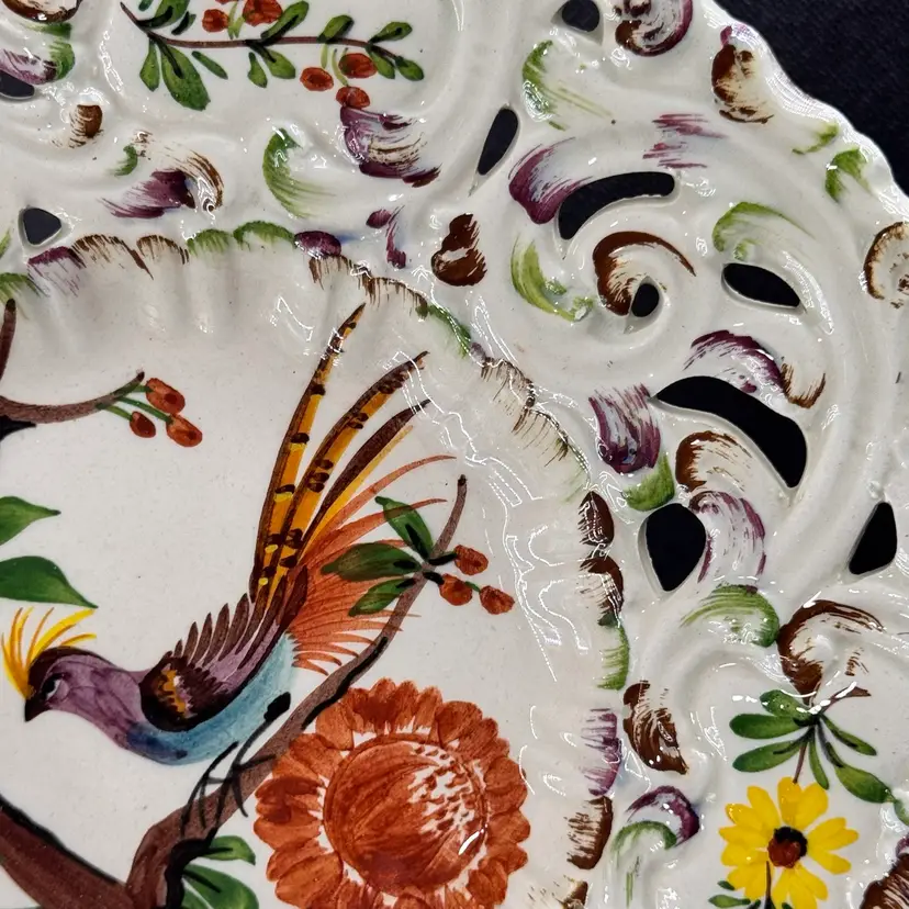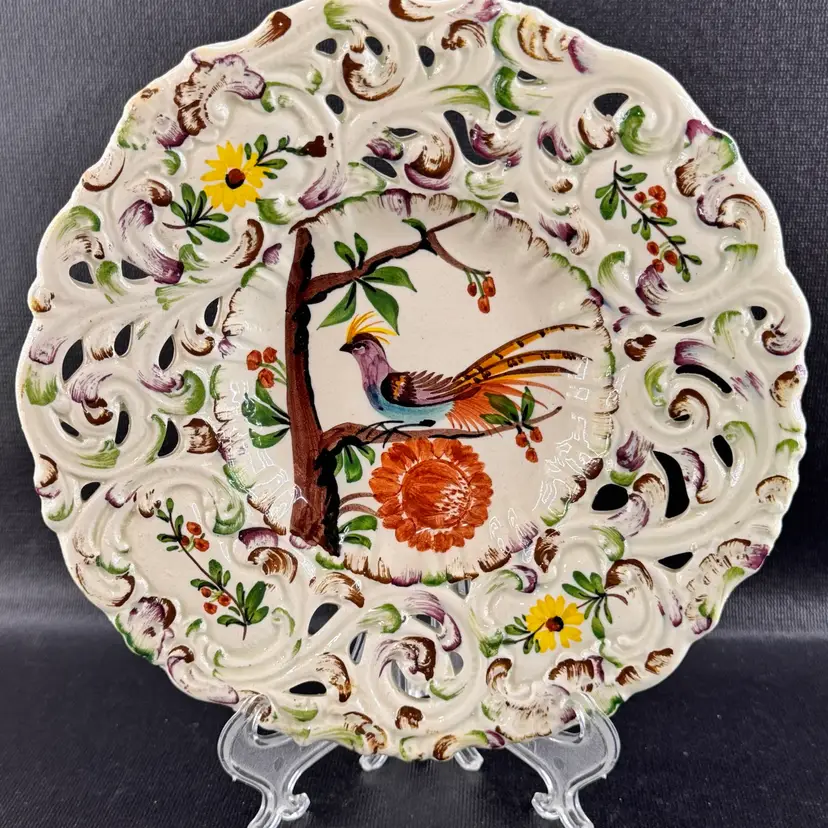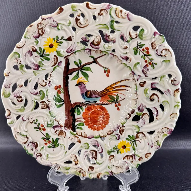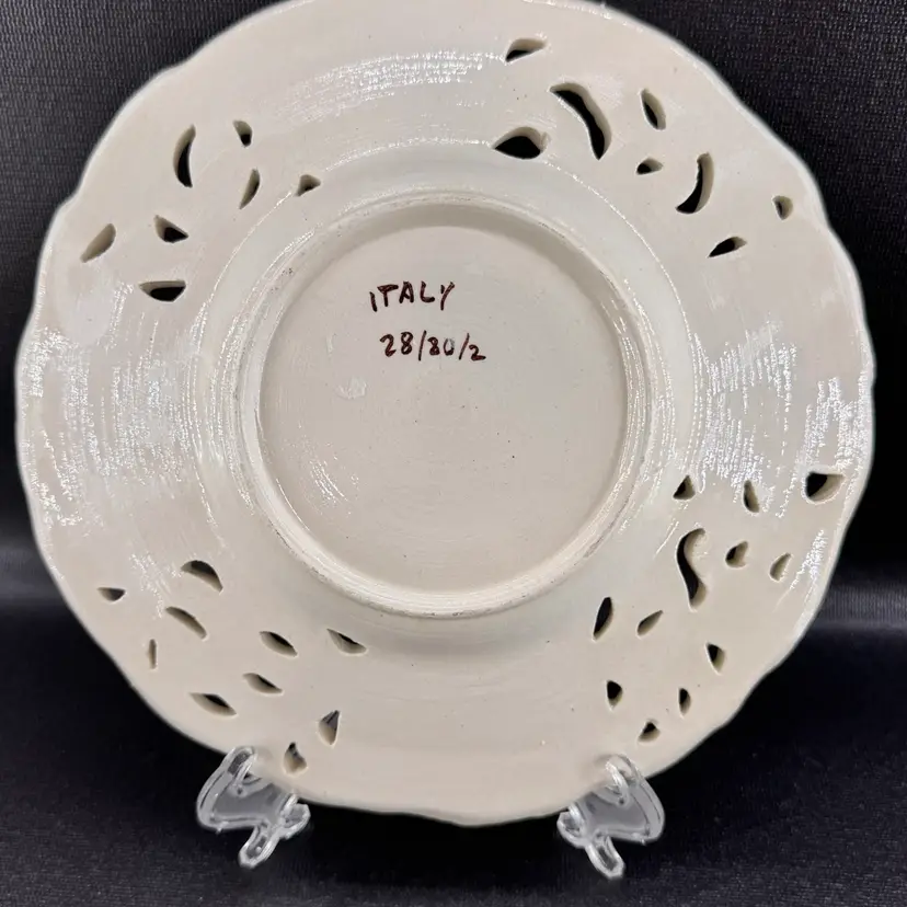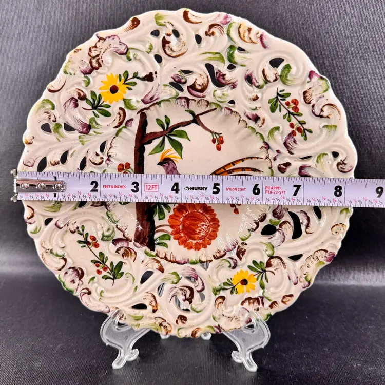 Small chip on the back of plate. Otherwise, in excellent condition. Approximately 8 inches diameter.